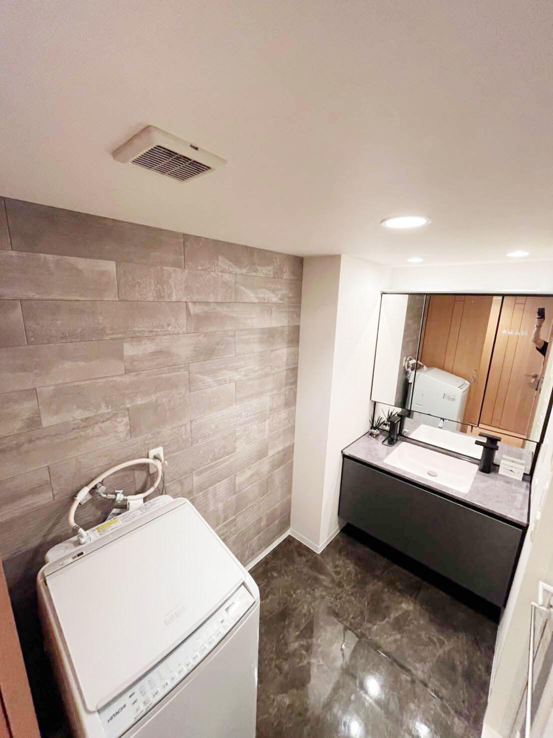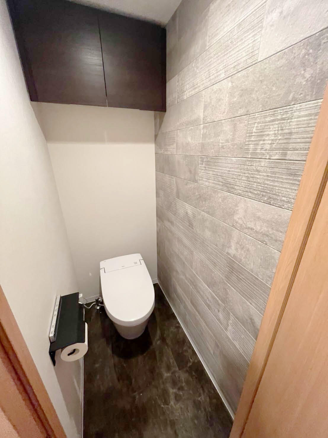 LIXILトイレ サティスSタンクレストイレのサティスS 6グレード ピュアホワイトを採用していただきました。内装は脱衣所ともにサンゲツの壁紙クロスSP2844 床フロアータイルIS1076一面エコカラット ラフセメントを採用しています。