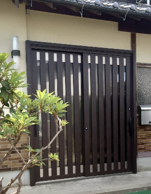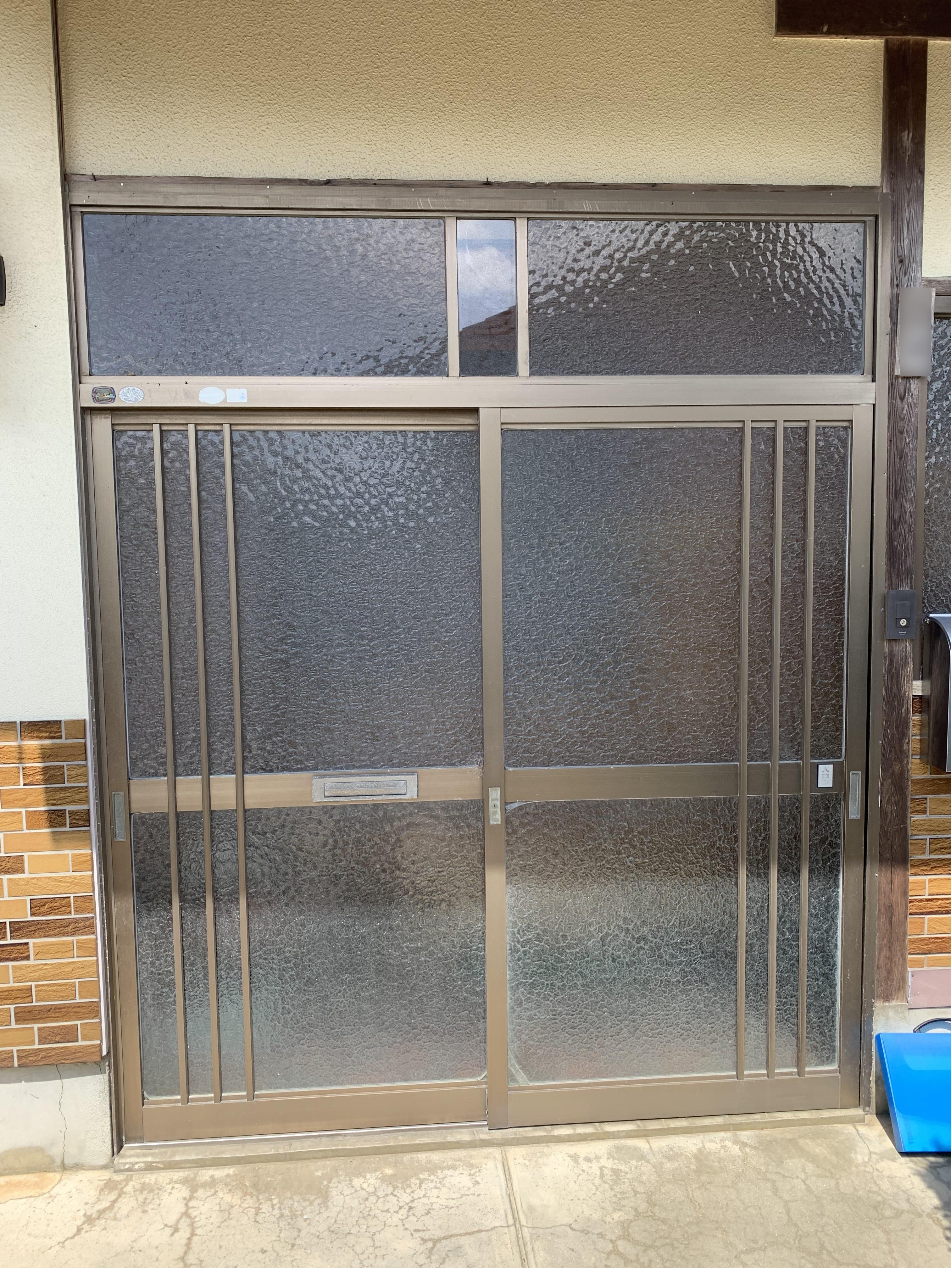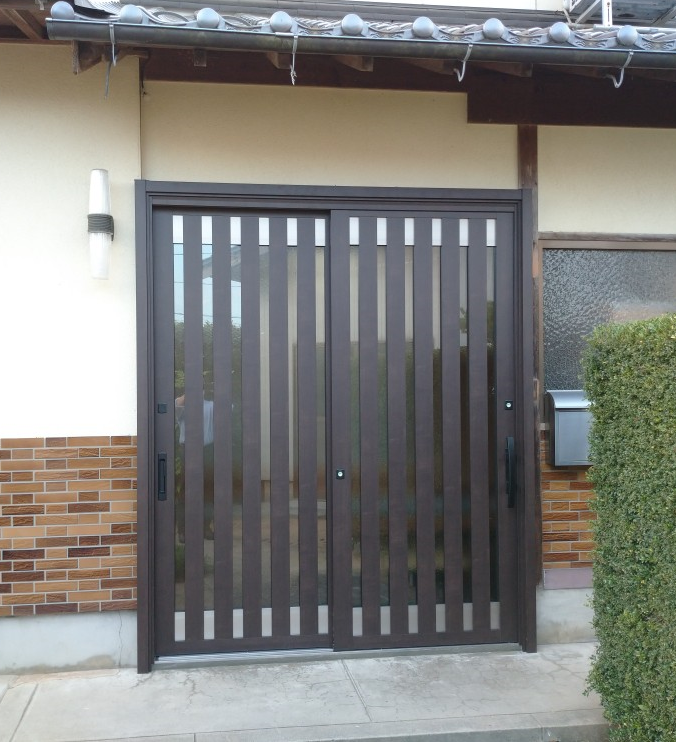 古くなった玄関引戸を新しい玄関引戸に交換しました。 欄間付きの引戸から一枚ものの引戸へ1日でリフォーム! 渋柿調のオシャレな縦格子の玄関引戸に変身しました。