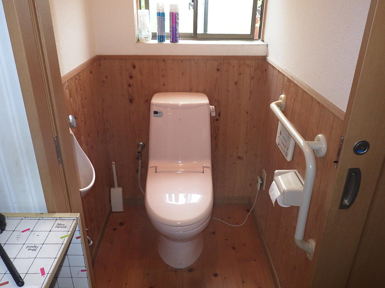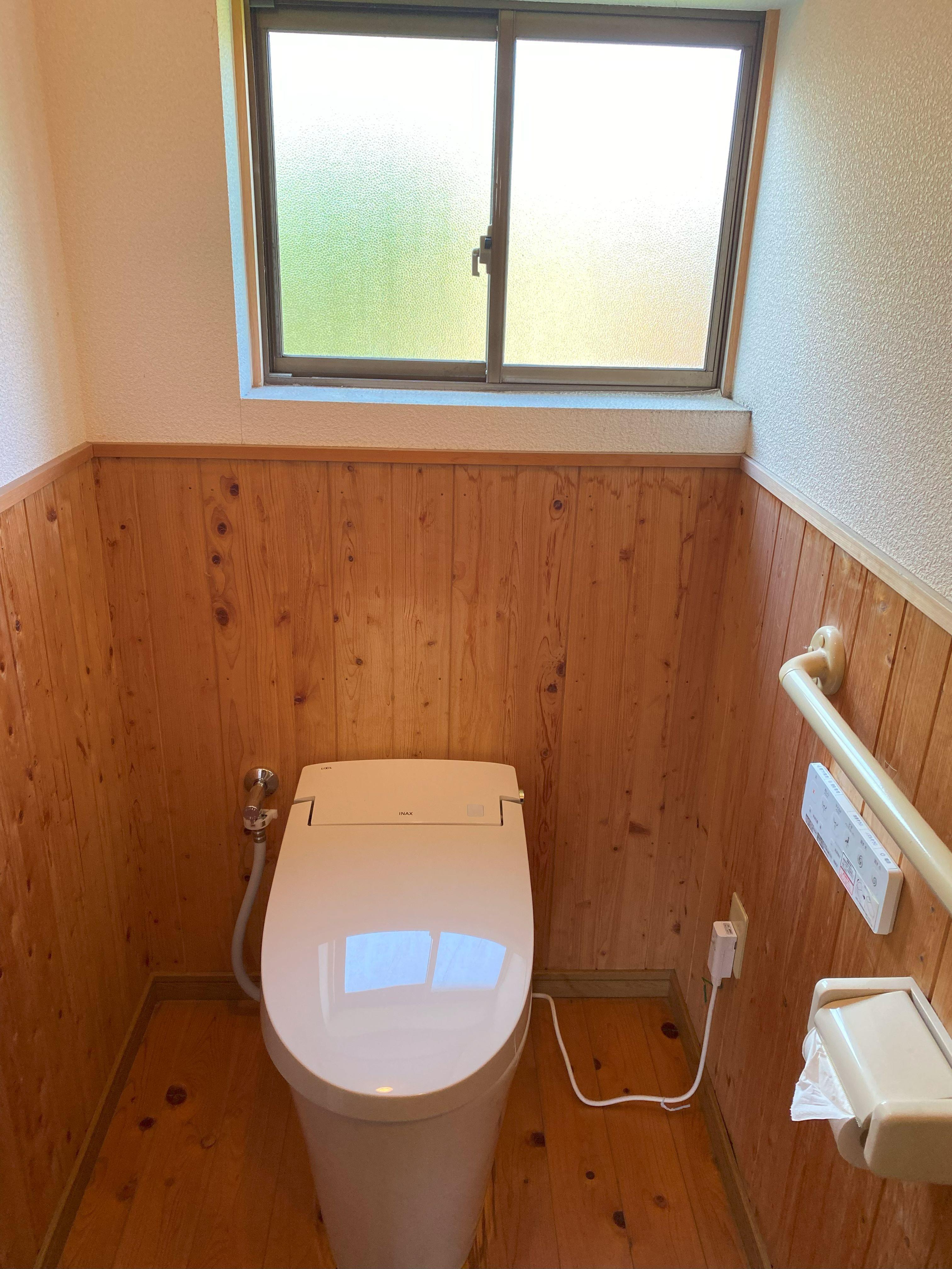古くなったタンク一体型トイレをタンクレストイレ「サティスS」へ変更頂きました。 木目のトイレ空間にピュアホワイトのトイレが映えています♪
