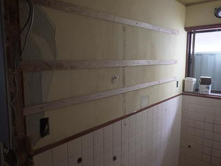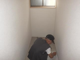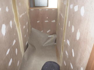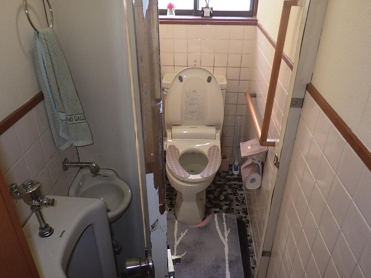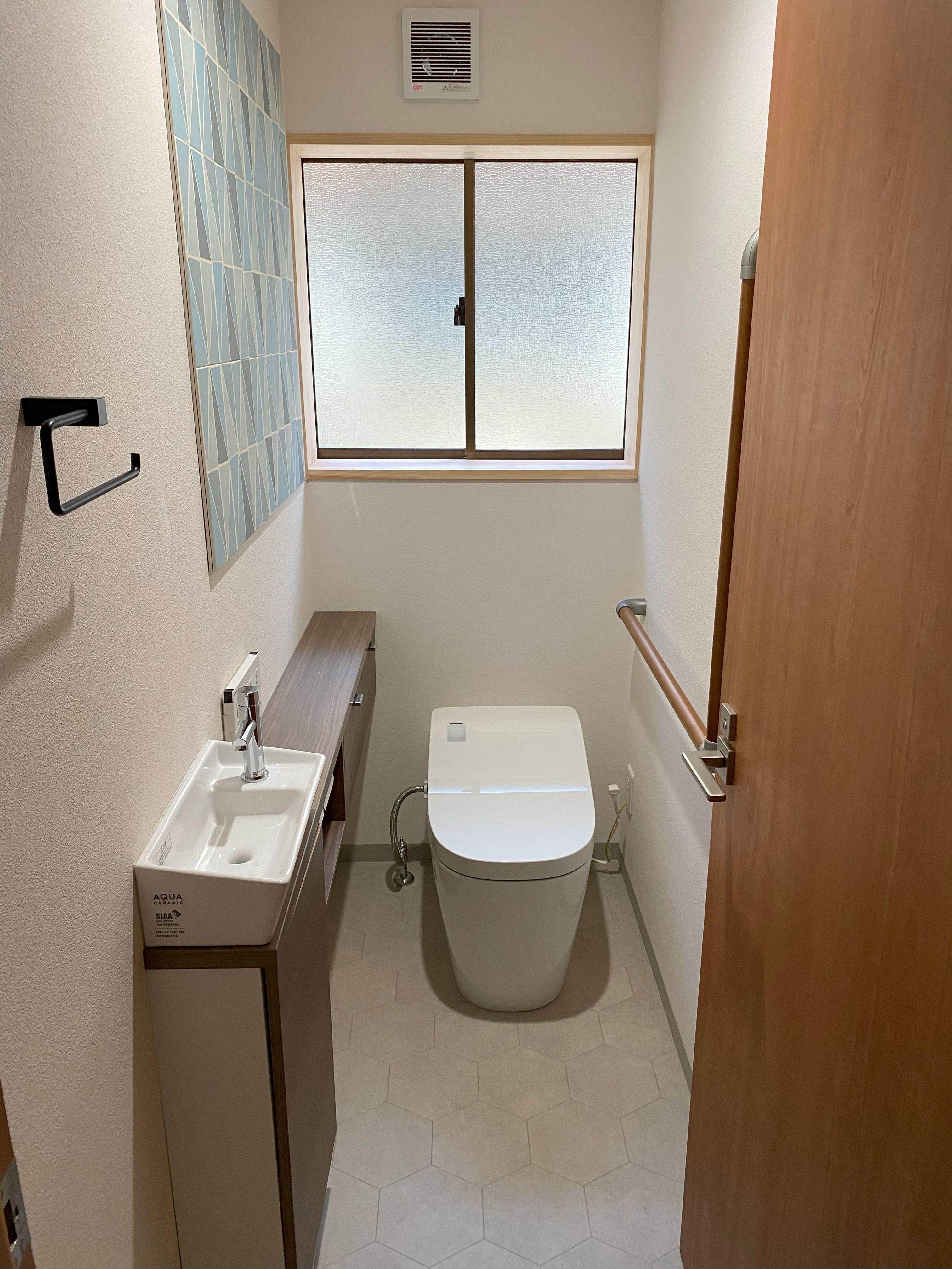 手前に男子便器があり仕切りブースを挟んで洋式便器のある空間改修工事を承りました。短期間工程の為下地は既存タイルから上張りで施工、クロス貼り後にLIXILおすすめのエコカラットプラスを設置しました。エコカラットは生活臭の脱臭効果や湿度を快適に保ってくれる調湿効果があり今回設置頂きました。単調になりがちなトイレ内のアクセントにもなり素敵な空間に仕上がりました♪また、もともと入口から10㎝程度の段差もありましたが今回お施主様からのご要望で入口からの段差もなくしたいとのことで段差解消しております。