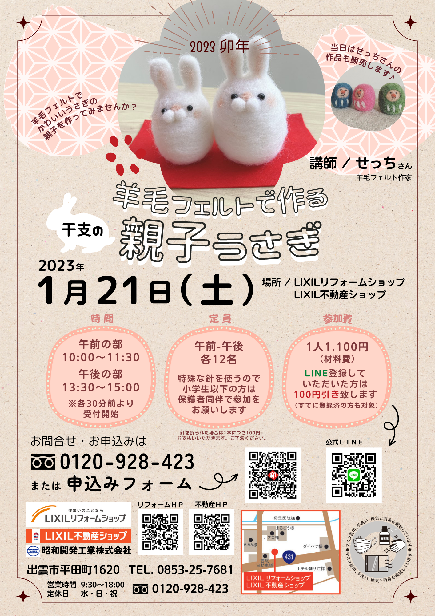 1月21日(土)イベント『羊毛フェルトで作る 干支の親子うさぎ』開催!