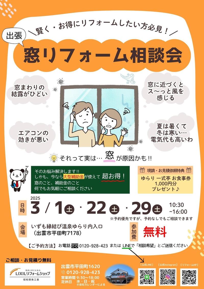 3月1日(土)・22日(土)・29日(土)『窓リフォーム相談会』開催!!