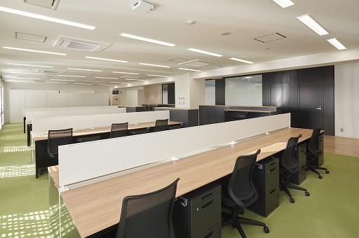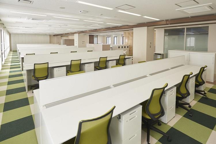 オフィス全体はポップで明るい感じをイメージし、フロアタイルをグリーンのチェックに。