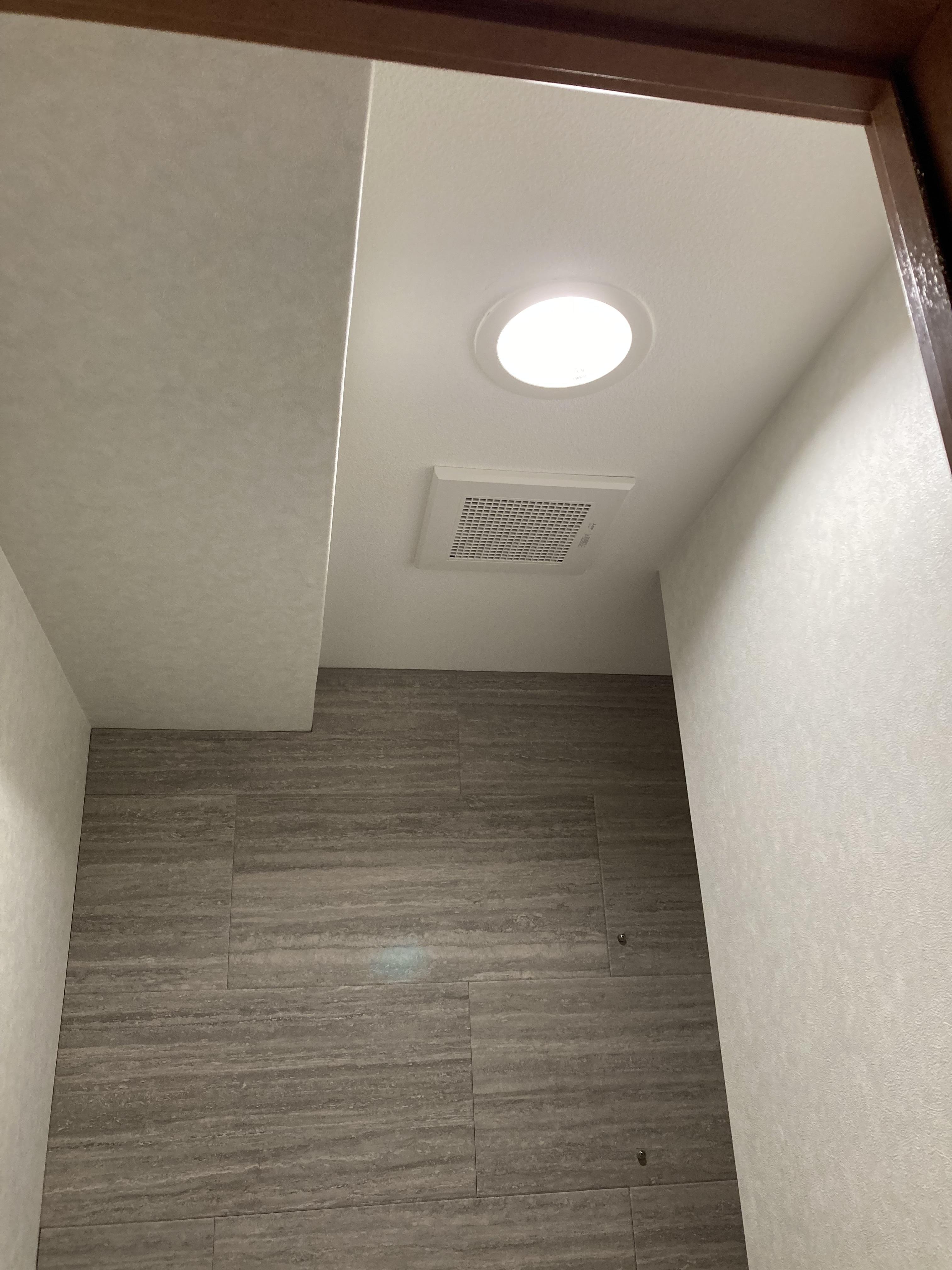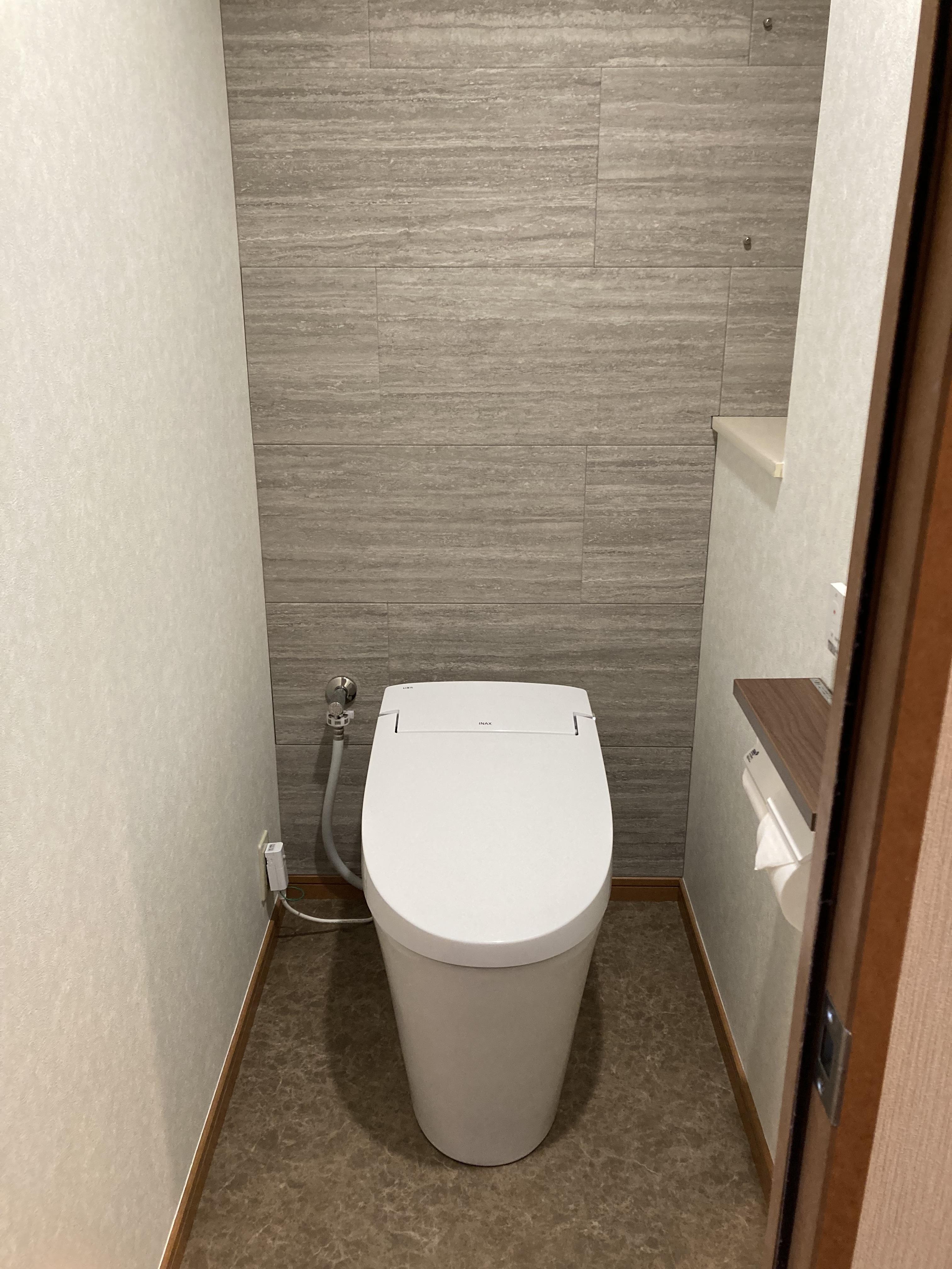 トイレの温水便座から水漏れが起きていましたので、これを機にトイレをまるっと新しくされました。 奥の壁面に、調湿・脱臭効果のあるエコカラットタイルを貼り、その色味が引き立つような壁紙や照明を選びました。まるでホテルのトイレのような高級感のある空間になりました。