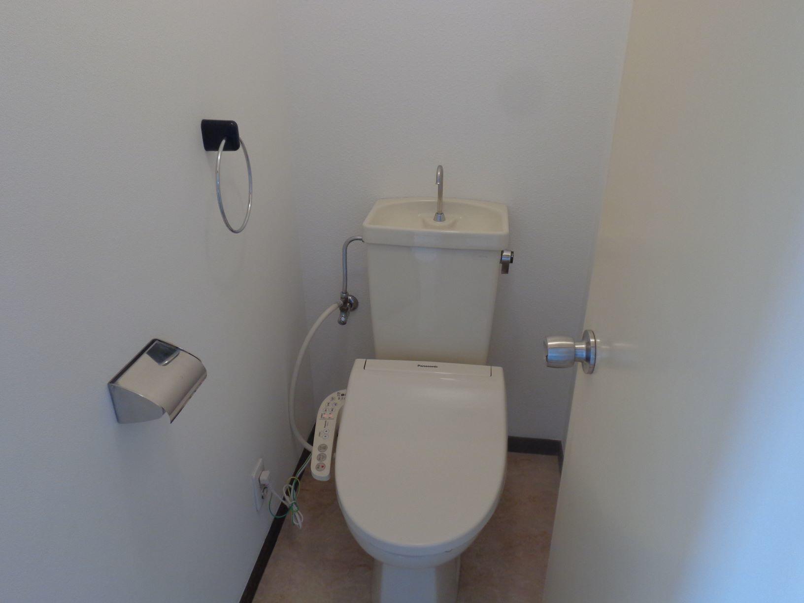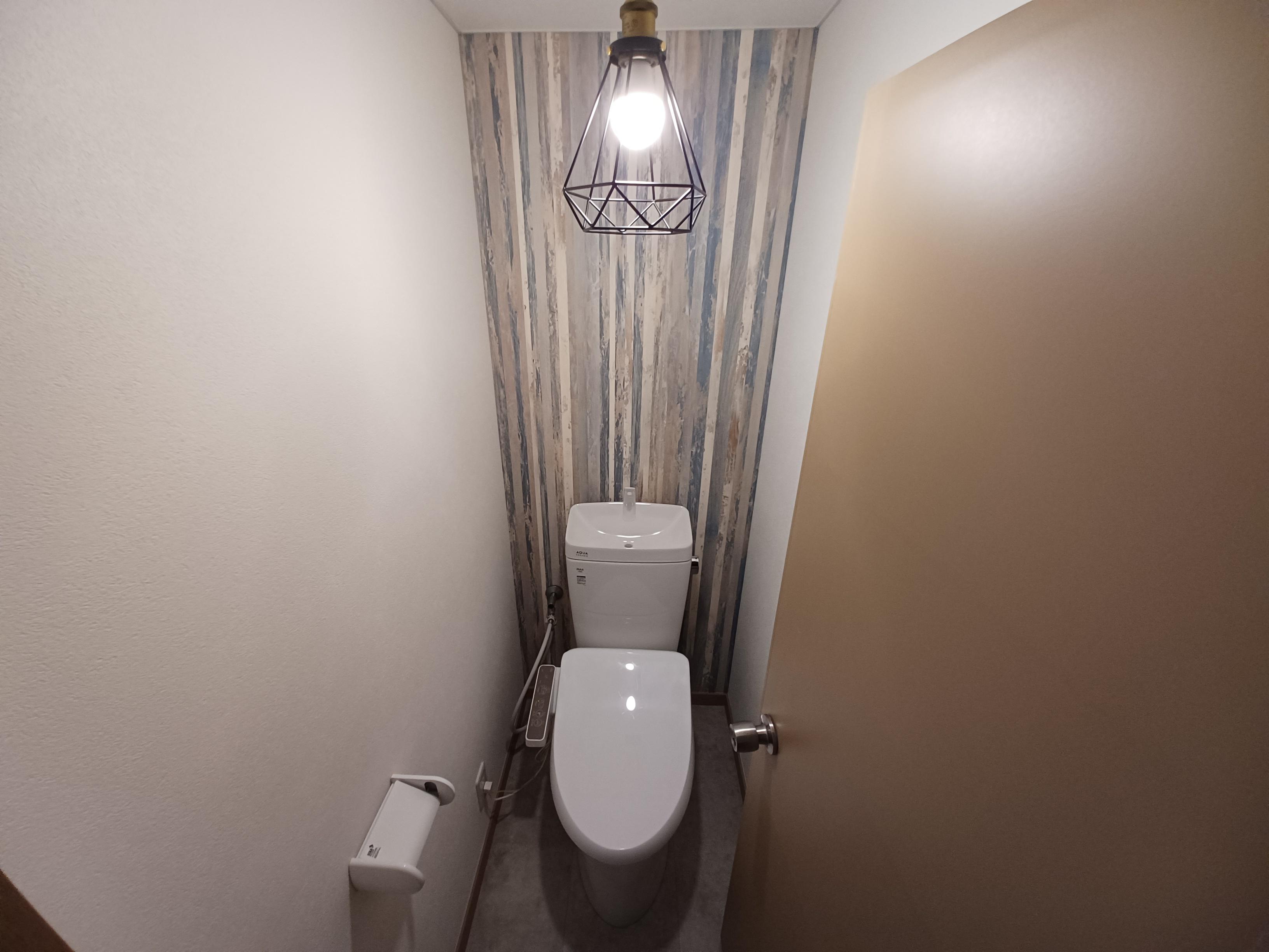 アパート1室をフルリフォームしました。 INAXのアメージュZ便器へ交換。電球、アクセントクロスも変えてシックな雰囲気に仕上がりました。