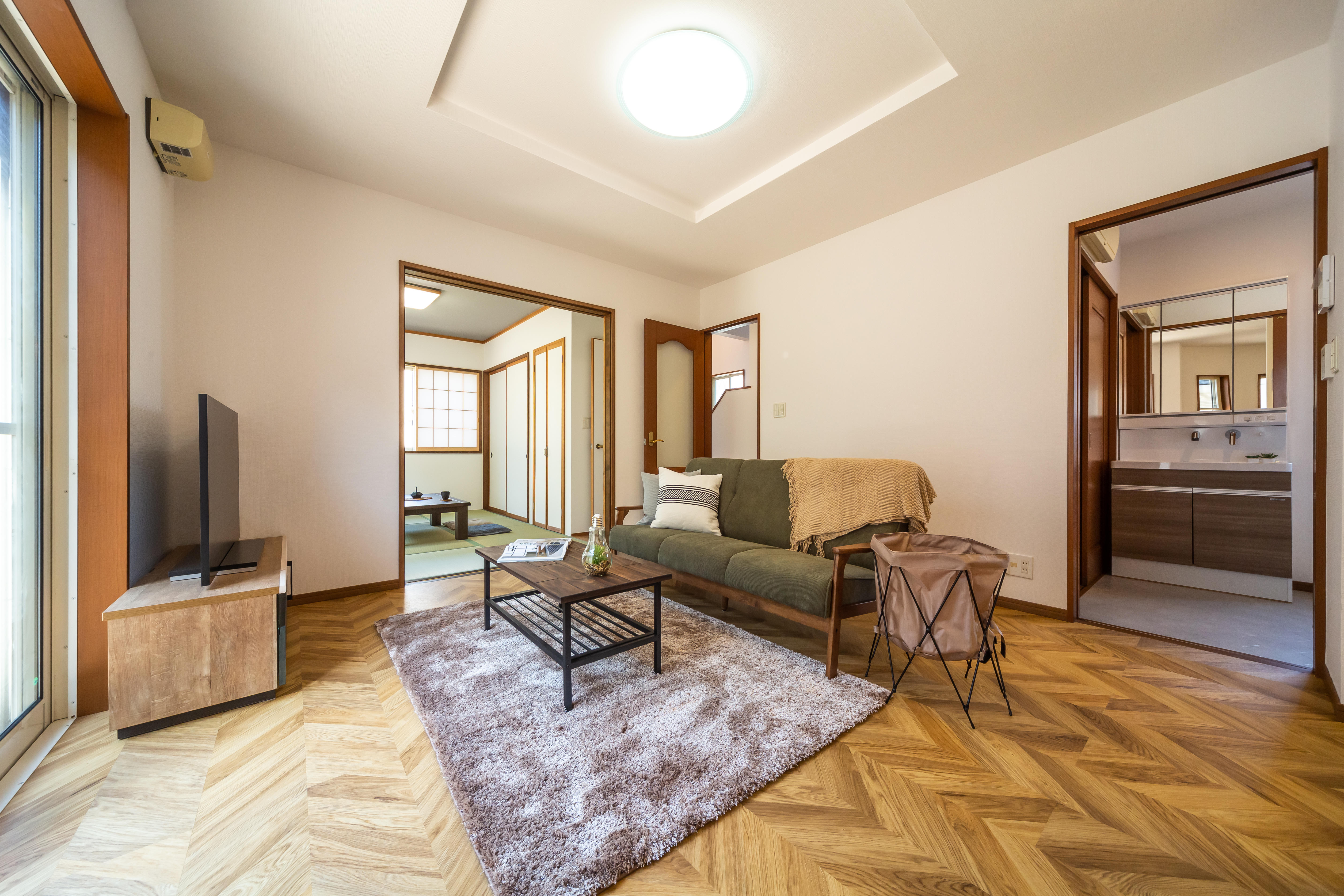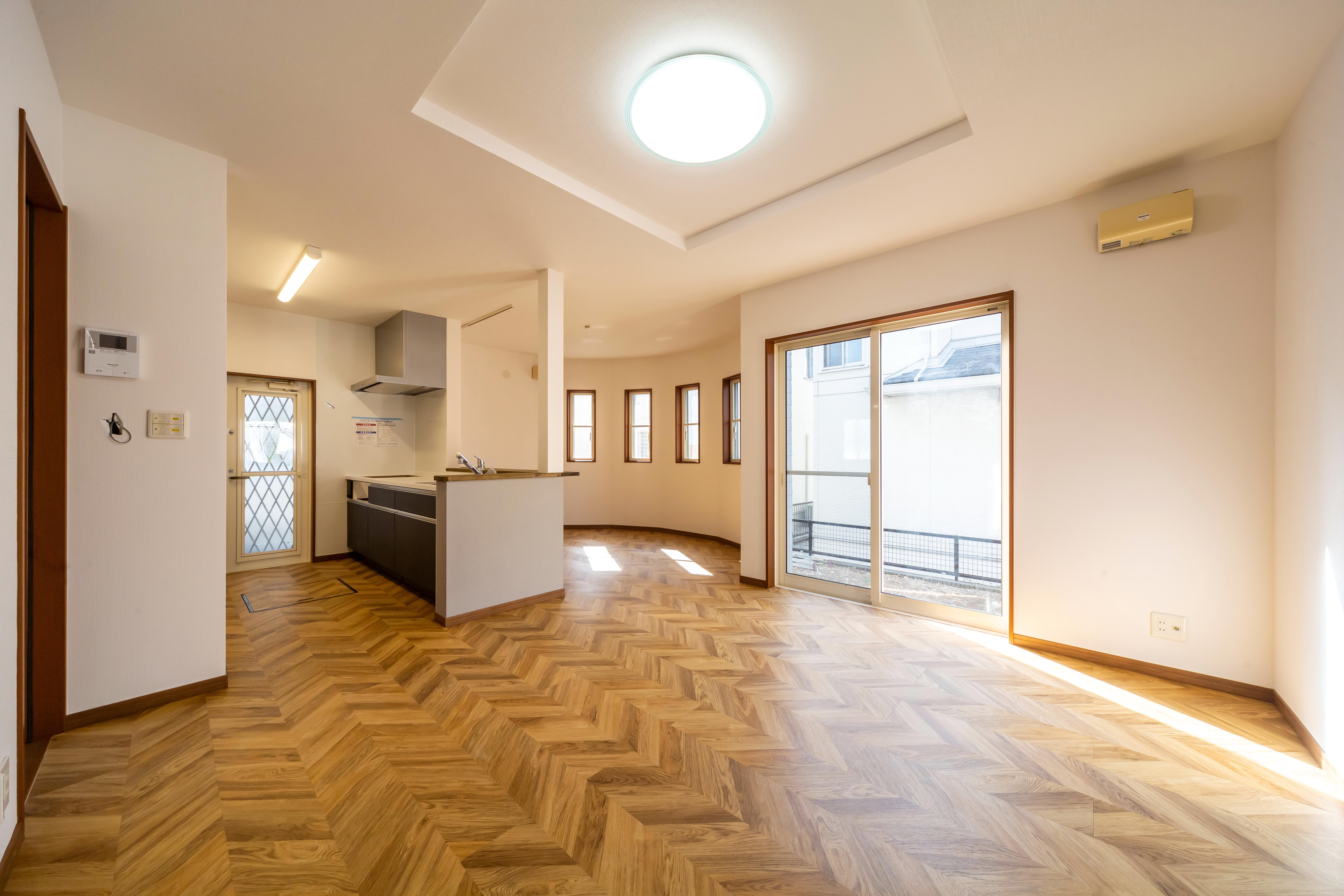 リビングダイニングキッチンは床をフレンチヘリンボーンに張り替え、ヨーロピアンなテイストのヴィンテージスタイルになりました。 外観はグレーに塗装し、上品に仕上がりました。