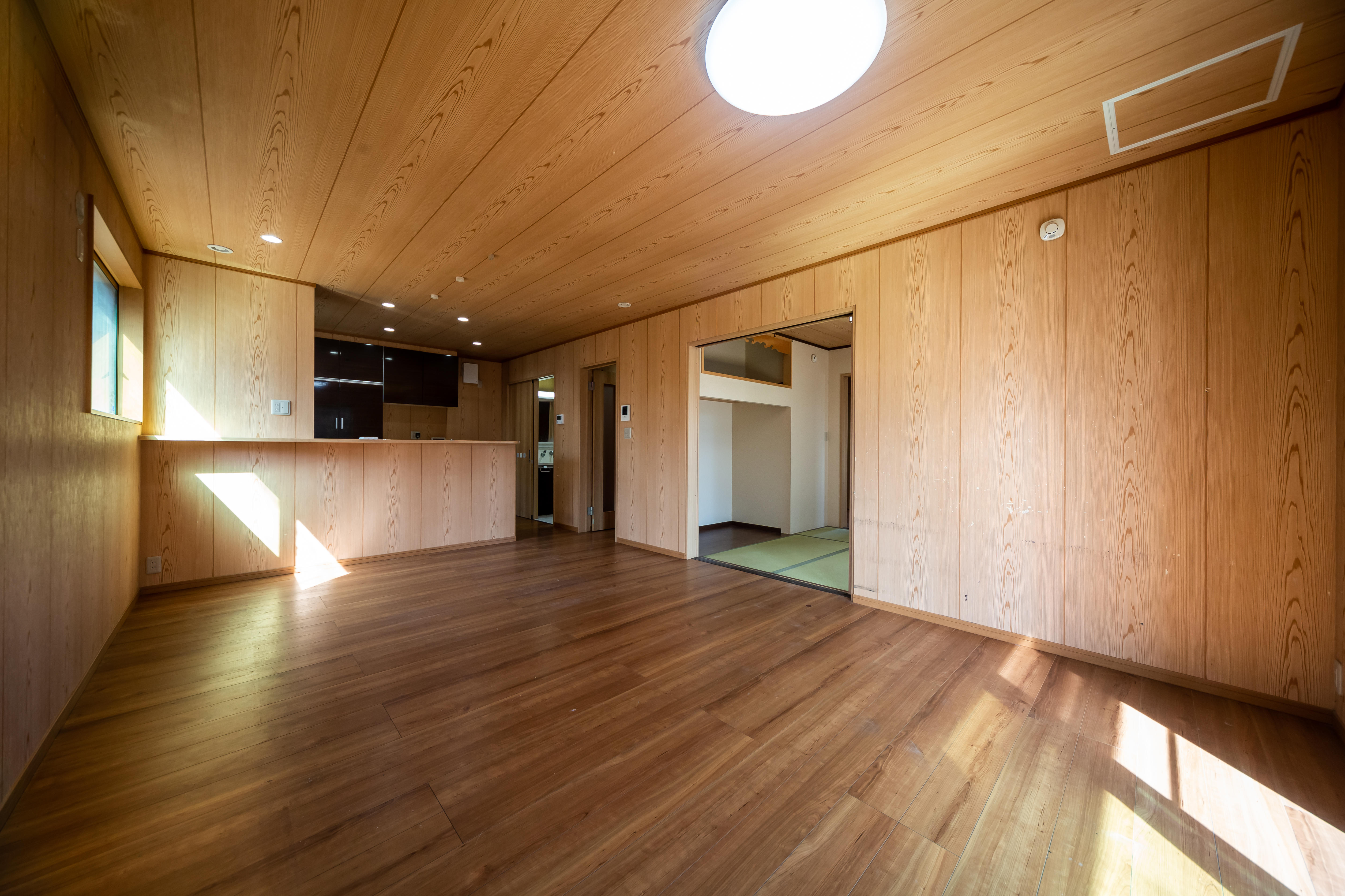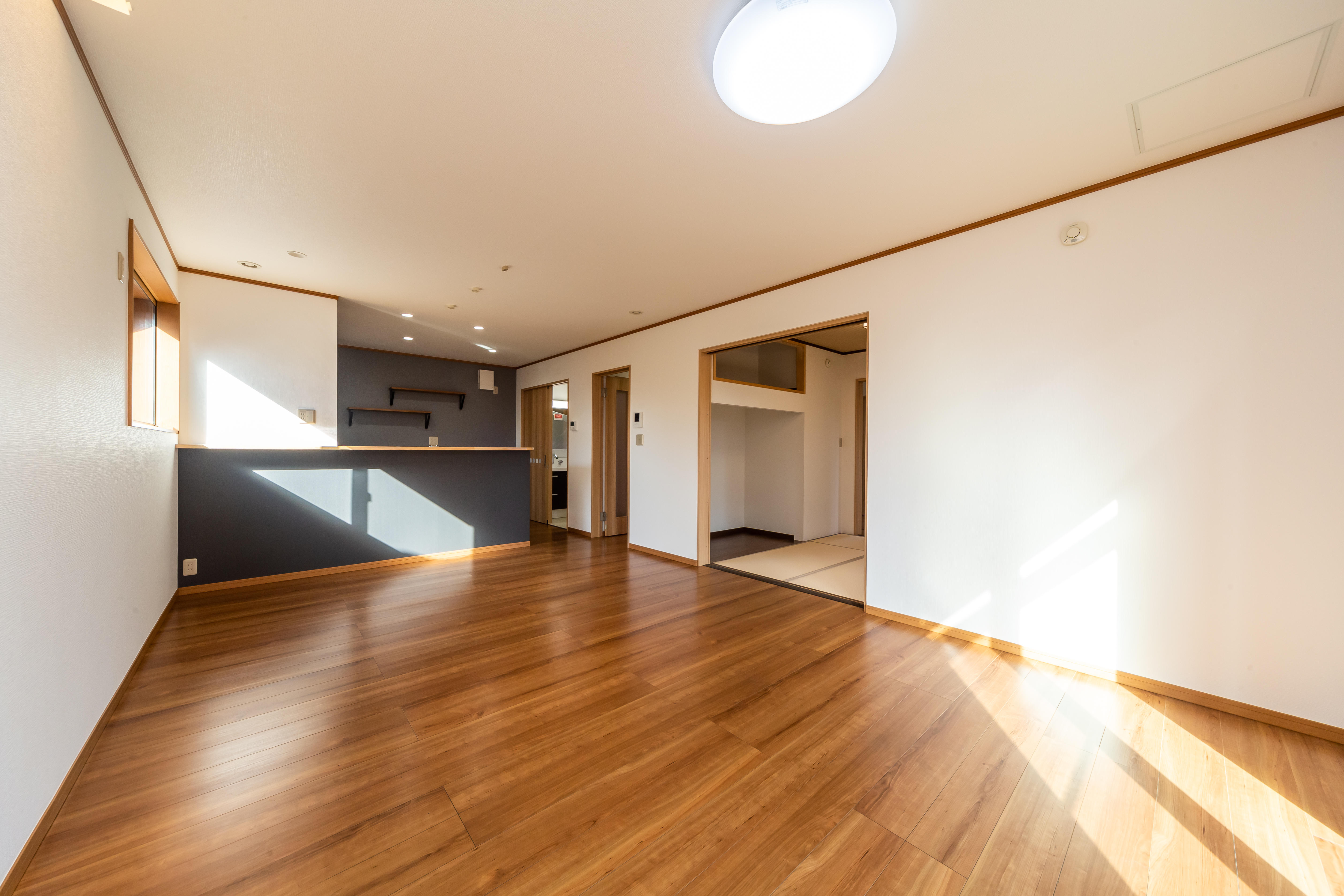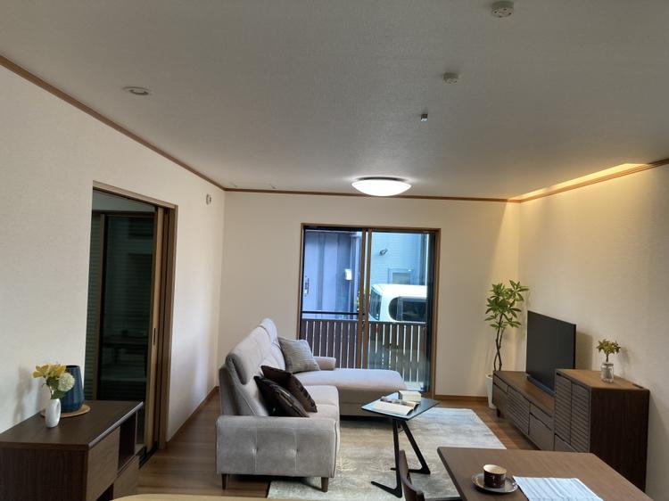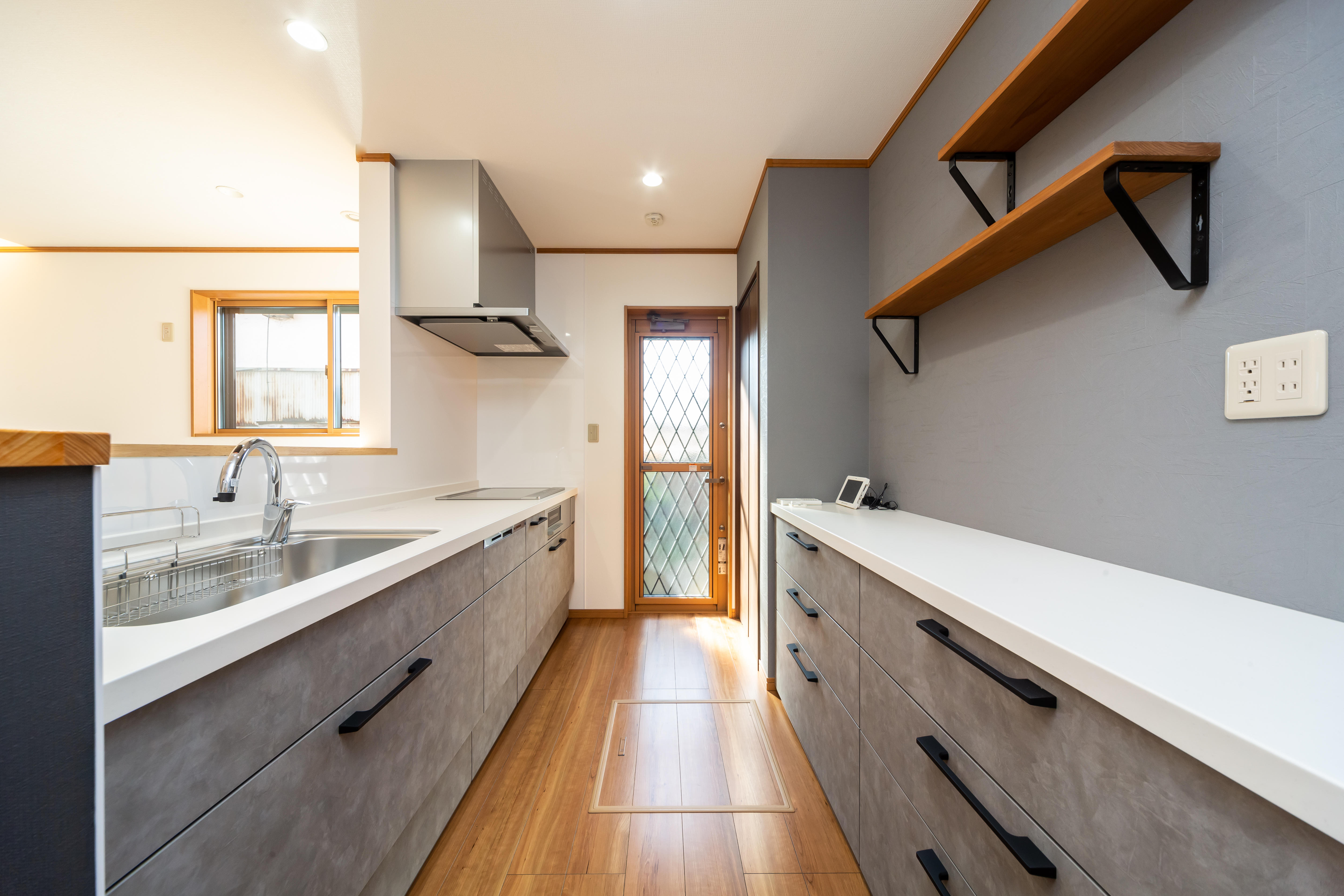 木の壁をクロスにすることで明るいLDKになりました。 キッチンにグレーのアクセントクロスを使い、スタイリッシュな印象になりました。