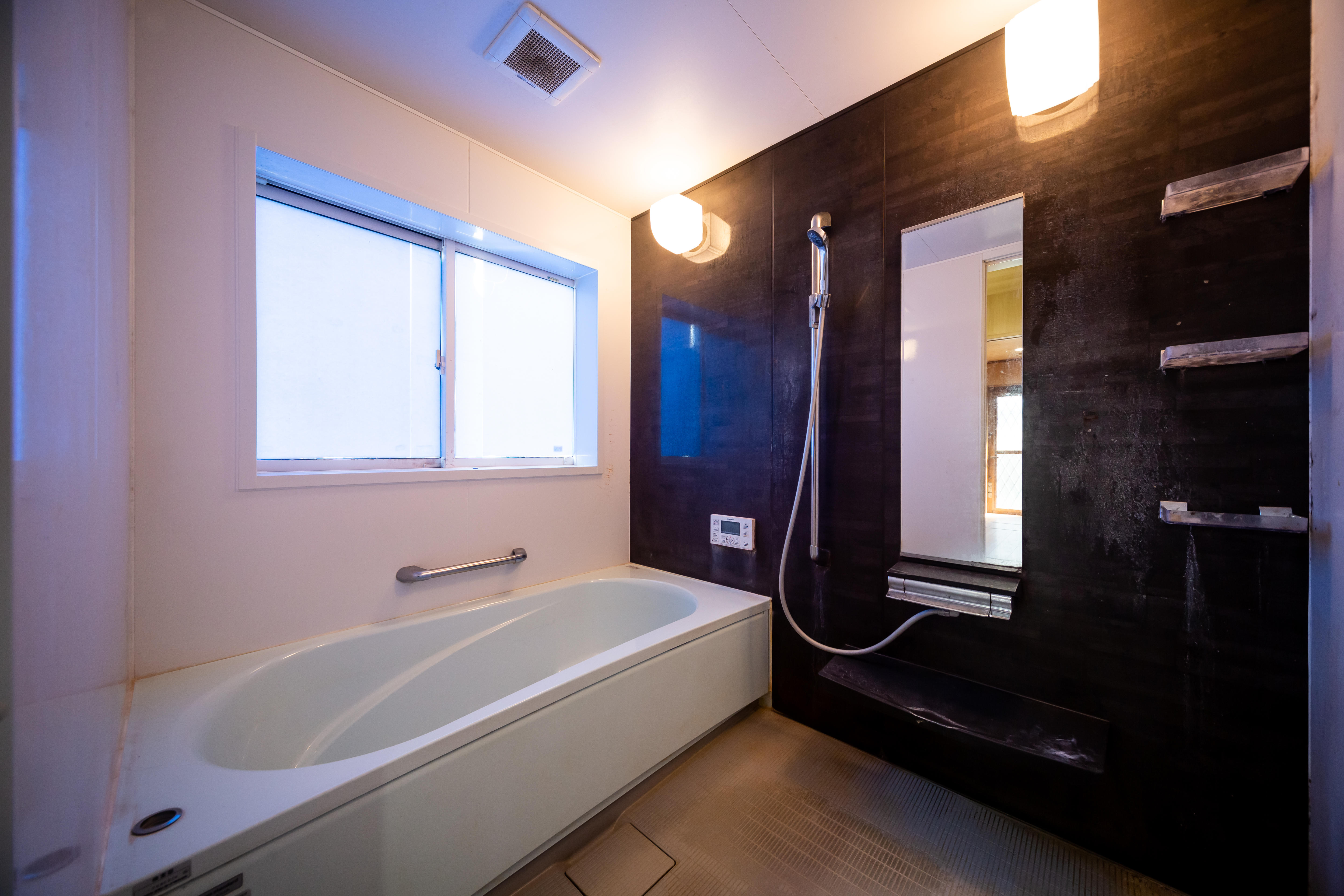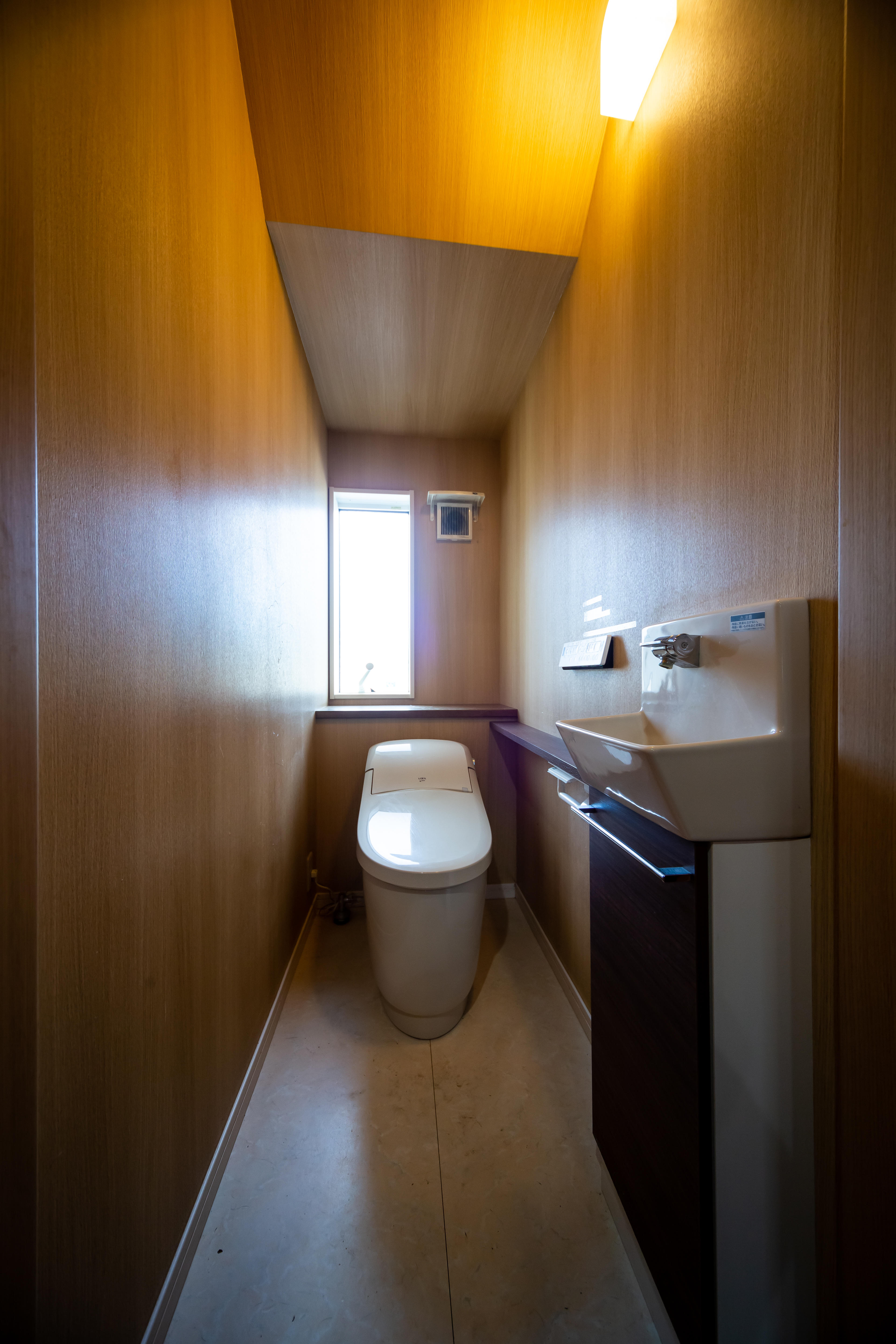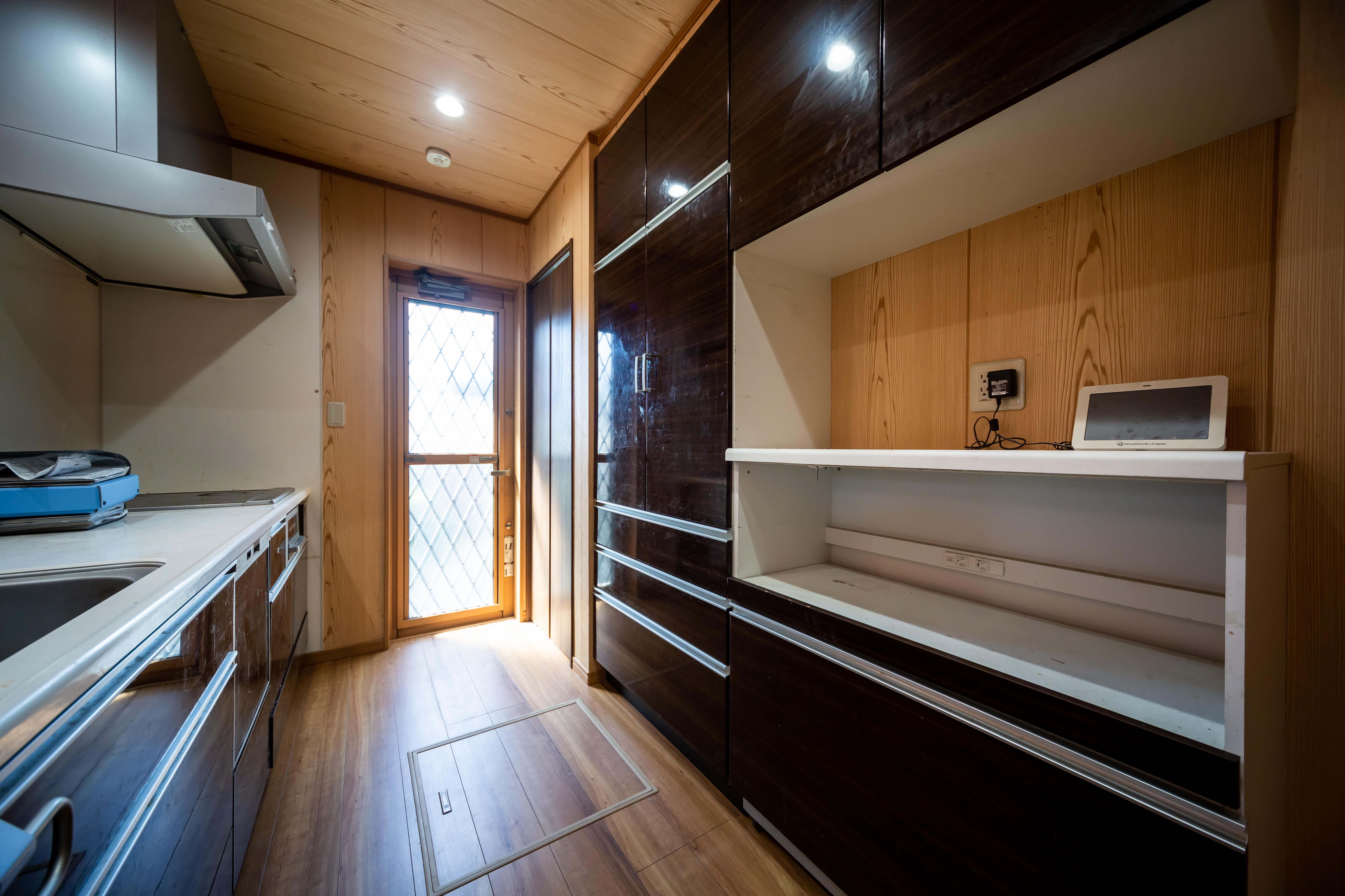 木の壁をクロスにすることで明るいLDKになりました。 キッチンにグレーのアクセントクロスを使い、スタイリッシュな印象になりました。