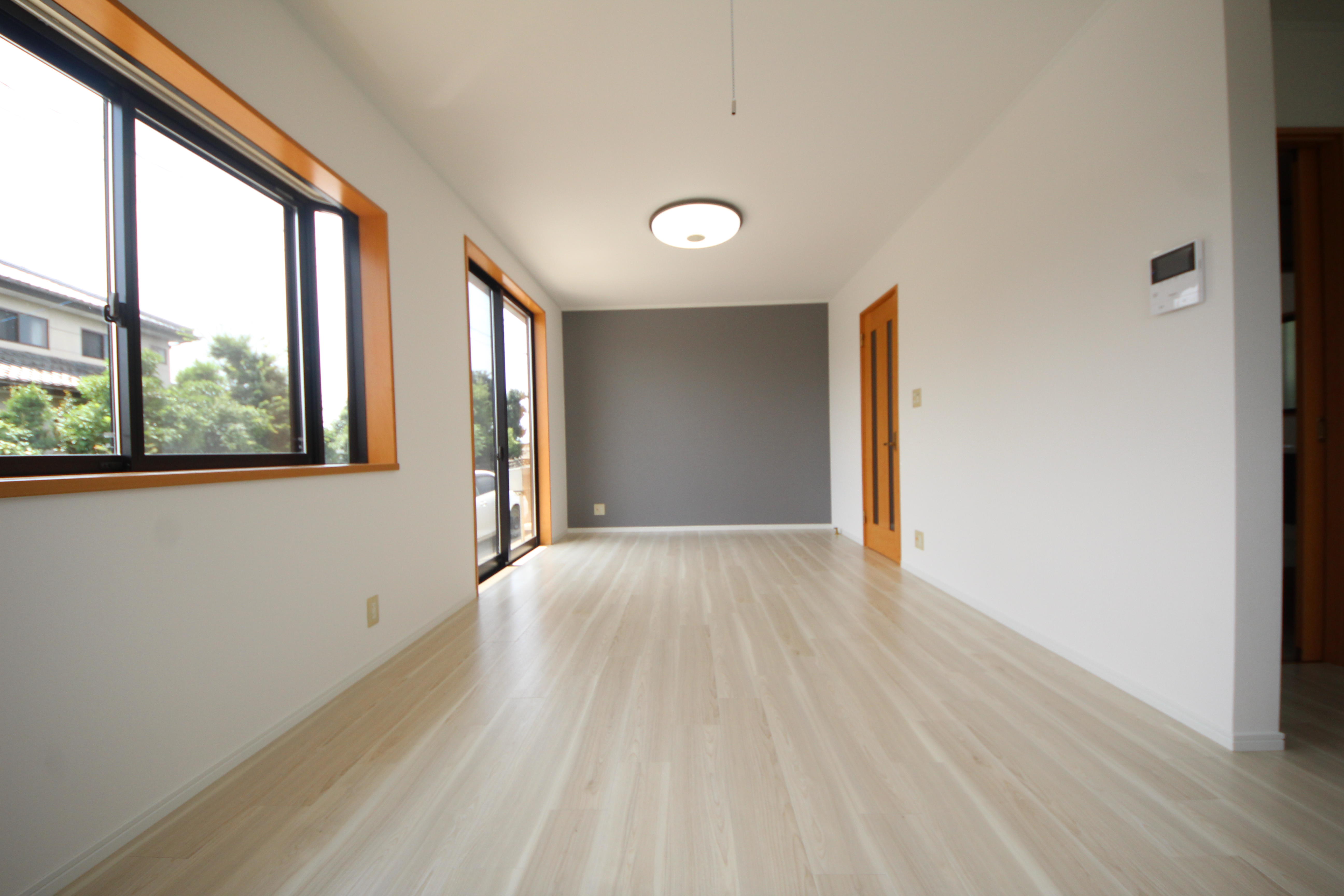 前橋市 グレーのアクセントクロスに既存の木目を生かして落ち着きのあるインテリアに