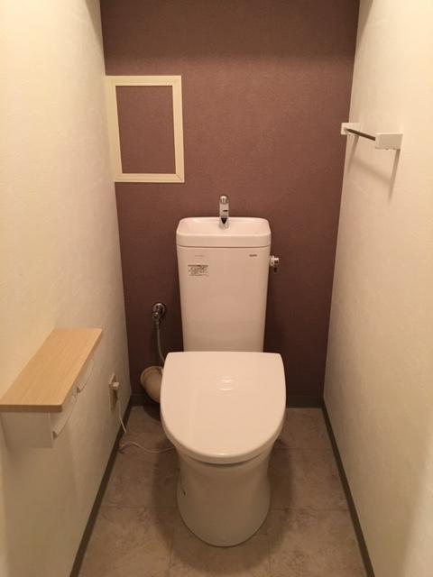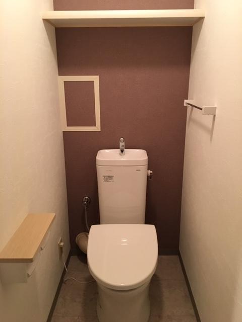 シンプルながら使いやすさ・お掃除のしやすさを考えてのリフォームです。 背面に棚を取り付けて ペーパーホルダー上にも棚があり収納も便利になりました。 カラーもシンプルにまとまっています。