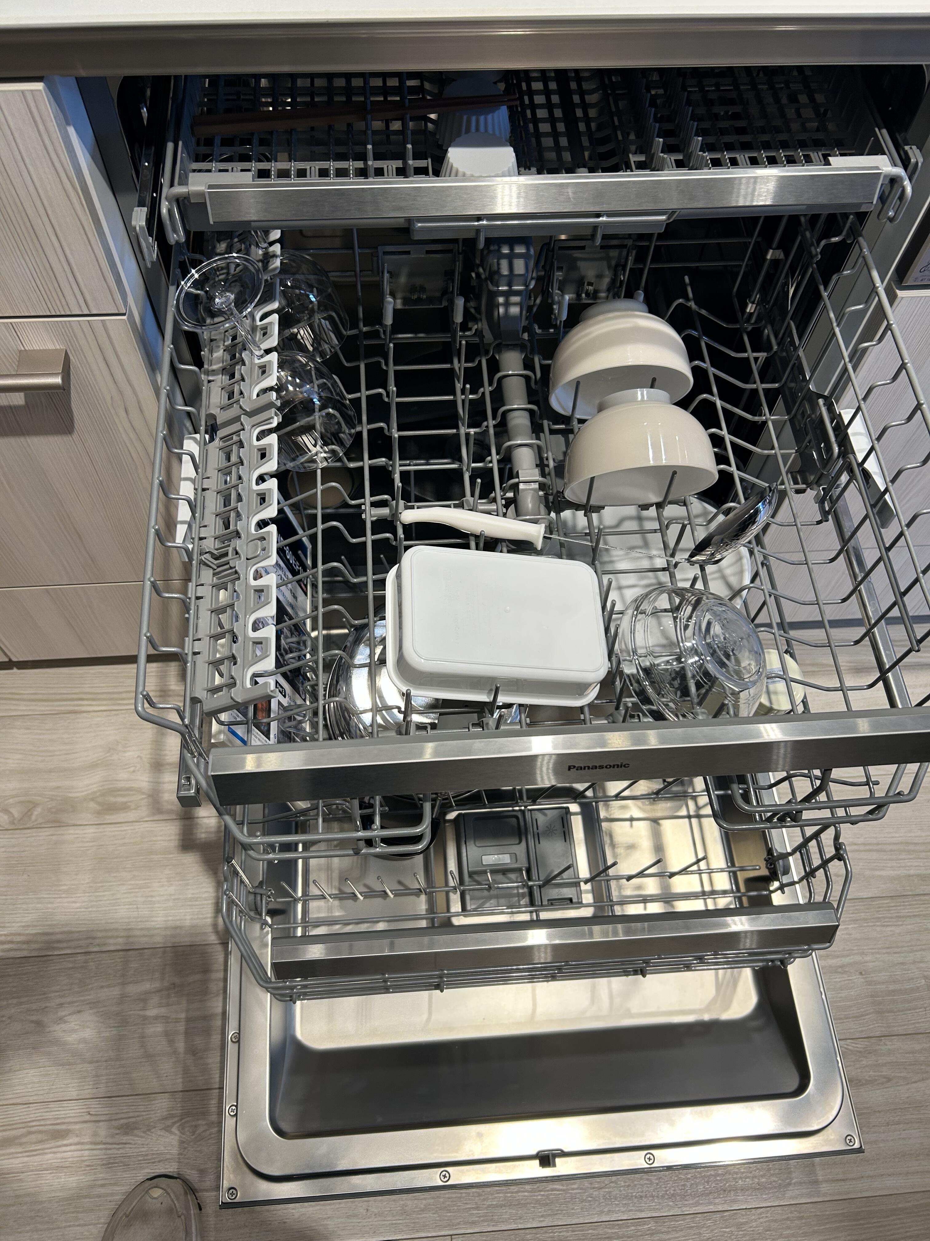 フロントオープンタイプ食洗機は大容量ですので、ご家族の多いお宅でも、少人数のご家族でも1日分の洗いものを一気に洗える優れたタイプ。一気に洗うと家事ラクもでき節水にもなりそうですね。