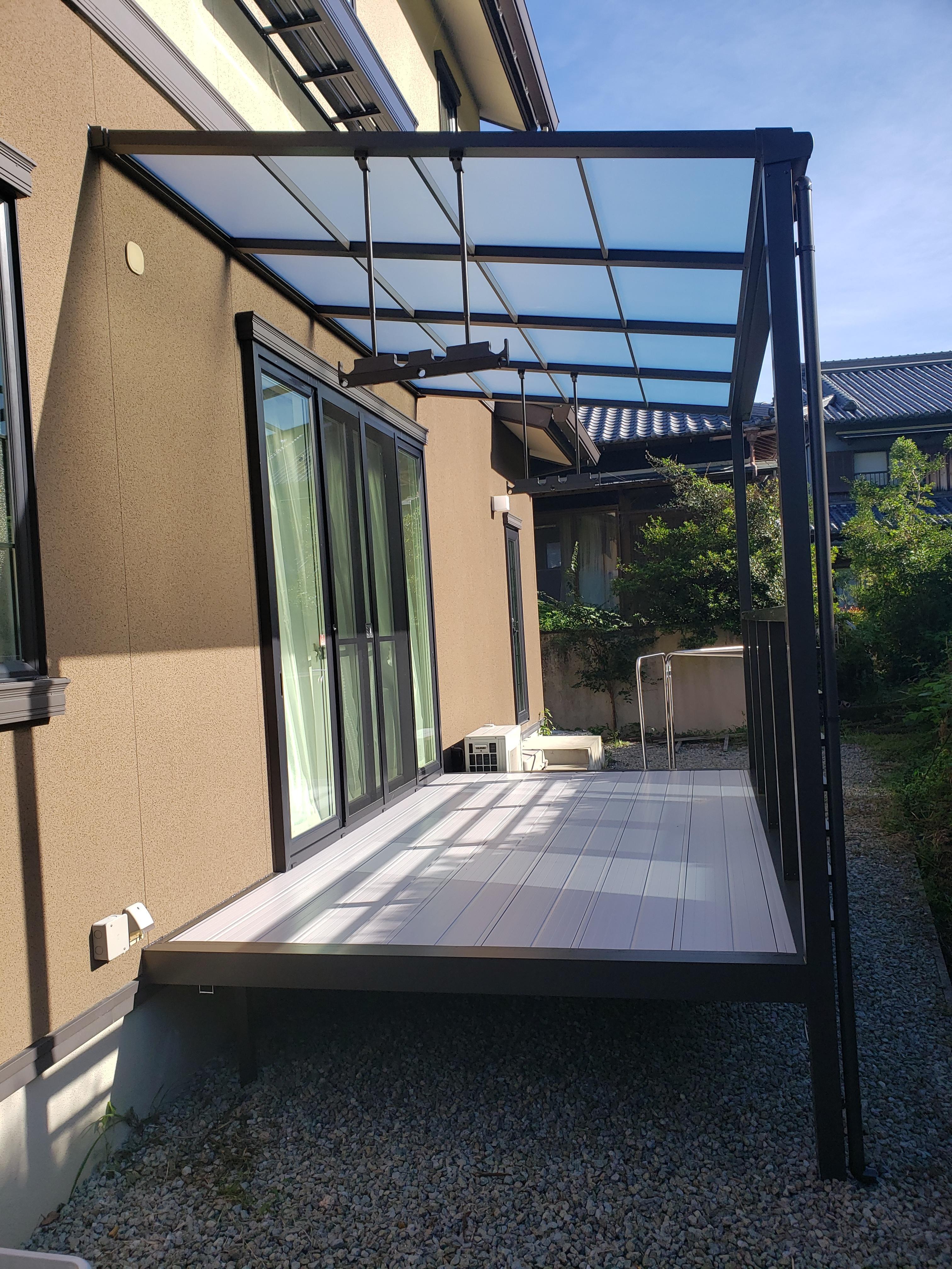 洗濯物干しとして使用できる、ガーデンテラス。LIXILサニージュをご採用いただきました。 リビングルームの掃出し窓から、差し込む明るさと遮熱を調整してくれます。雨や風除けとしても、物干しスペースとしても使用でき、お庭ライフを満喫できることでしょう。