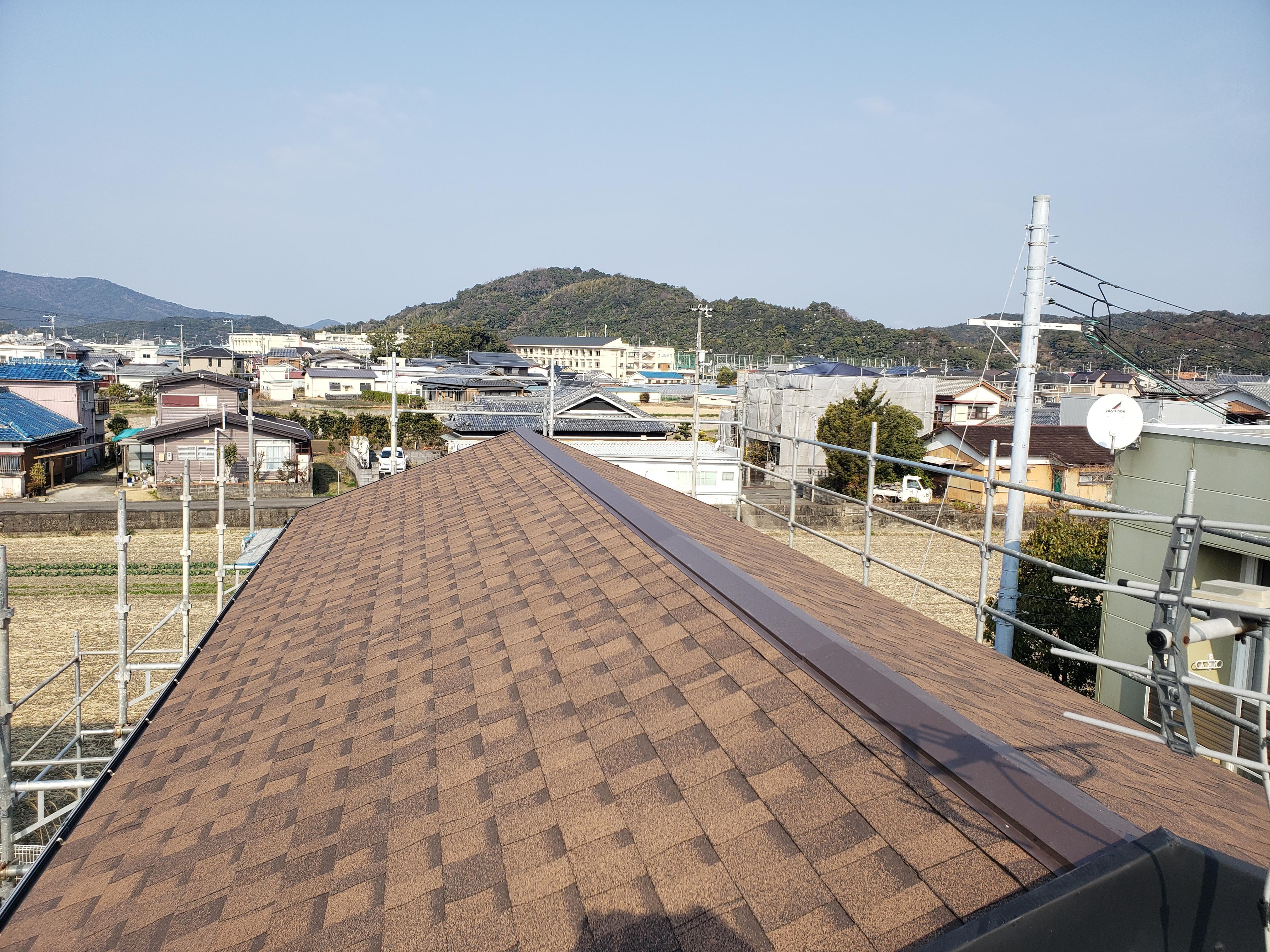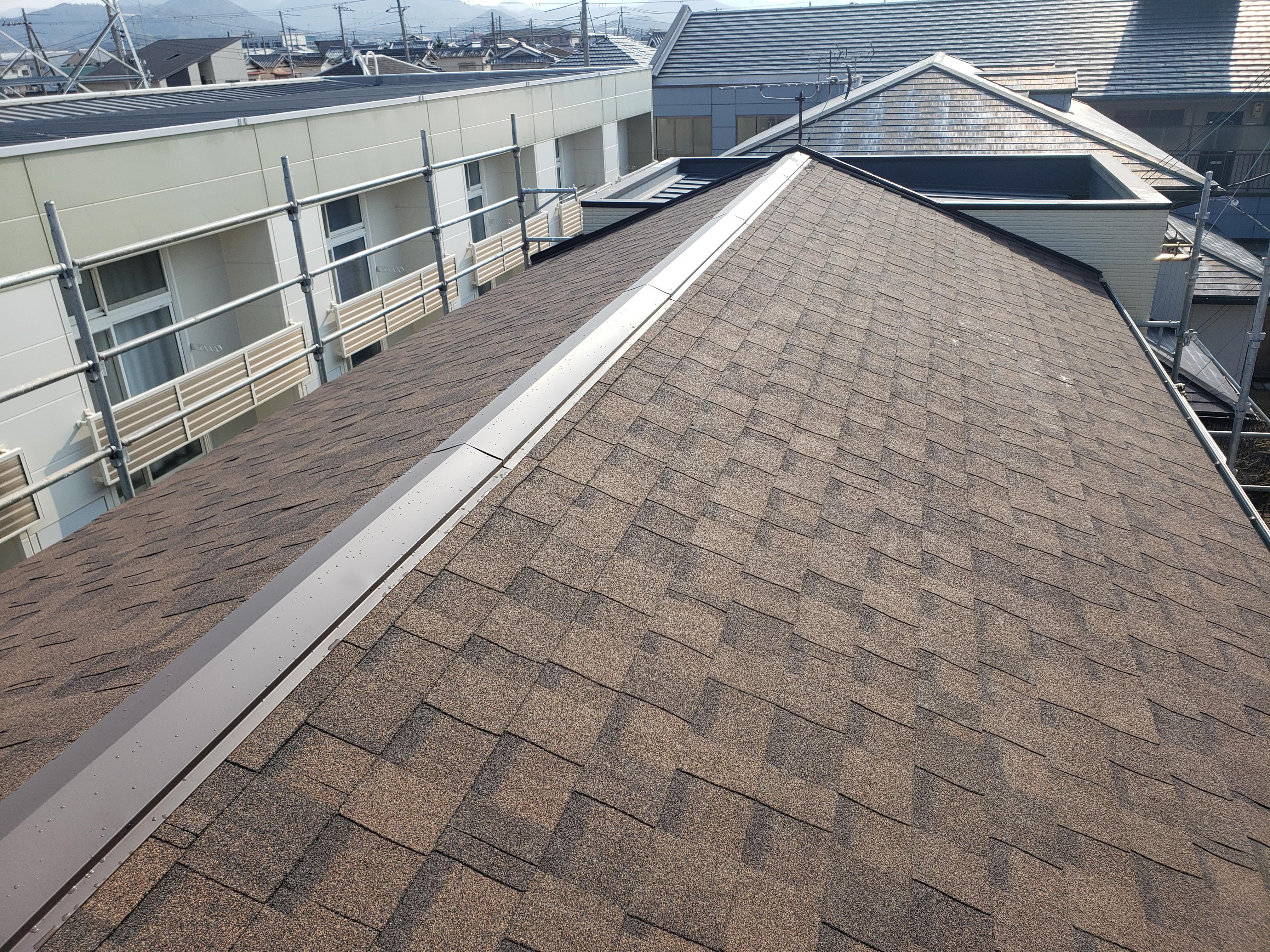 新しく貼った屋根材は、洋風な茶系のグラデーションでよりナチュラルで落ち着いた印象に。外壁も補修し、外観一新となりました。