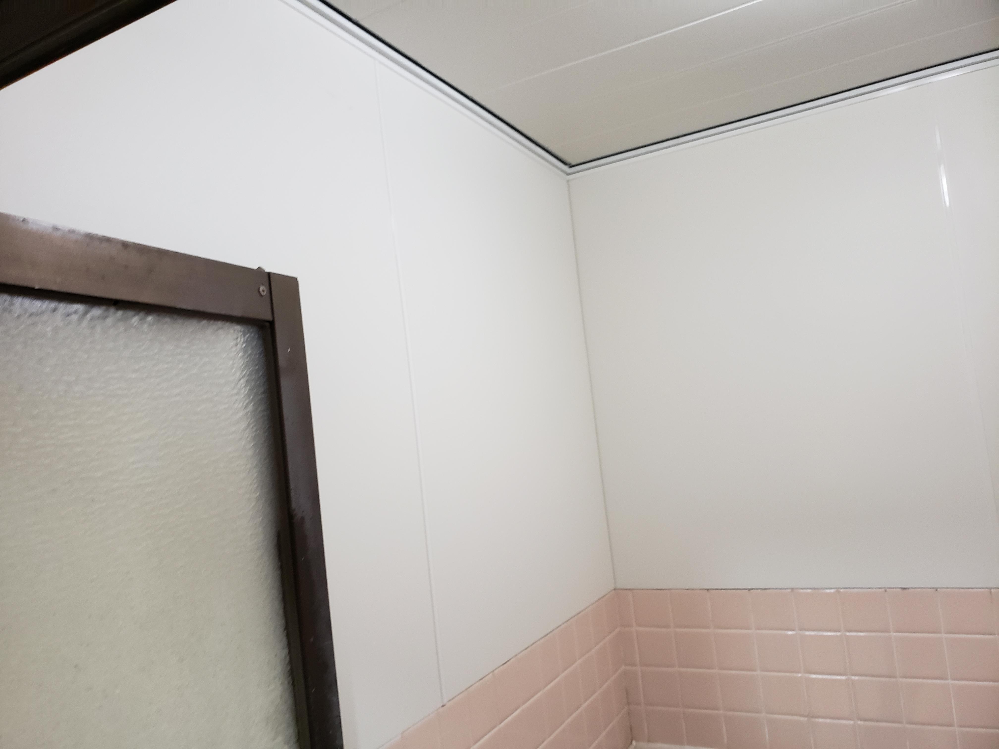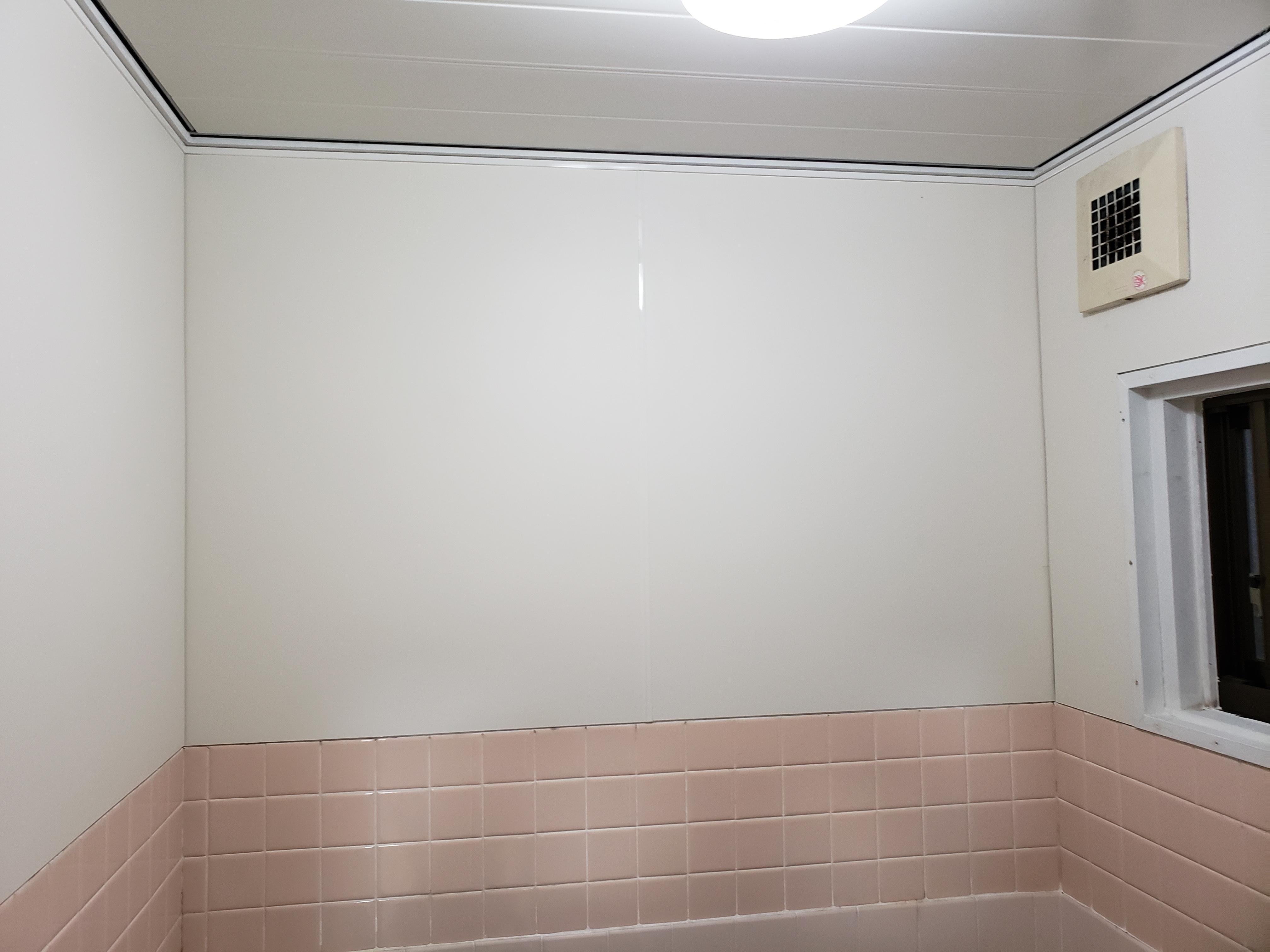 新しい浴室パネルは、浴室用の抗菌・メラミン不燃化粧材を使用しています。元の腰壁タイルは使用するのと、壁・天井パネルを新しいものへ取り付け、短工期で施工することができます。