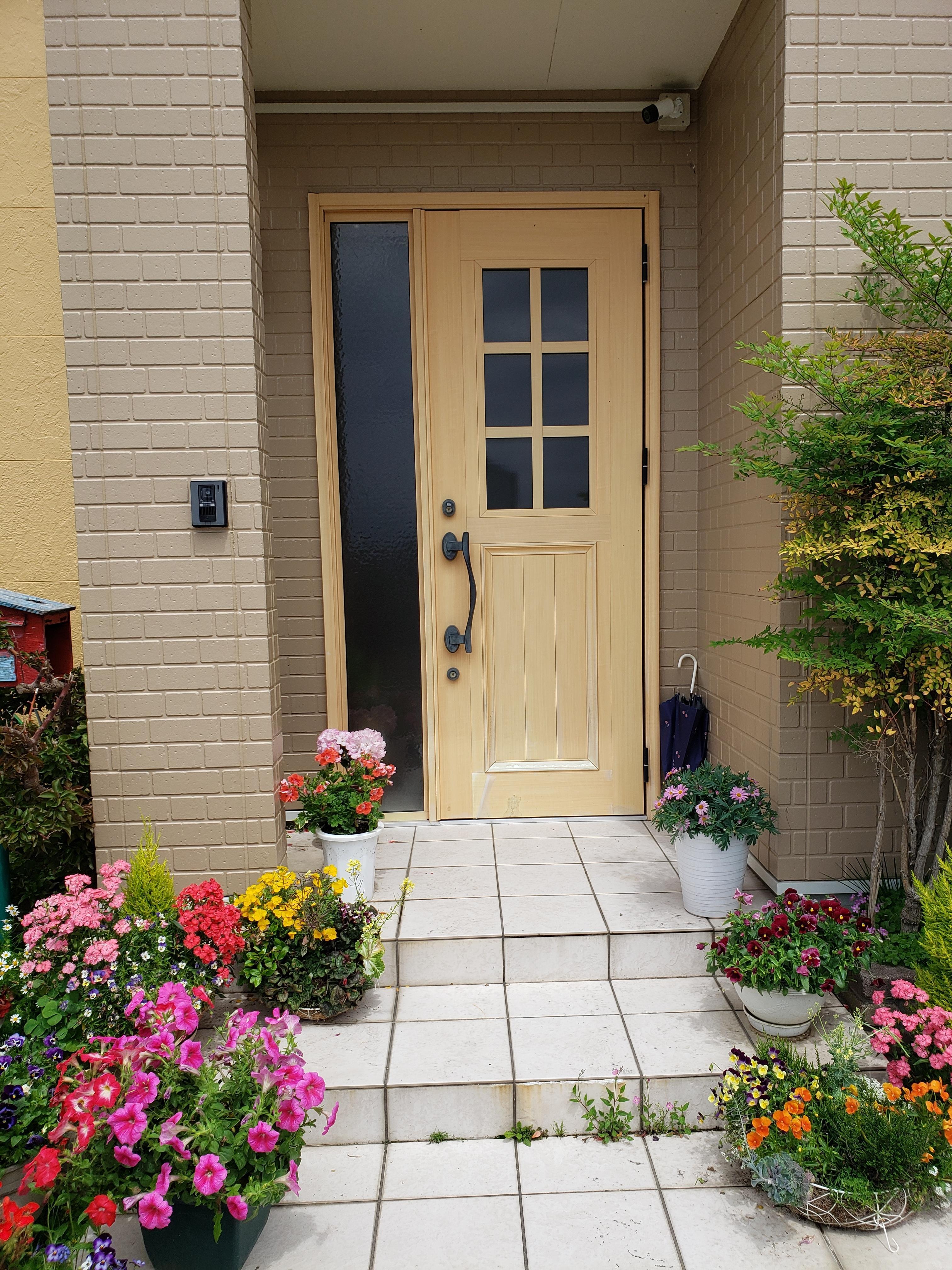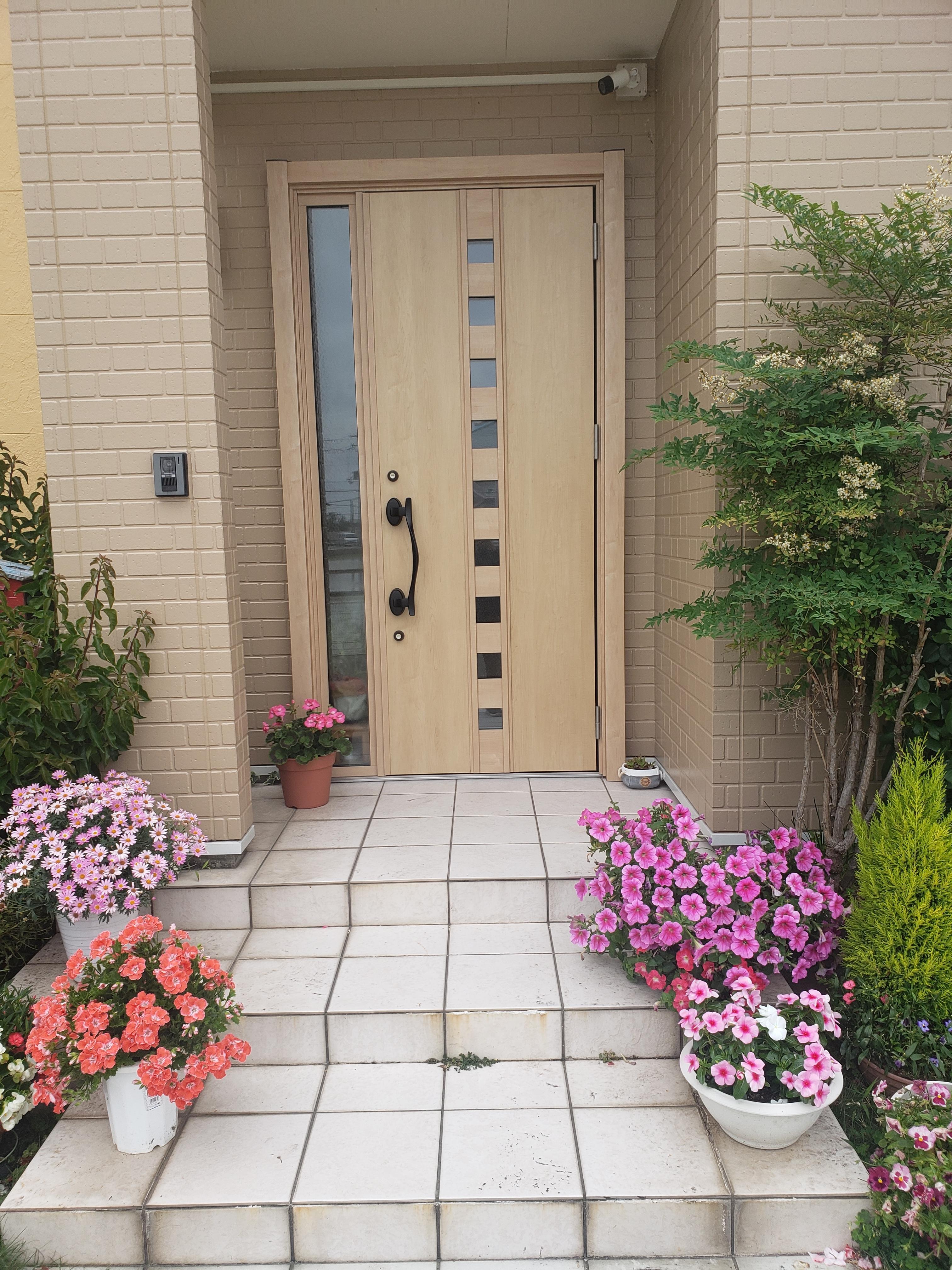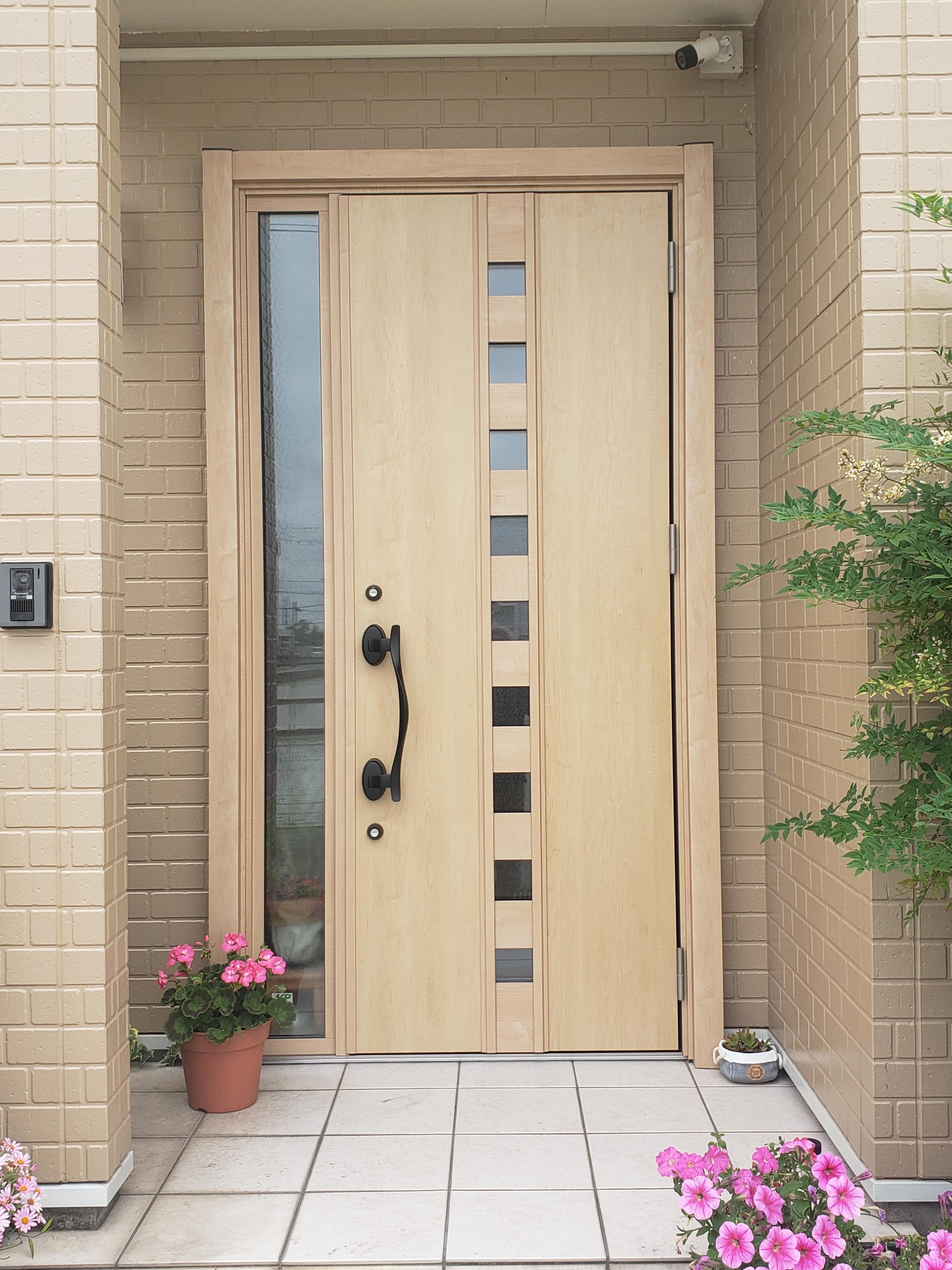 玄関ドアの表面が浮いてきているとのことでご相談を受けました。降雨や経年劣化でしょうか? 外観の雰囲気を損なわないように、以前の玄関ドアとデザインイメージを合わせてお選びいただきました。 玄関ドアのPATTOリフォームで、あっという間の半日施工で完了です。