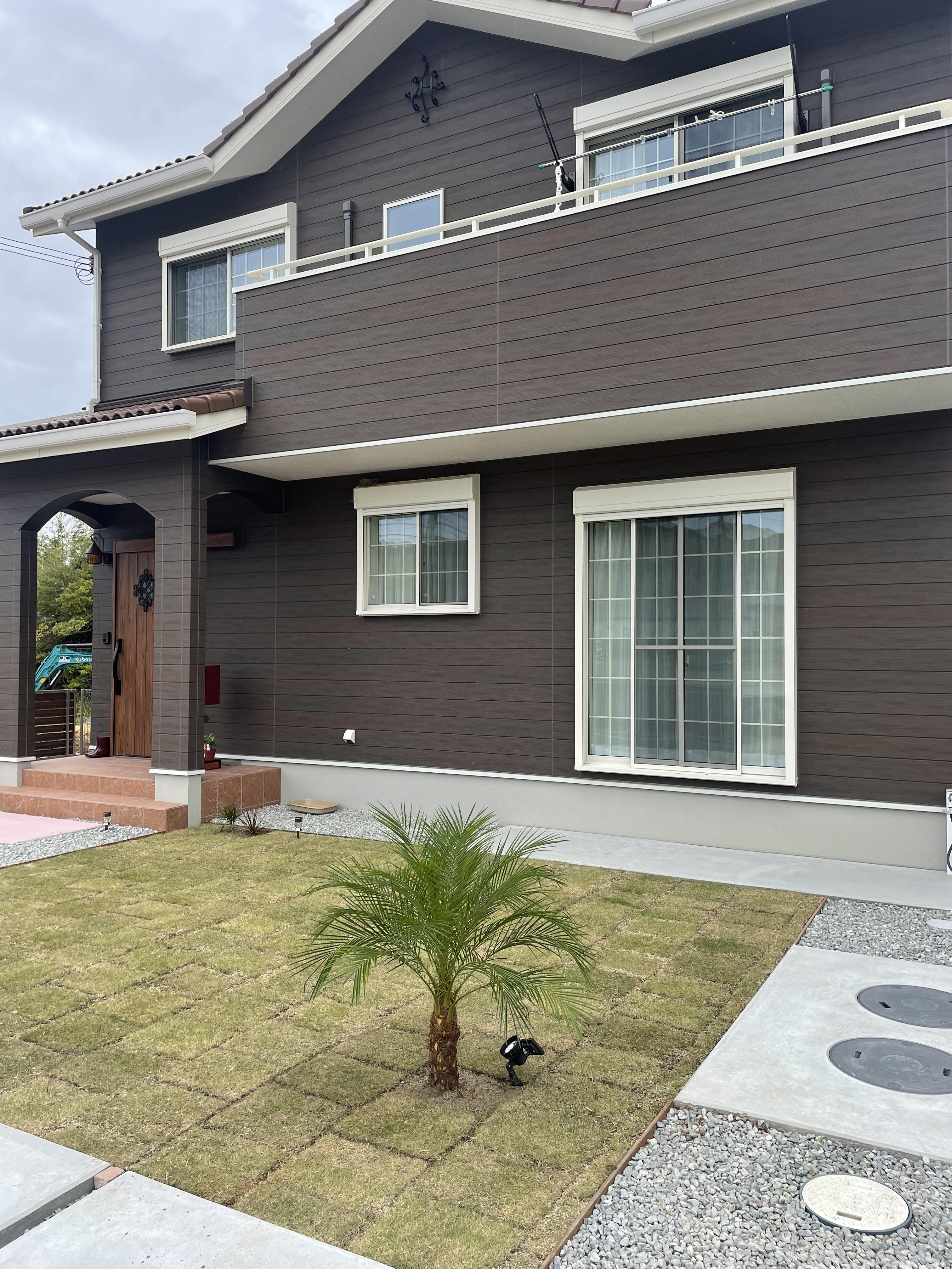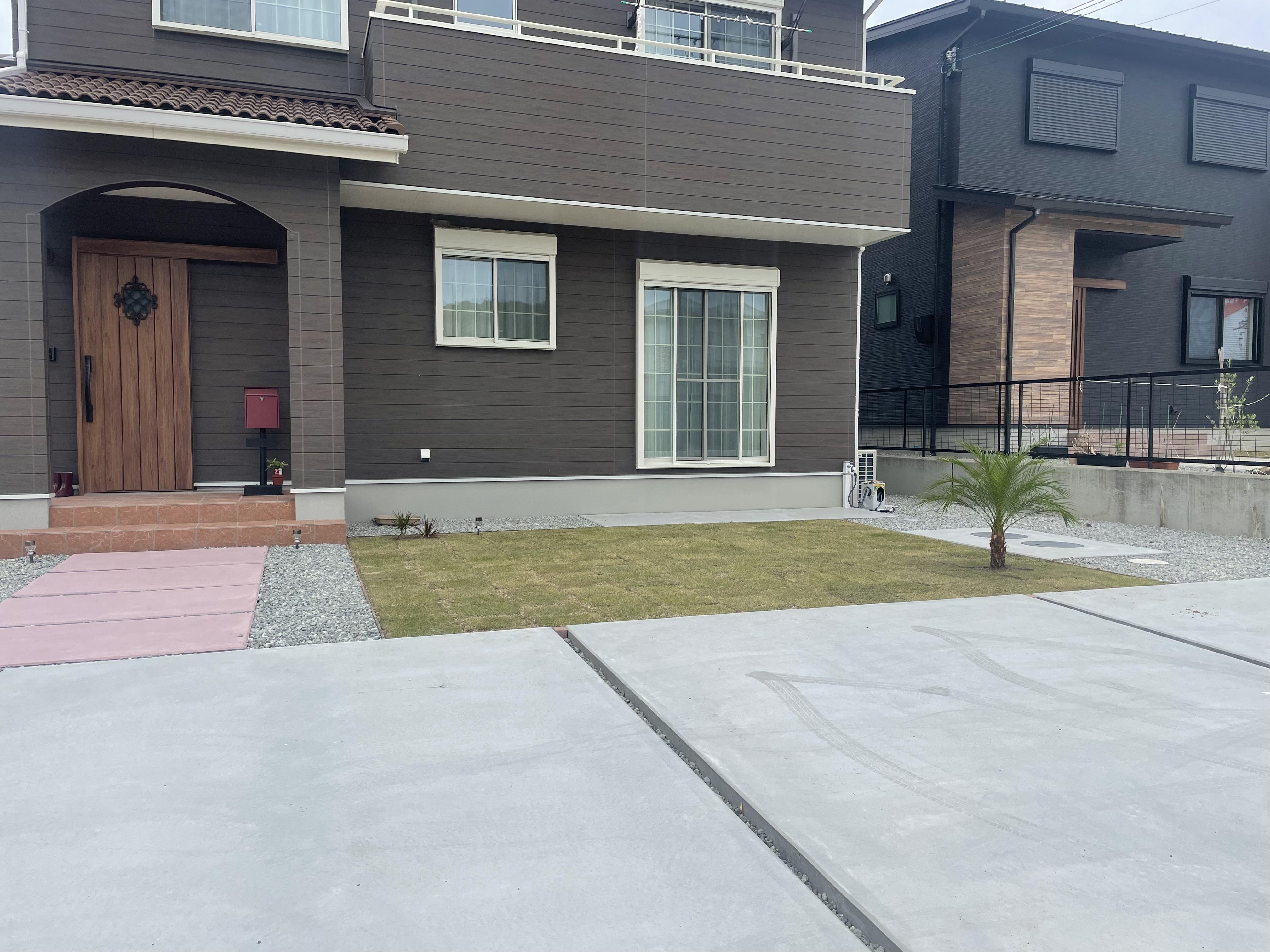 新築を建築した際、庭や外構のイメージをどのようにするか迷われていました。 駐車場をコンクリートで整え広くとりつつ、グリーンが映える庭にするため、植木と芝生を。可愛くて南国を思わせるような植木にはスポットライトをあてて注目してほしいポイントにしました。