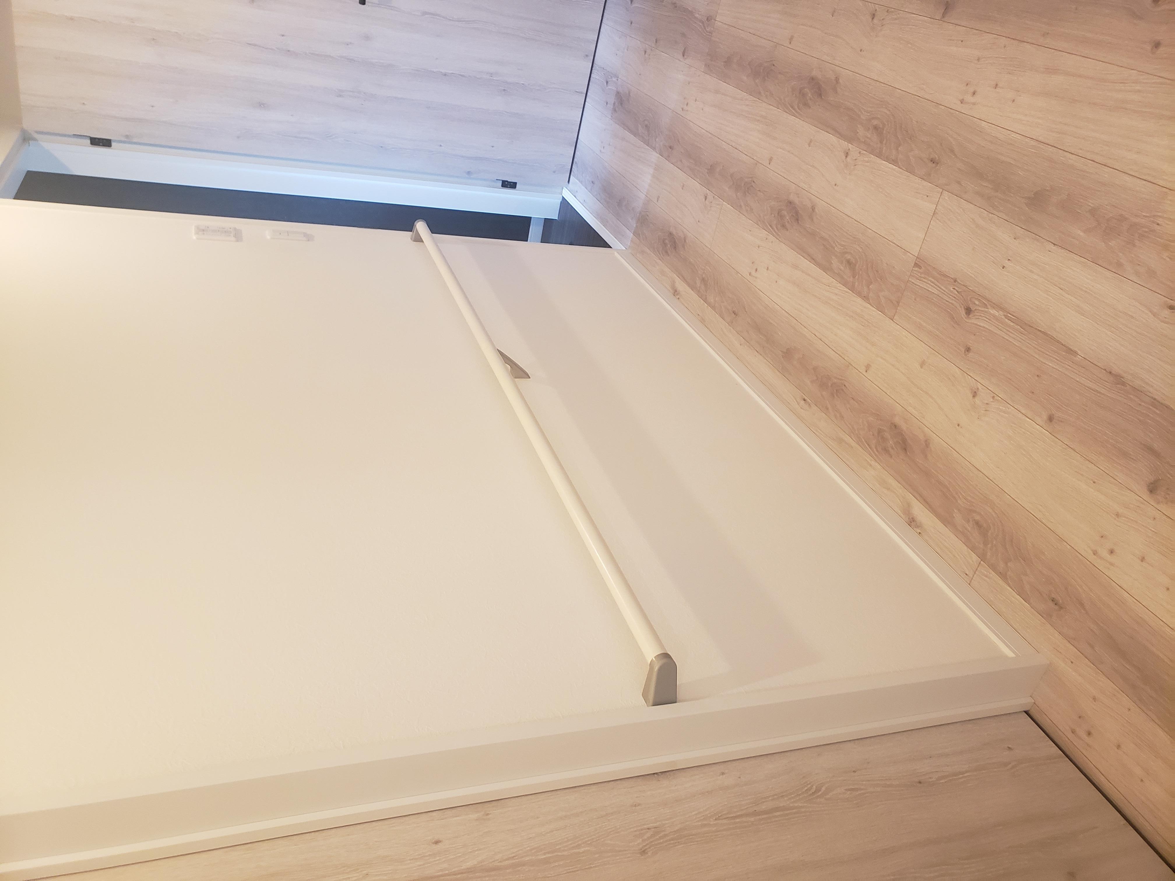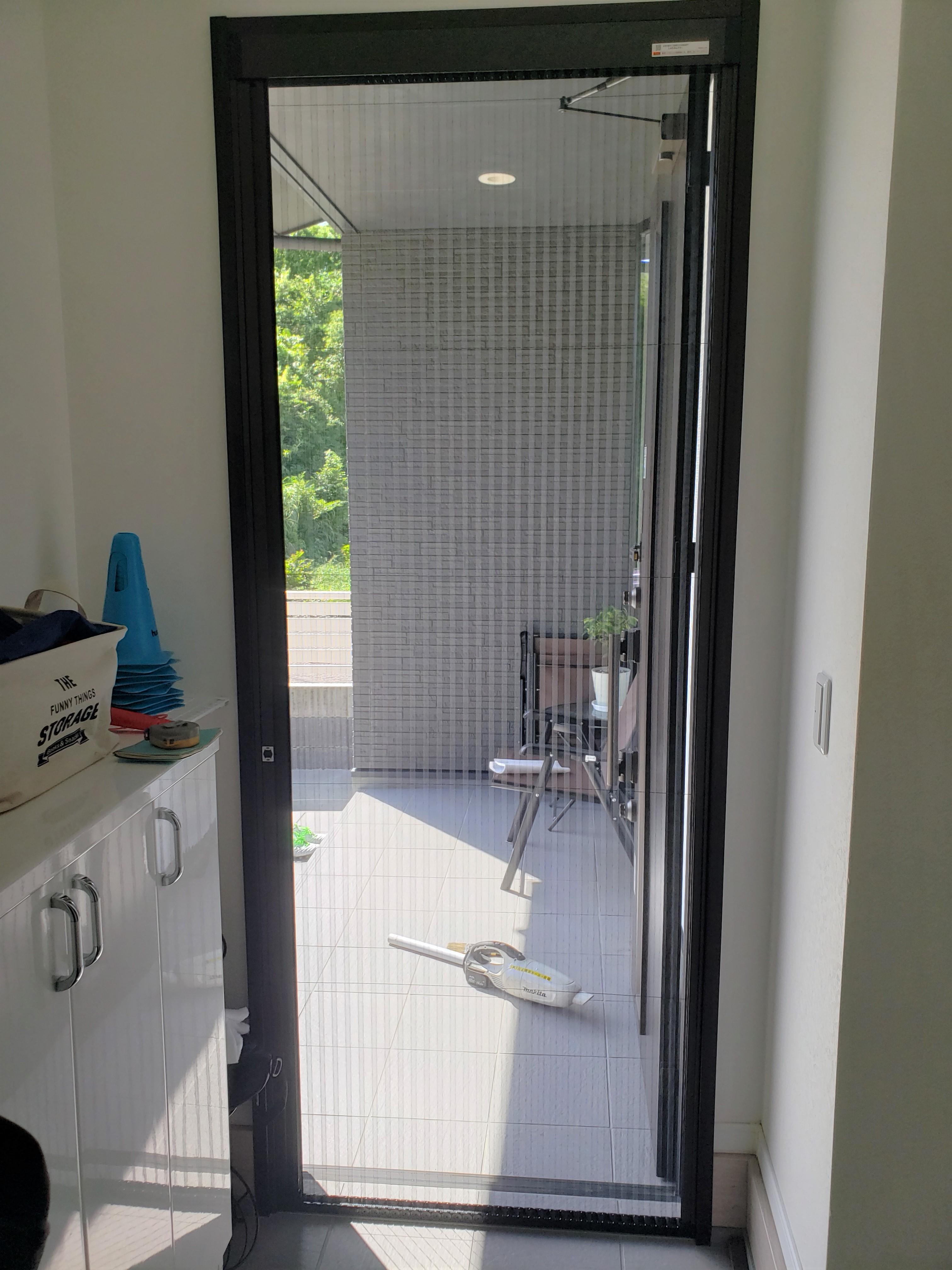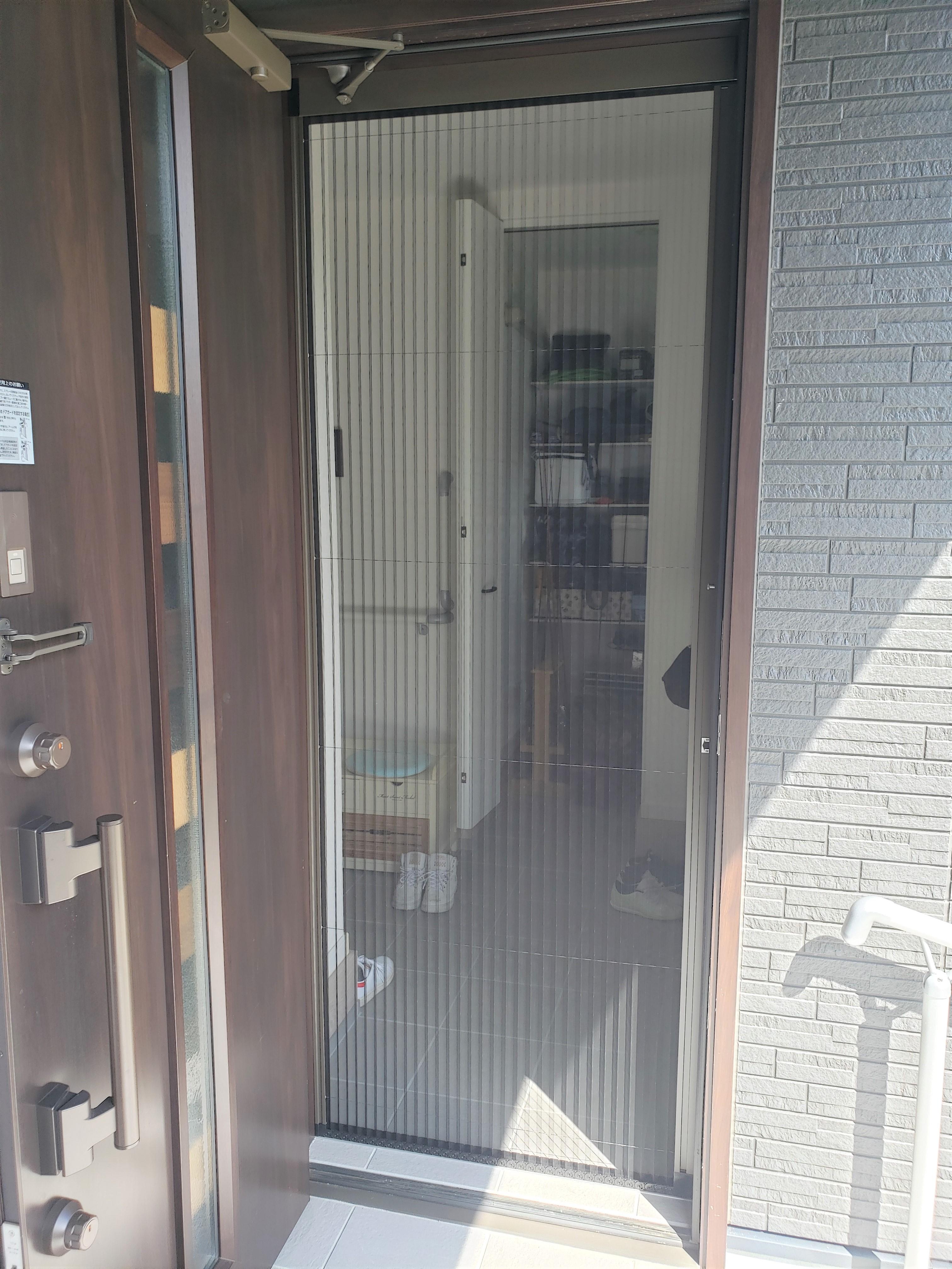 片開きの玄関ドアに伸縮網戸をつけ、安心して換気ができるようになりました。 それと、ご家族さまが安全に暮らしていけるように補助用手すりも取り付けました。 ちょっとした段差も、気づかずつまずいてしまうと危ないので気を付ける場所に手すりをつけ、段差をなくすように工事させていただきました。 末永く安心して暮らしていけるようにお手伝いできたこと、感謝しております。 またお困りごとがありましたらいつでも気軽にご相談ください。