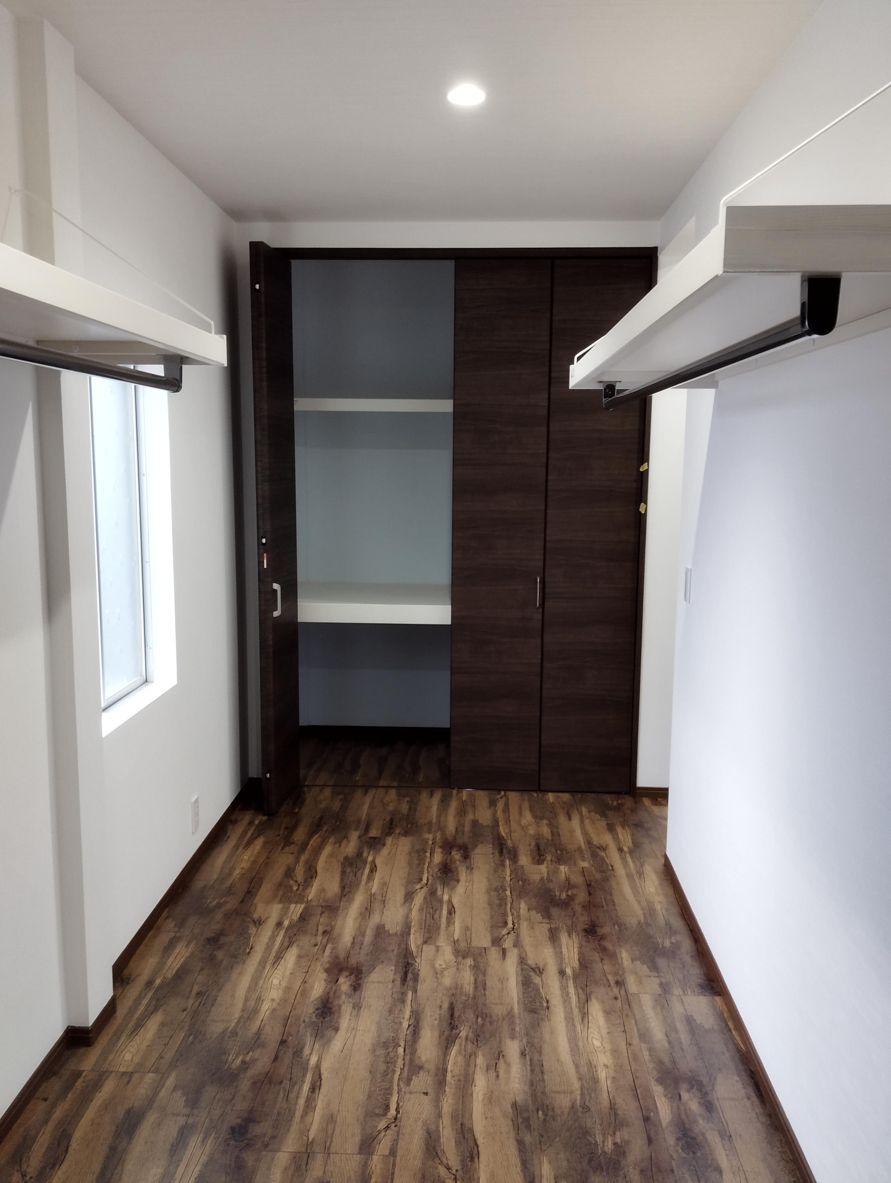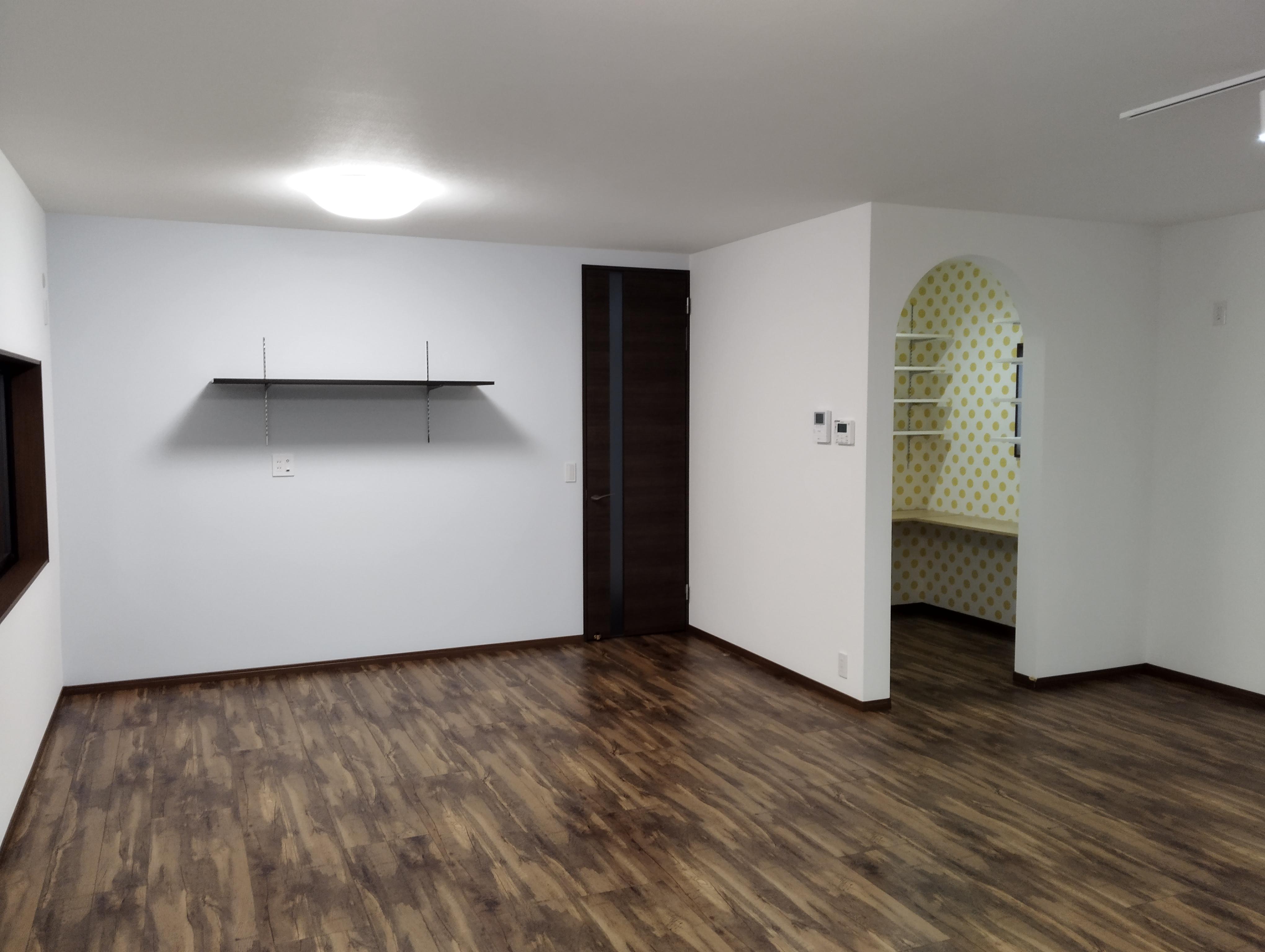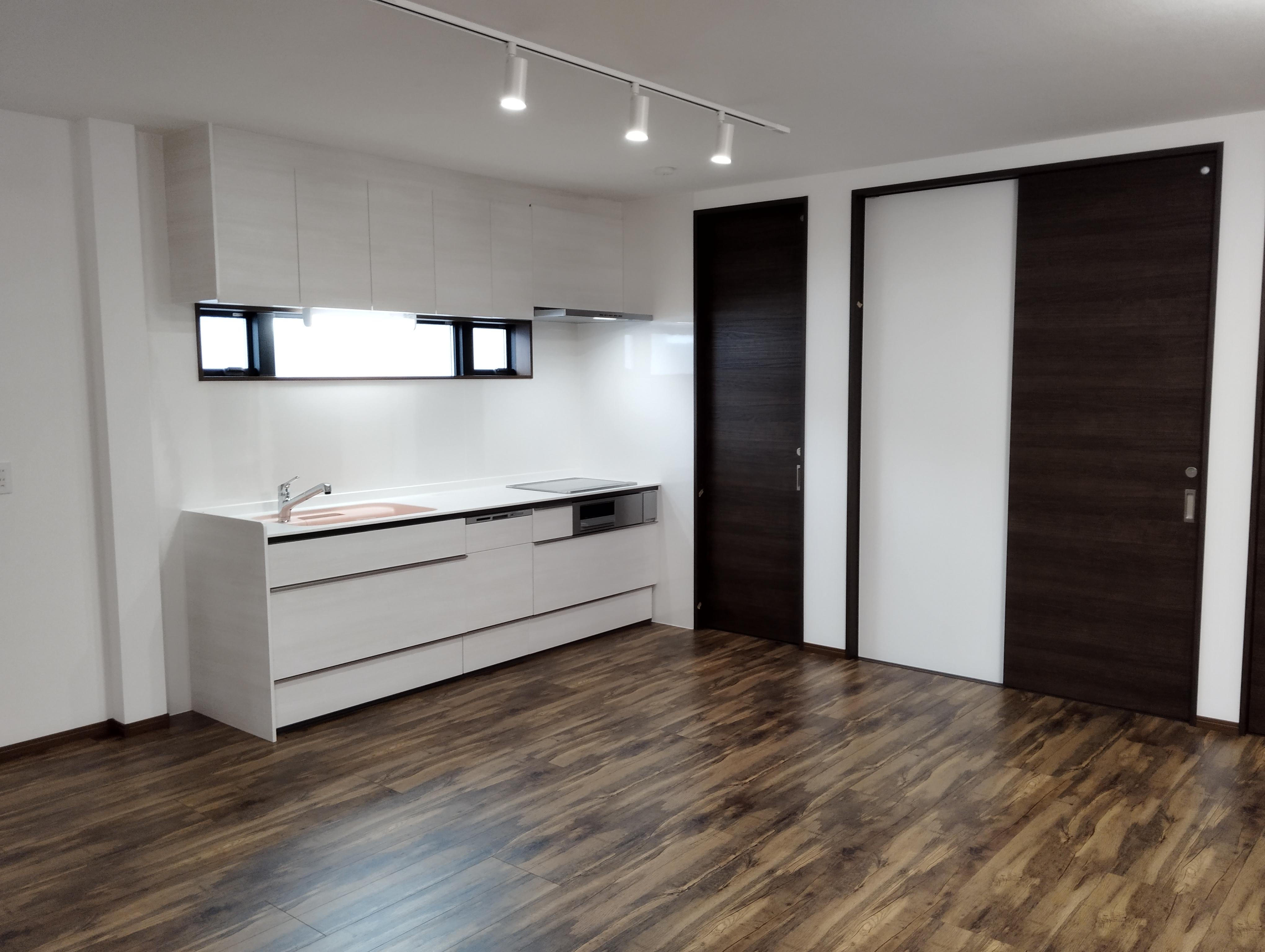 二世帯で生活するためにご家族皆さまでリノベーションを決意されました。経年劣化でが外壁のひび割れや破損からの雨漏りなどにお困りだったそうです。築年数とともに使いづらくなった設備や、今の生活には使いづらい間取りをご家族さまに合わせて収納を多くとったり、水廻り設備を省エネ性能のある使いやすいものを採用したり、和室から洋室へ変更し、段差の少ないバリアフリーな空間へ変更したいとのことでした。二世帯の若夫婦のLDKは通常よりも天井高を高くとりハイドアの建具を入れ、圧迫感のない空間づくりをしています。