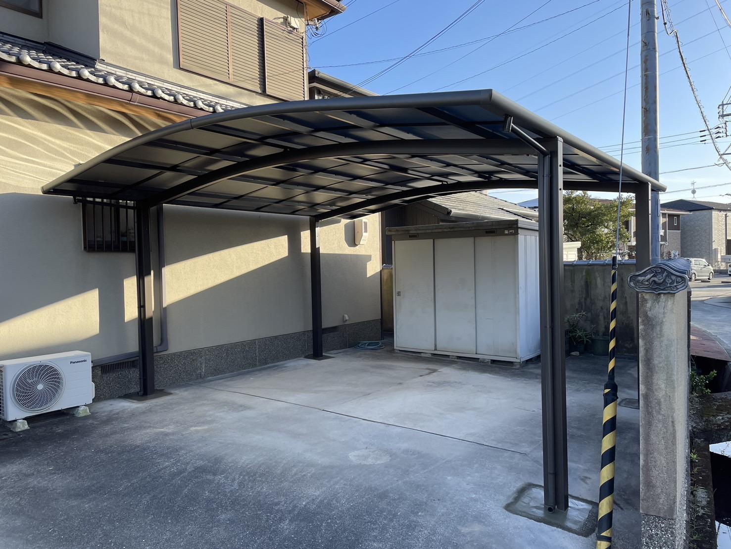 以前ご使用されていたカーポート屋根は経年劣化で撤去したのですが、やっぱり愛車を守るためにカーポート屋根が必要!ということでこの度ご縁をいただきました。今回は脚がしっかりしているタイプで車2台分を置ける商品をご採用いただきました。 工期は1日半という短期間でした。風が強く当たる立地ということだったので、強風に耐えるLIXIL・フーゴをご採用。