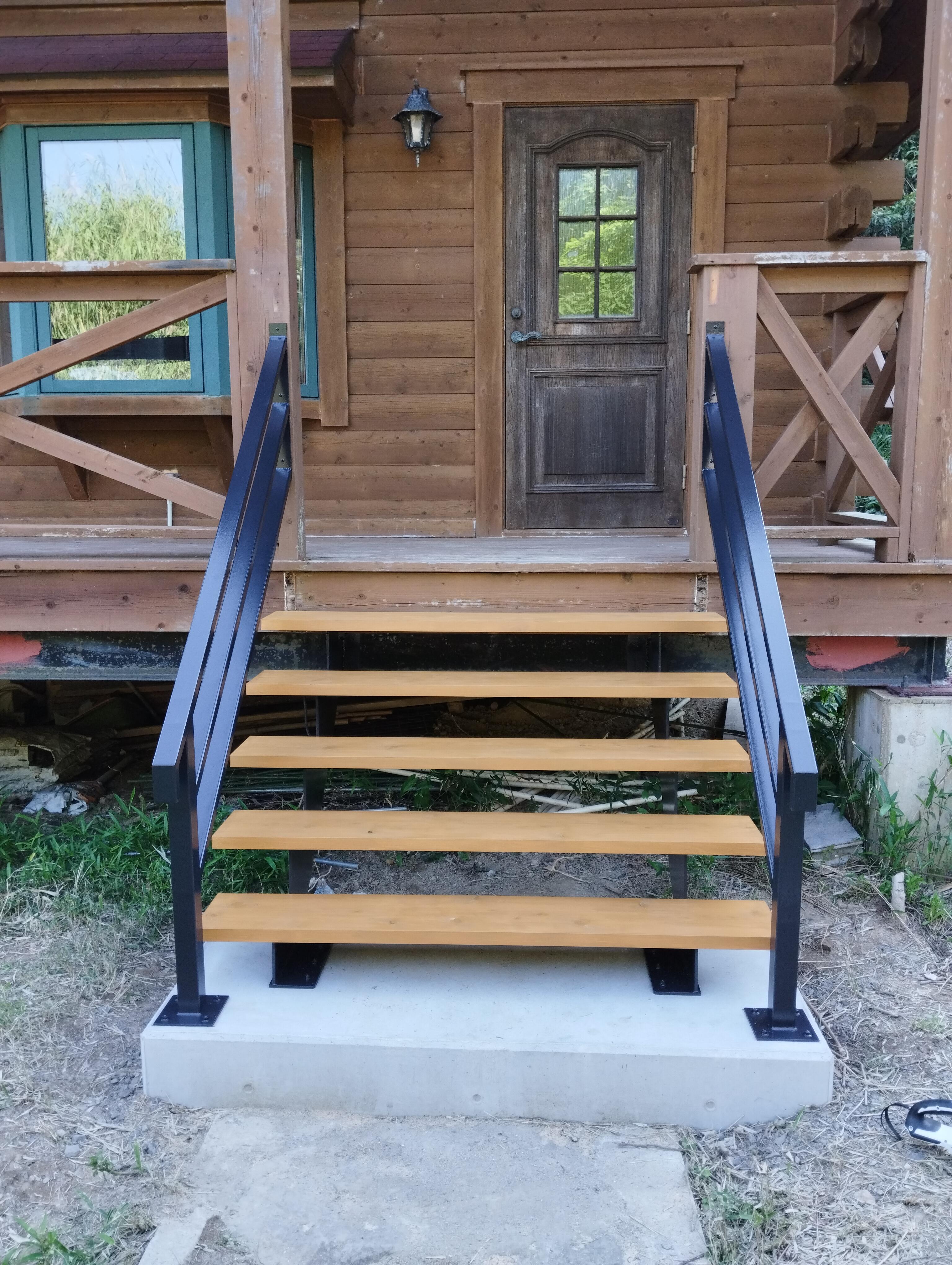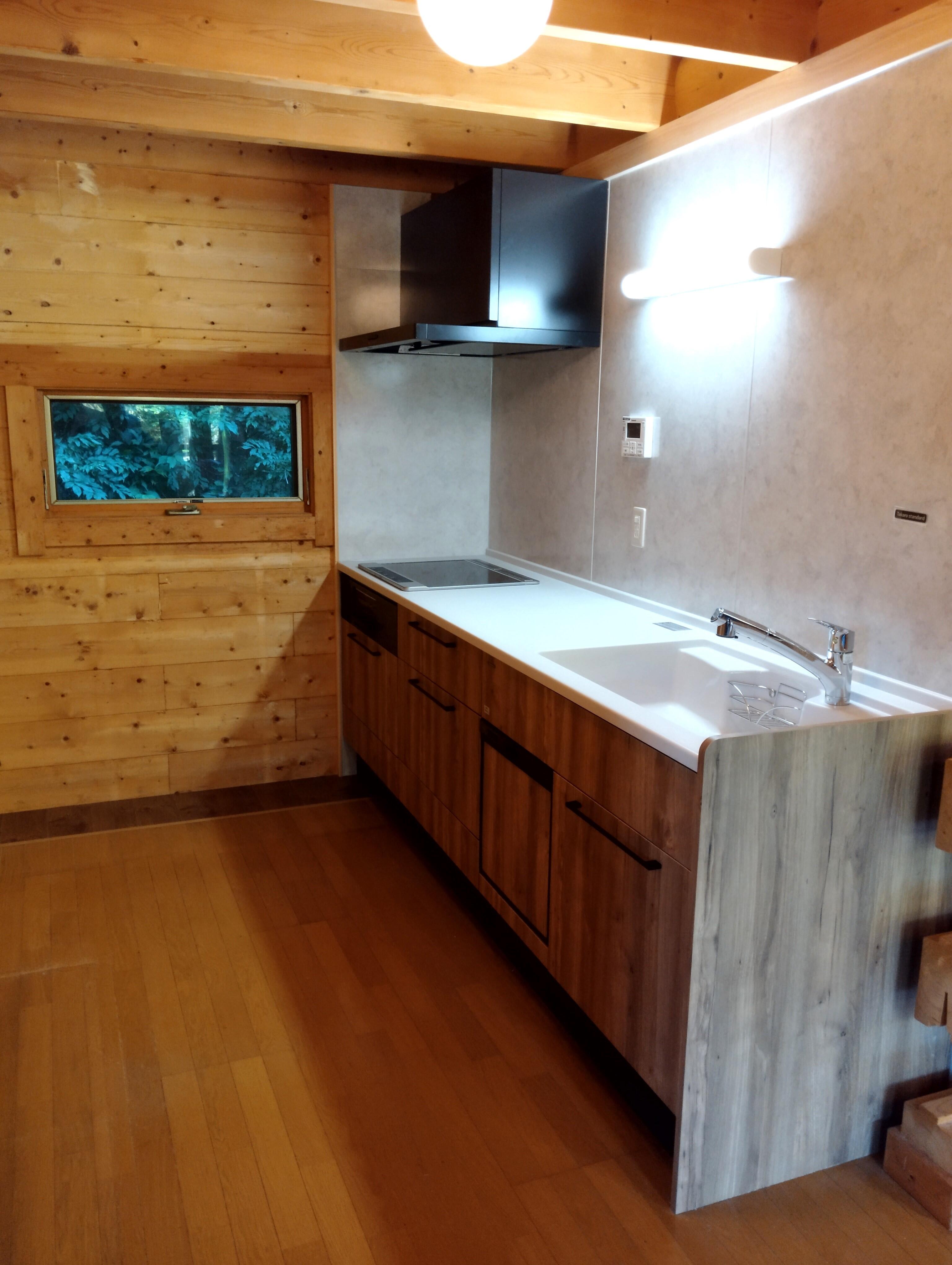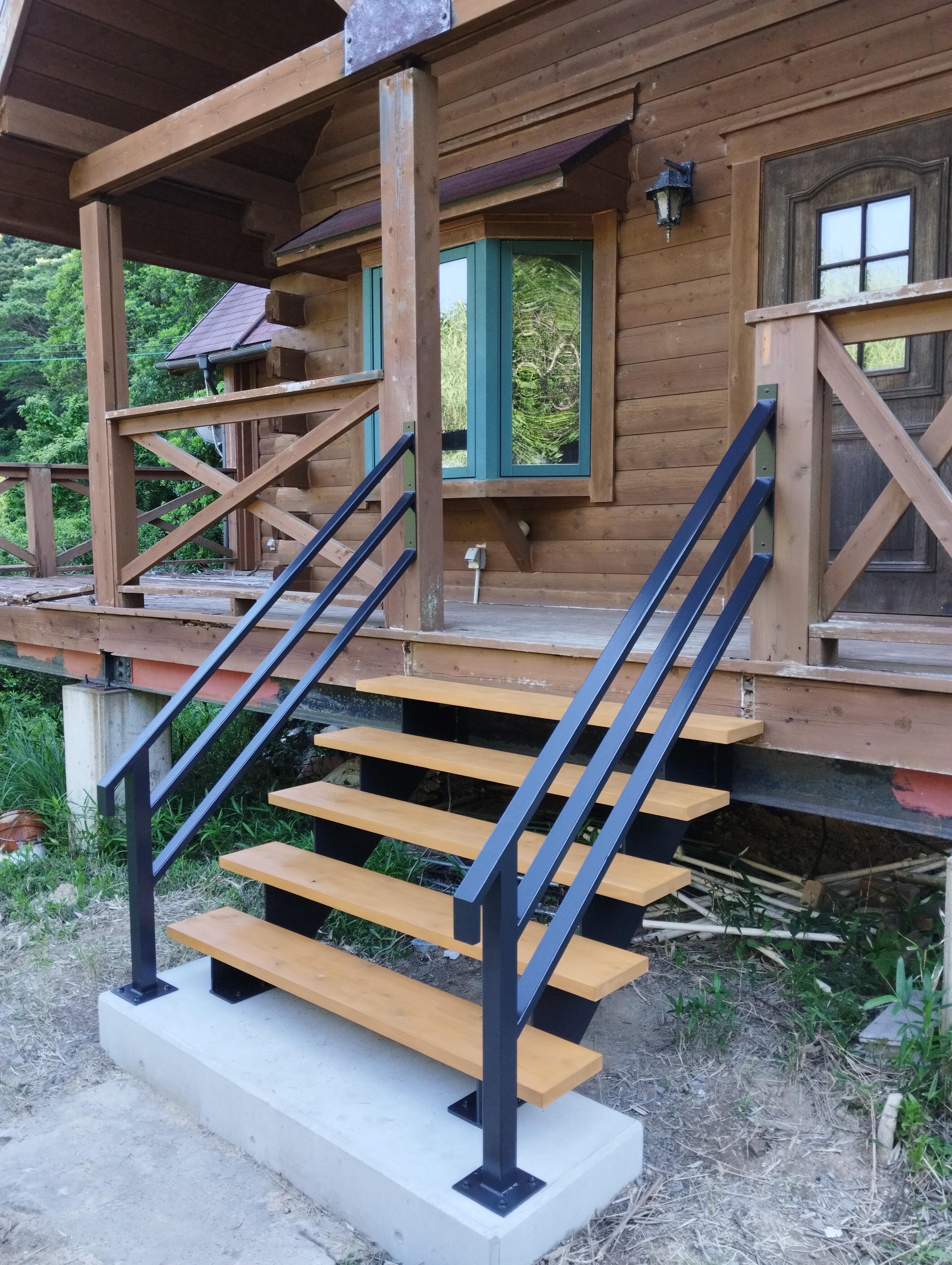 ご縁がありお問合せ頂きました。 中古住宅をご購入されて、内装は比較的キレイであったことからよく使うキッチンや給湯器を新しくしたい、というご相談です。 山が近いこともあり、入口になる木製のデッキ階段は老朽化が見られました。ウッドデッキにしっかりと上れるように、階段はサイドは鉄のフレームとコンクリートの土台を据え耐久性を高めました。