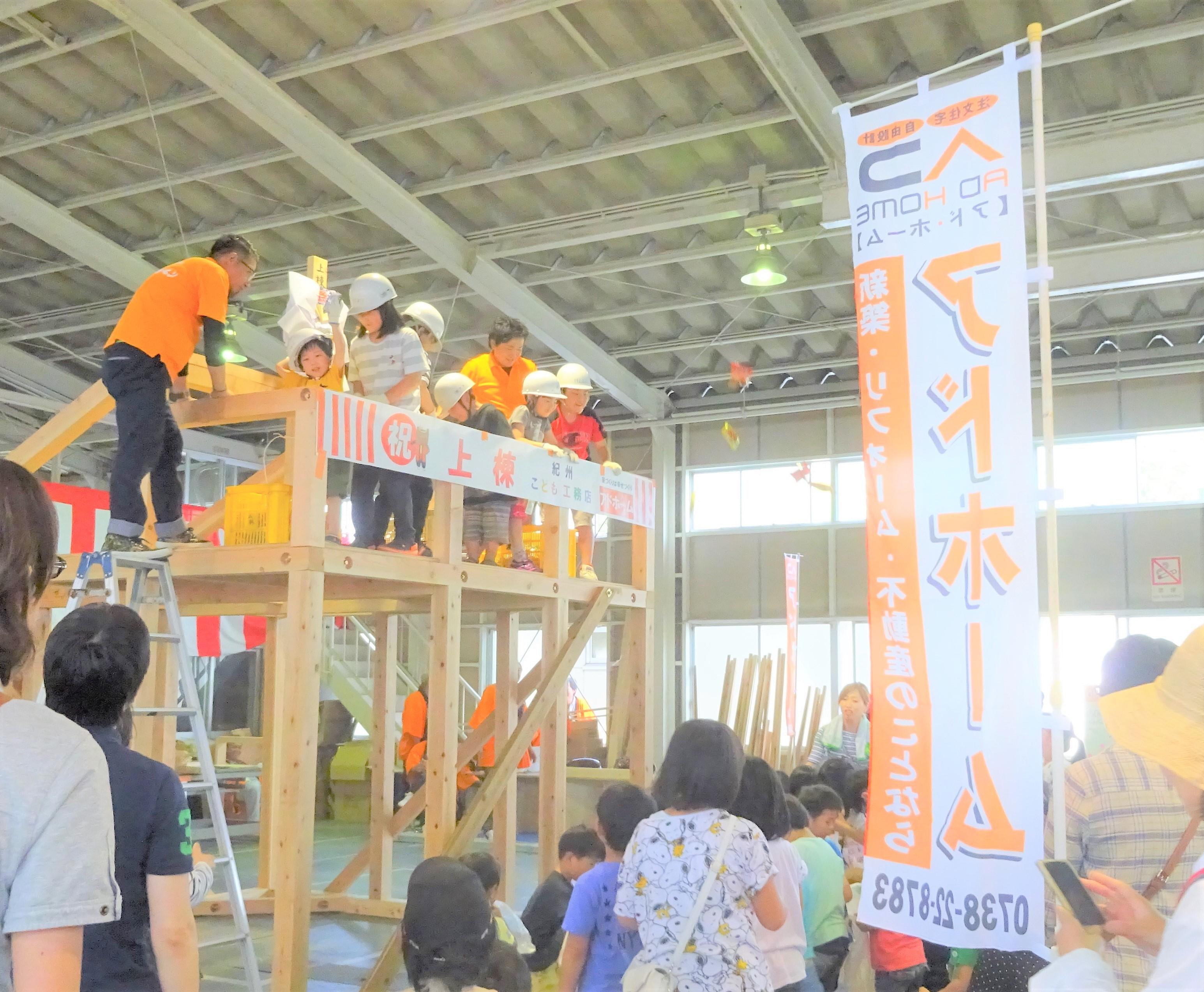 こども棟梁による棟上げが完成した後にお菓子をまくよ!