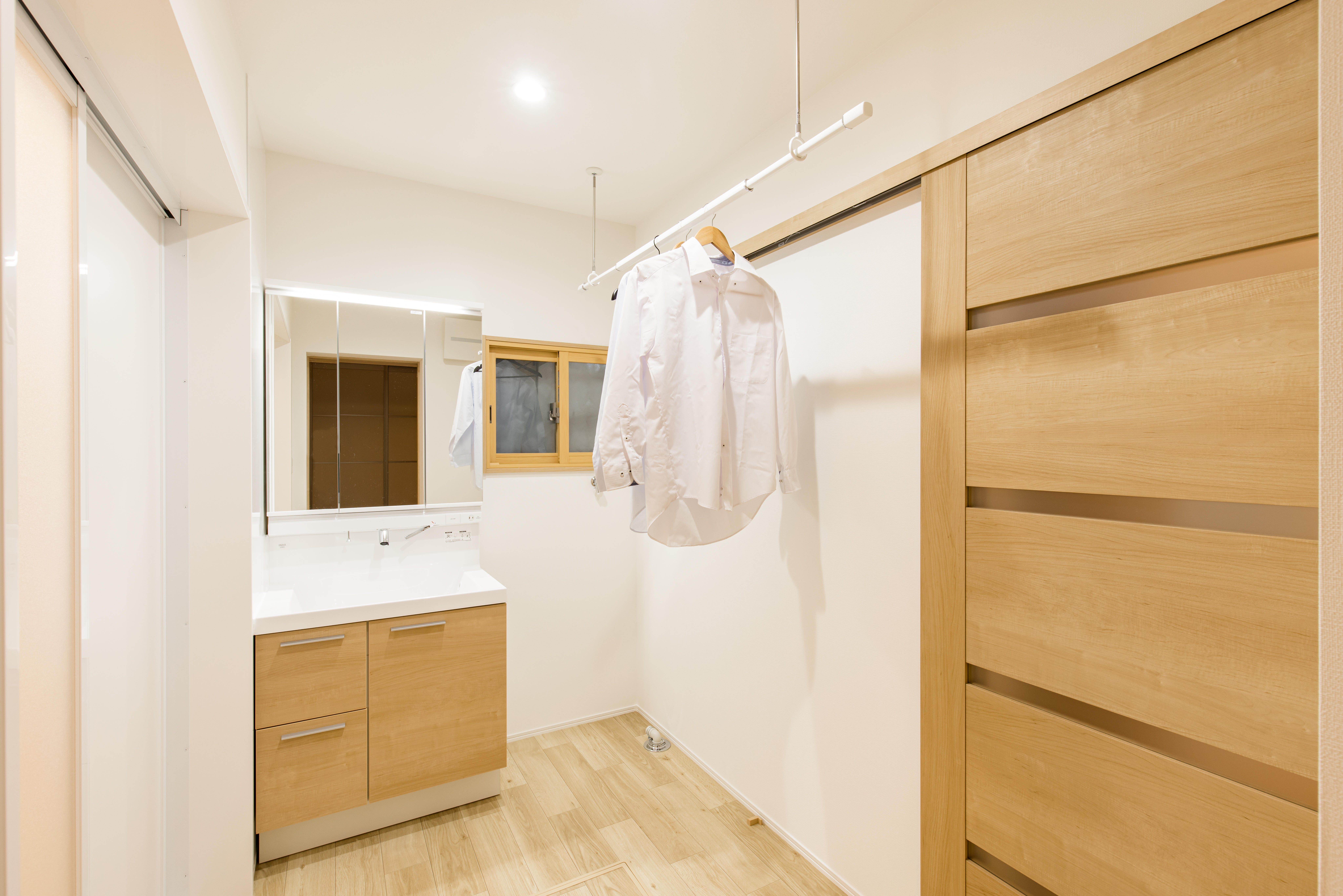 洗面スペースは室内干しが出来るよう物干し竿も設置しています。