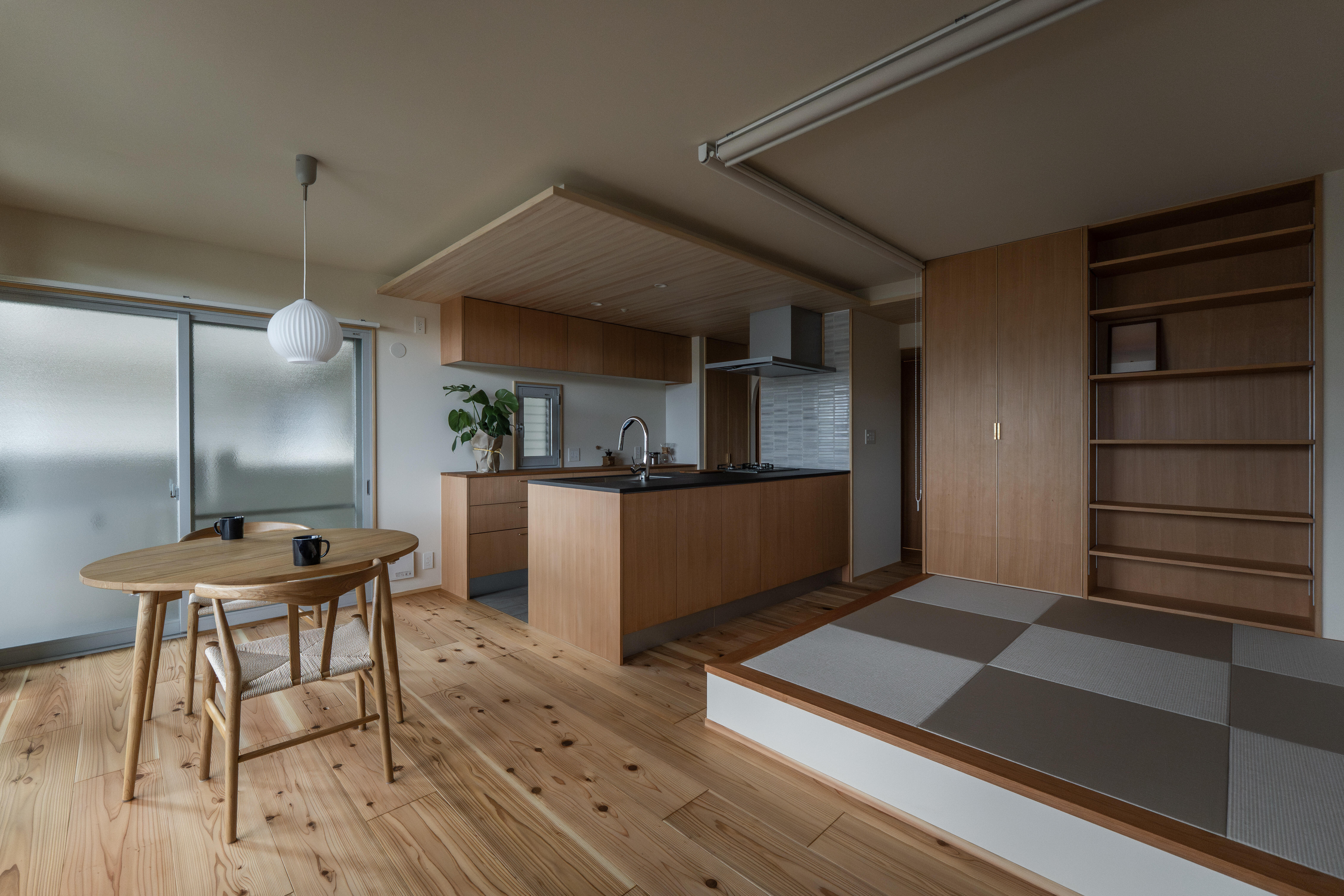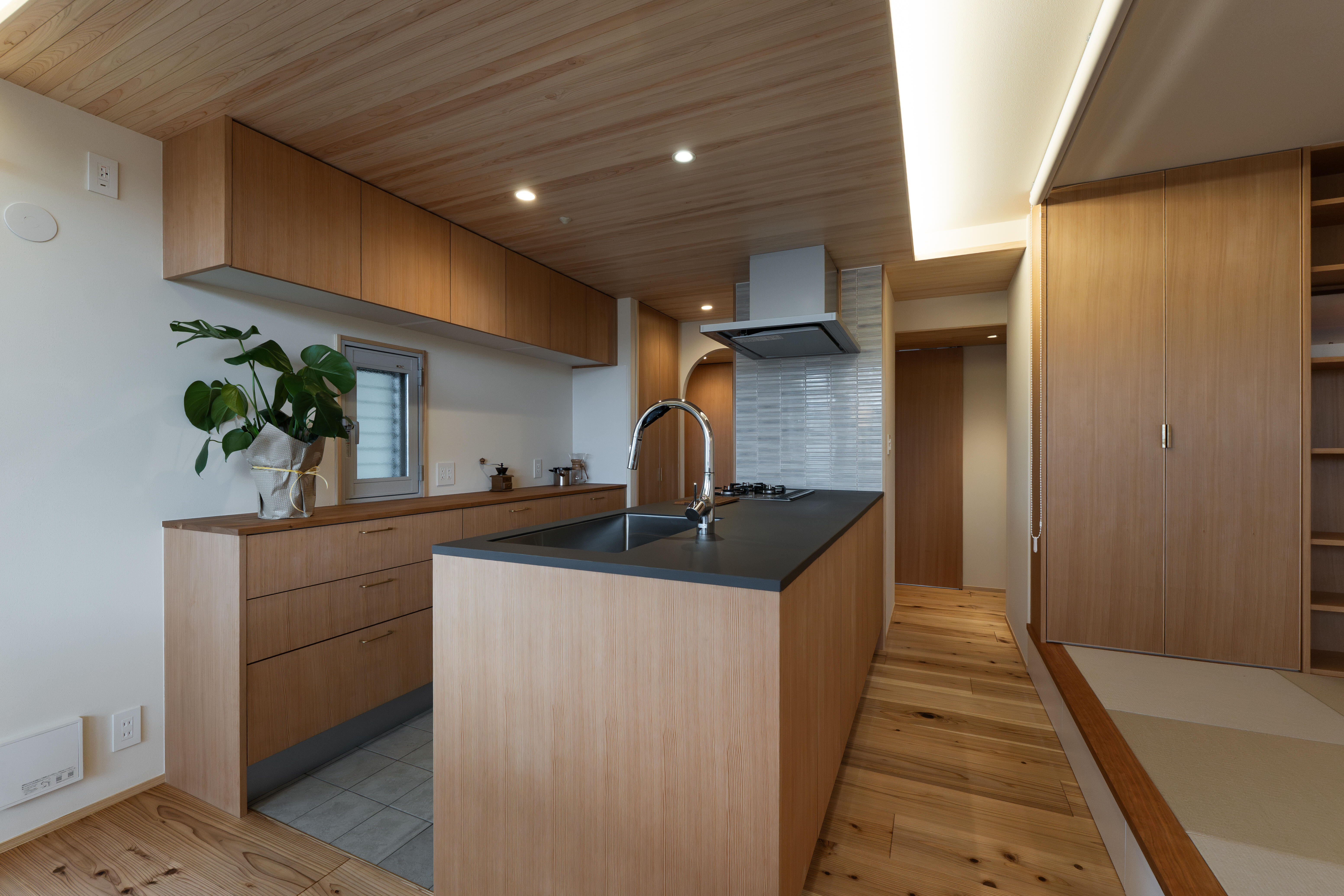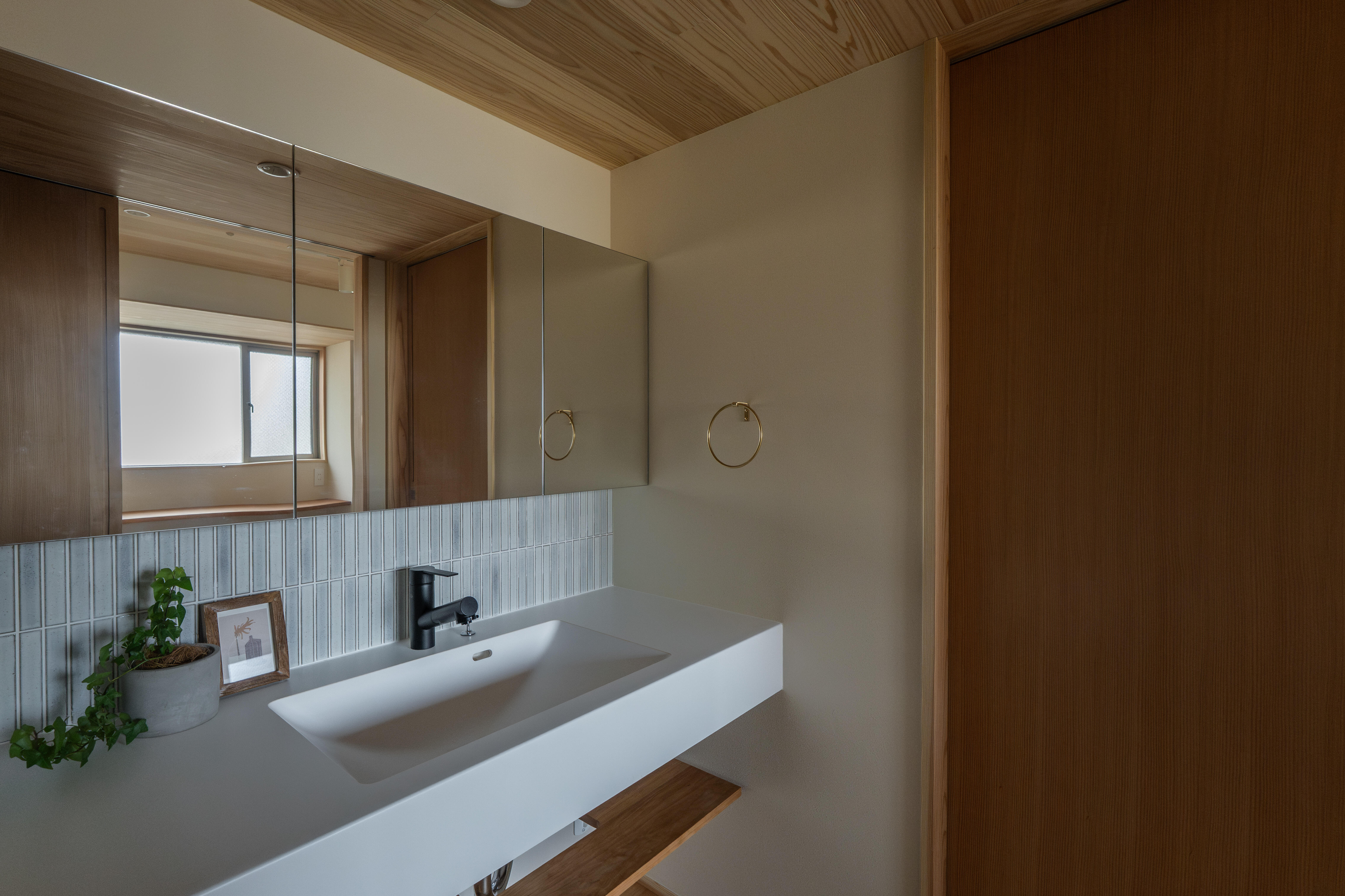 光と風を紡ぐ木の家 壁には断熱材を施工し、窓には二重窓(内窓)を採用することで、夏は涼しく冬はあたたかい、一年を通して快適な室内環境を実現しました。床材には、古くから銘木として親しまれてきた吉野杉の無垢材を使用し、自然素材ならではのぬくもりとやさしい香りに包まれる住まいとなっています。 リビングダイニングとキッチンは回遊できる動線とし、家事のしやすさにも配慮。冷蔵庫は目立たない位置に配置することで、すっきりとした空間を保てるよう工夫しました。灰桜色の畳を敷いた小上がりの畳コーナーは、くつろぎの場としてはもちろん、子どもの遊び場としても活躍します。 また、ランドリースペースからベランダへとつながる洗濯動線を確保し、マンションでありながら「洗う・干す・しまう」がスムーズに行える家事ラクな間取りを実現。洗面スペースには、既製品ではなく空間に合わせて設えたオリジナルの造作洗面台を採用し、使い勝手とデザイン性の両立にもこだわりました。