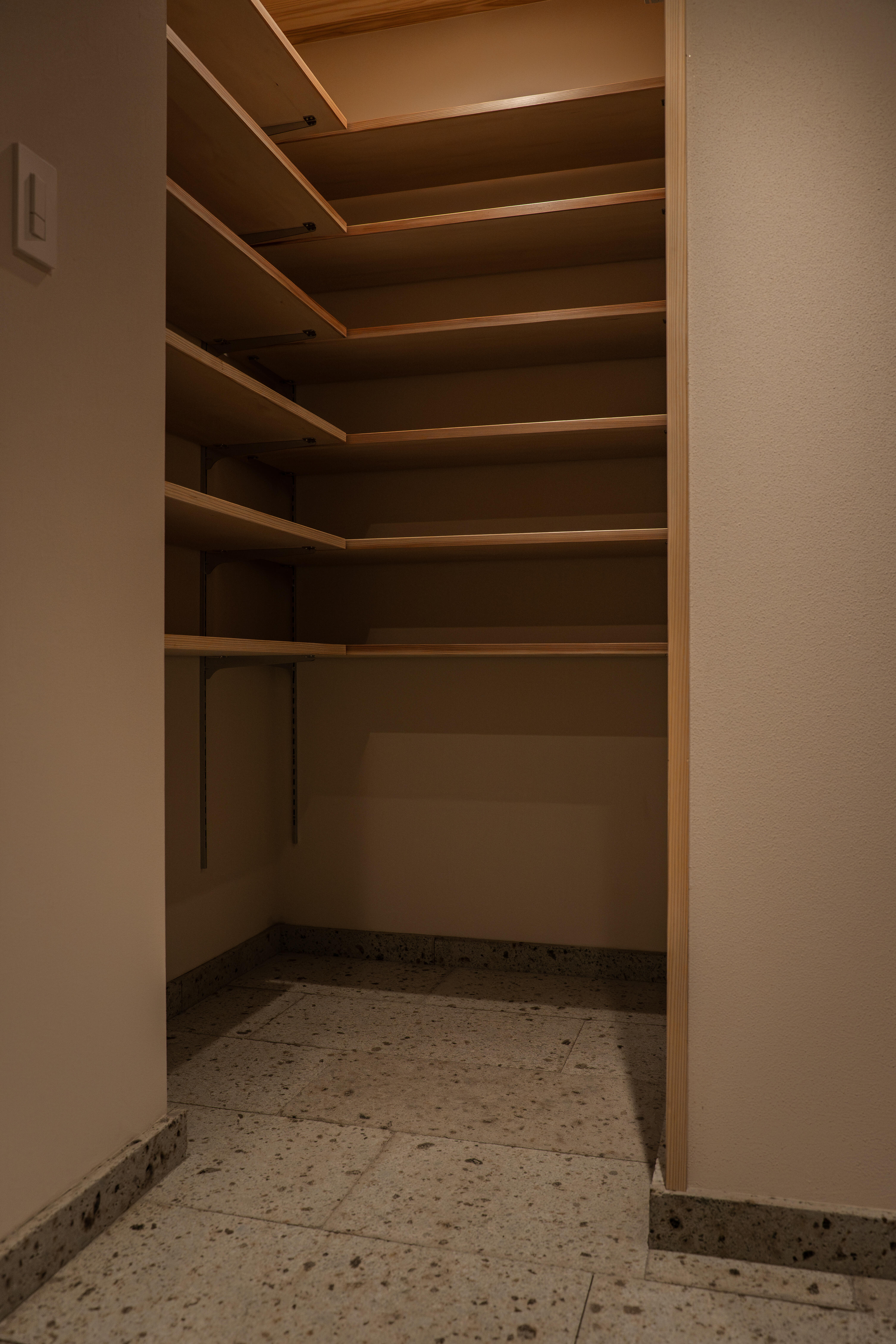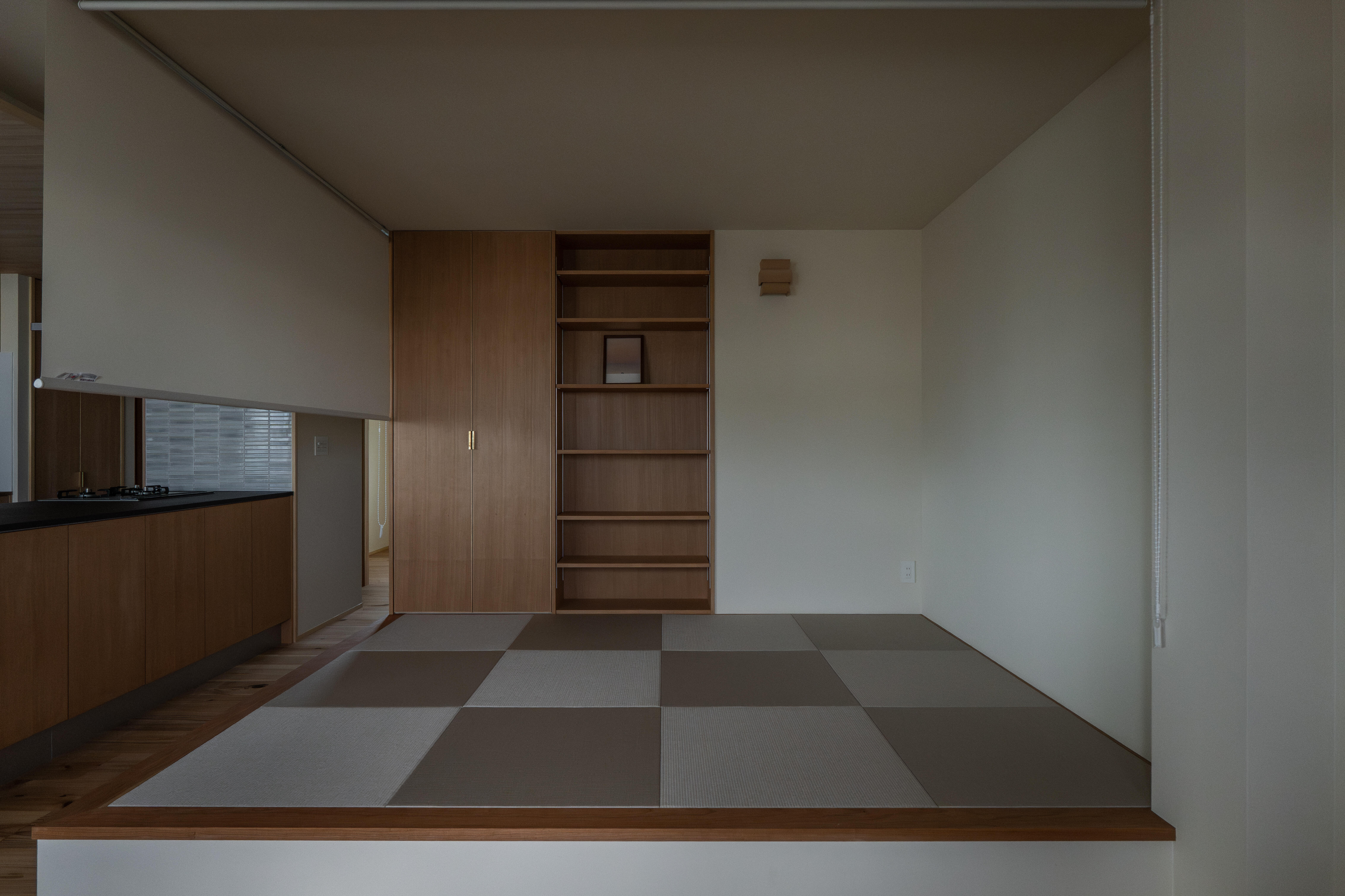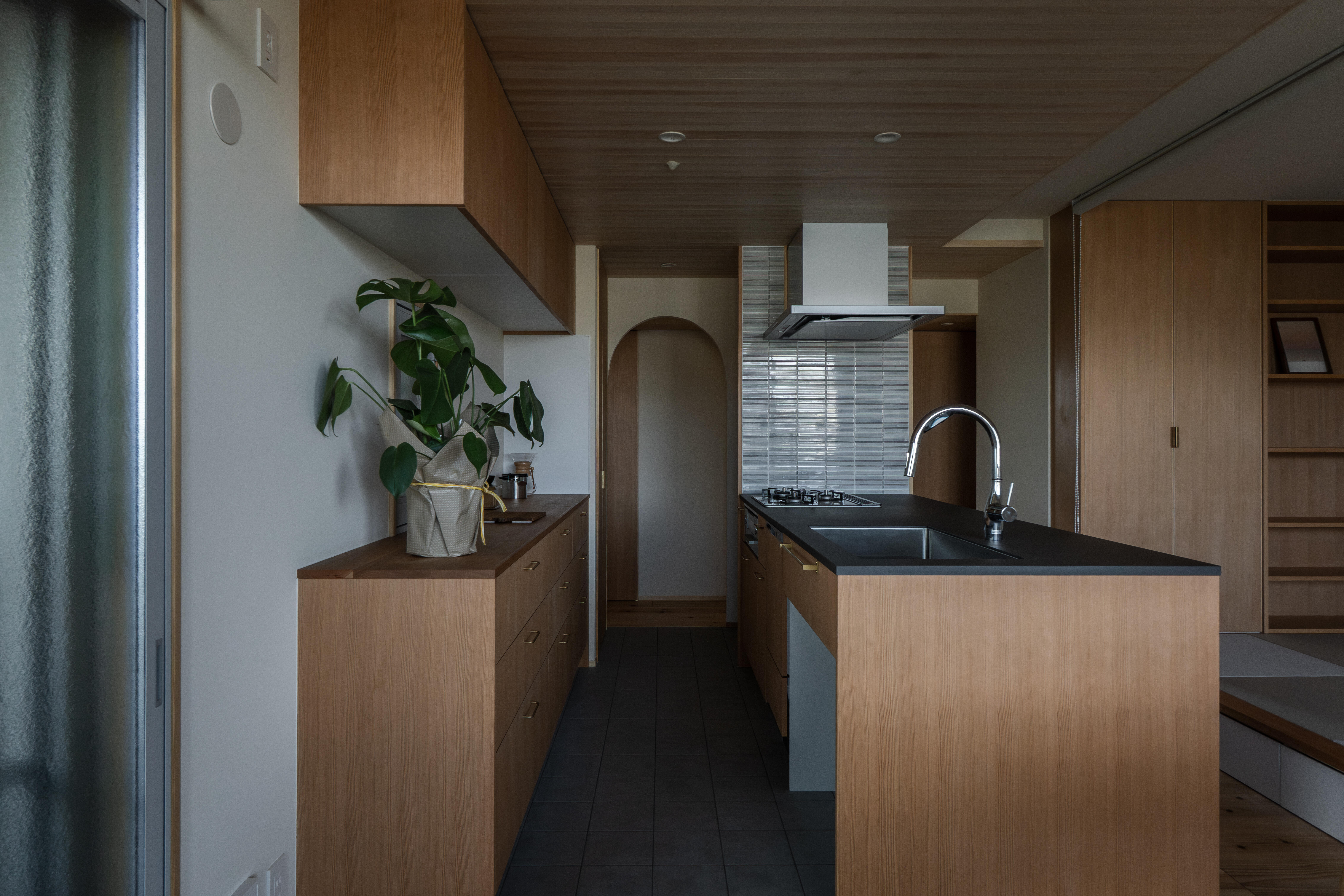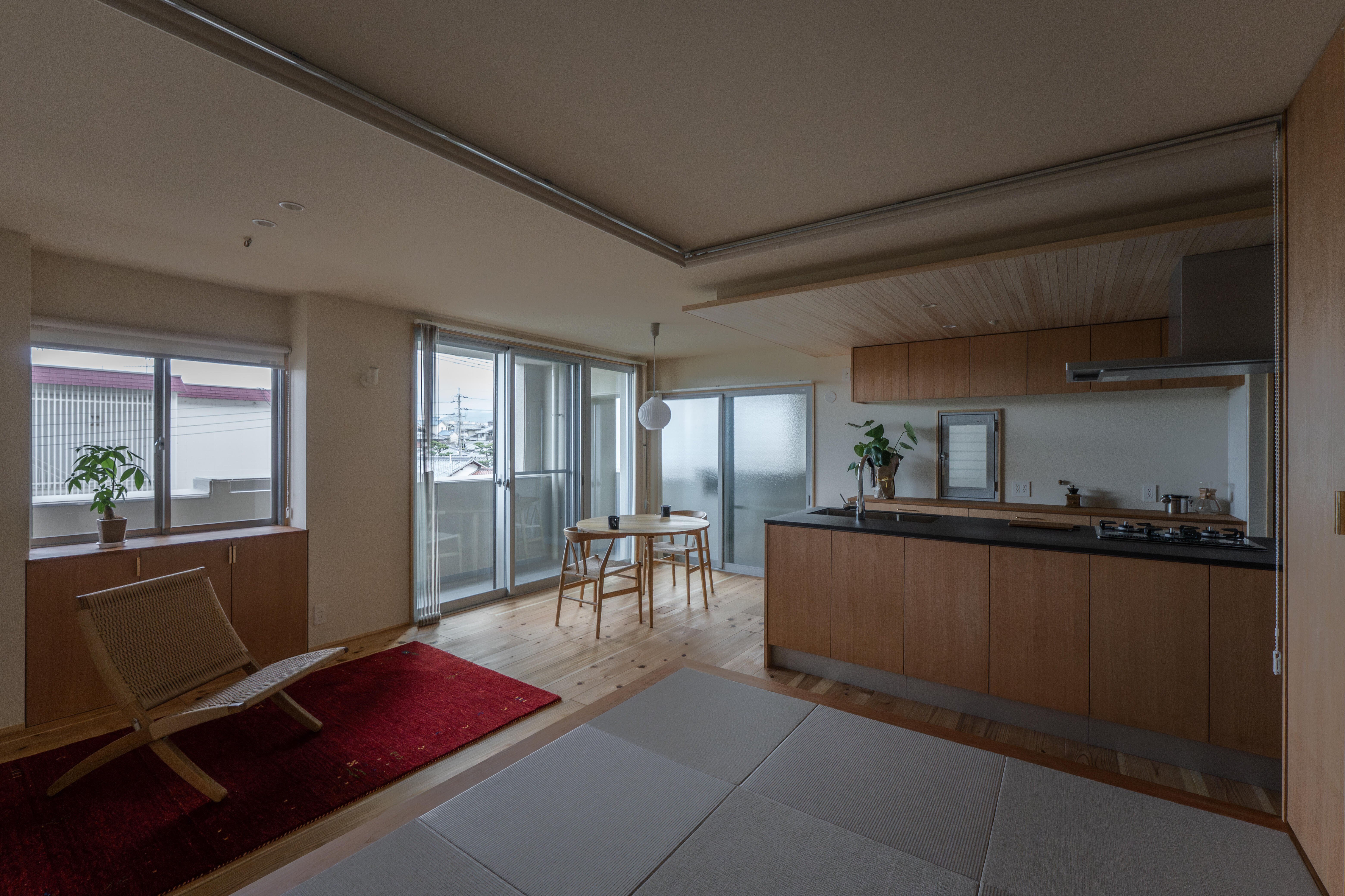 光と風を紡ぐ木の家 壁には断熱材を施工し、窓には二重窓(内窓)を採用することで、夏は涼しく冬はあたたかい、一年を通して快適な室内環境を実現しました。床材には、古くから銘木として親しまれてきた吉野杉の無垢材を使用し、自然素材ならではのぬくもりとやさしい香りに包まれる住まいとなっています。 リビングダイニングとキッチンは回遊できる動線とし、家事のしやすさにも配慮。冷蔵庫は目立たない位置に配置することで、すっきりとした空間を保てるよう工夫しました。灰桜色の畳を敷いた小上がりの畳コーナーは、くつろぎの場としてはもちろん、子どもの遊び場としても活躍します。 また、ランドリースペースからベランダへとつながる洗濯動線を確保し、マンションでありながら「洗う・干す・しまう」がスムーズに行える家事ラクな間取りを実現。洗面スペースには、既製品ではなく空間に合わせて設えたオリジナルの造作洗面台を採用し、使い勝手とデザイン性の両立にもこだわりました。