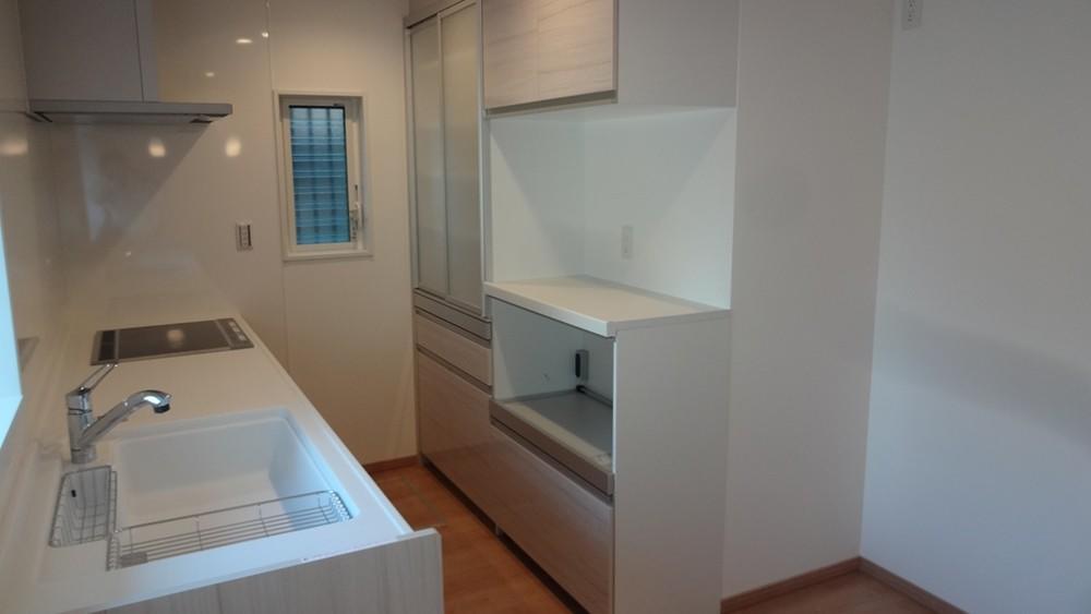 収納は背面にカップボードを設置して確保しました。
