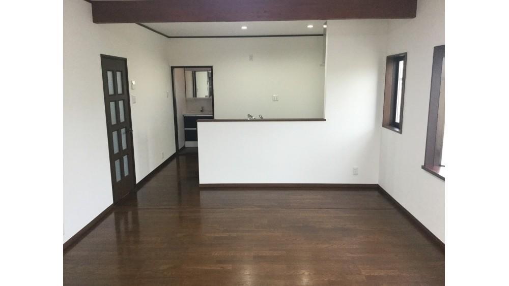 以前はダイニングキッチンとリビングが壁で仕切られており、暗く狭い印象でした。 お施主様の要望としても、 「リビングが狭いので広くしたい、キッチンは対面にしたい!」 という事でした。 壁を取り払い、一部リビングを増築して開放感のあるLDKへと変身しました。