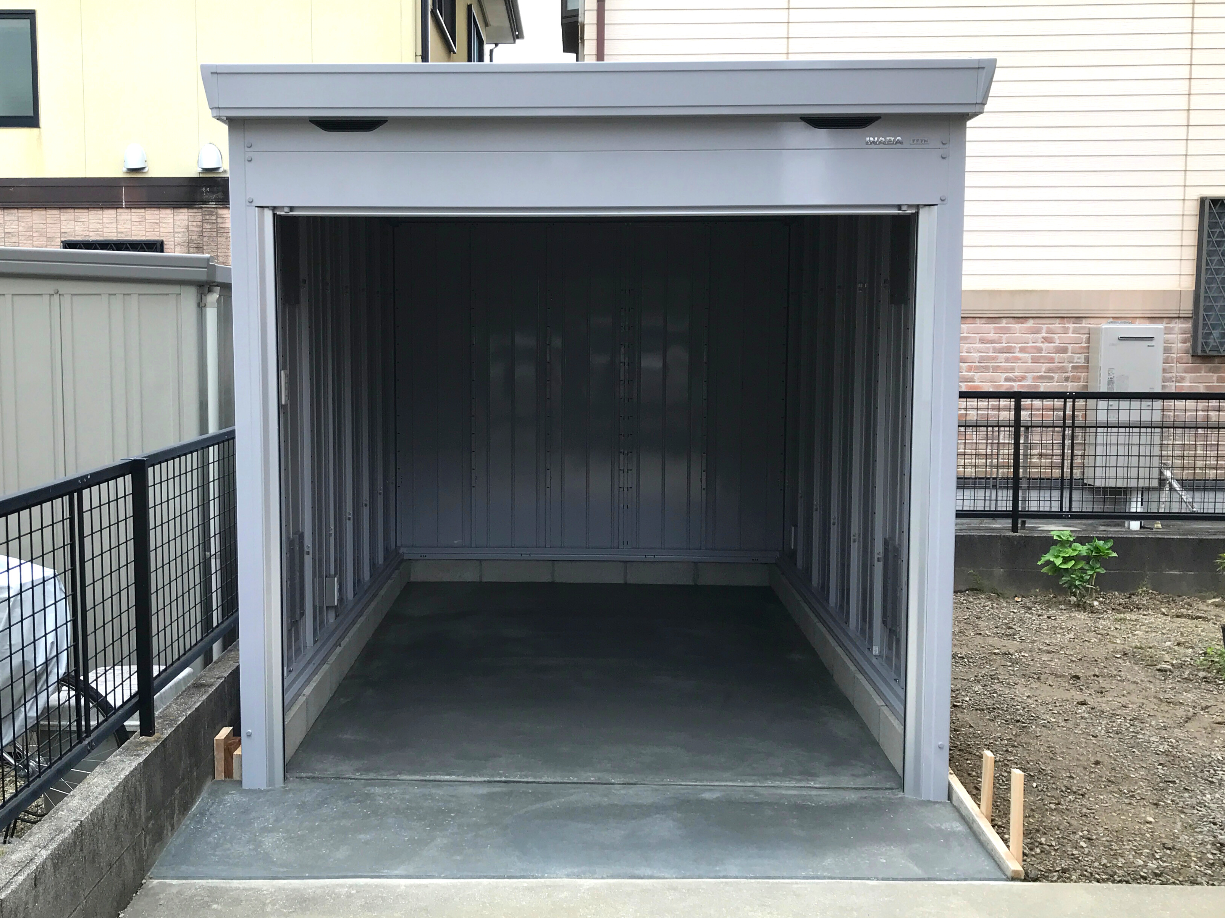 【バイクガレージ工事】 バイク購入のタイミングでバイクガレージを設置しました! 大切なバイクを雨風や盗難から守れることや バイク用品もまとめて収納できる機能面も兼ね備えています!