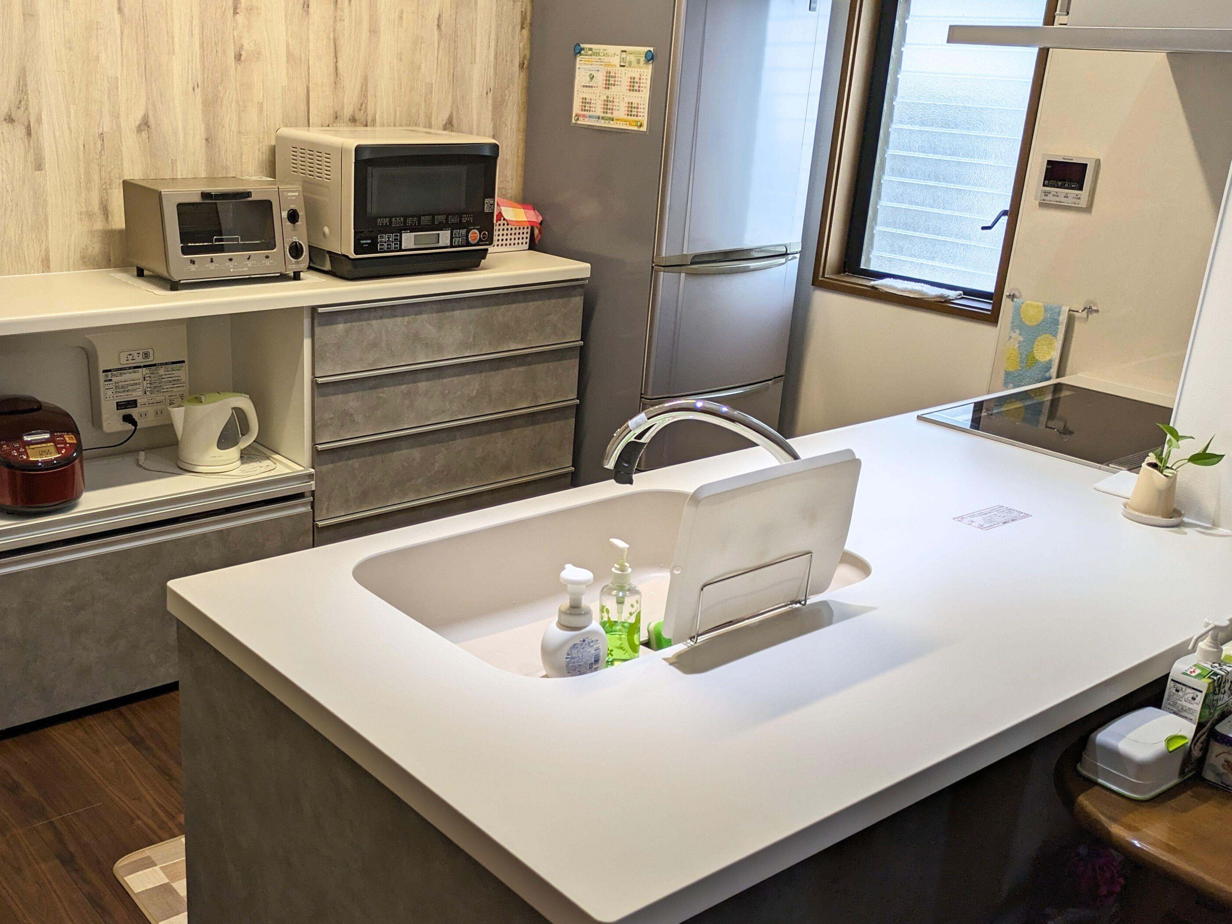 水回りの老朽化に伴い、LDKの内装工事とともにリフォーム! 閉鎖的だったキッチンは、明るく開放的になりました。 対面キッチンは、フラット対面を導入し、ダイニングとの繋がりが大きくUP! 床色+アクセンクロス+キッチンカラーで、奥様こだわりのおしゃれ空間となりました。