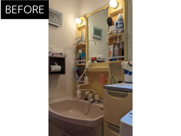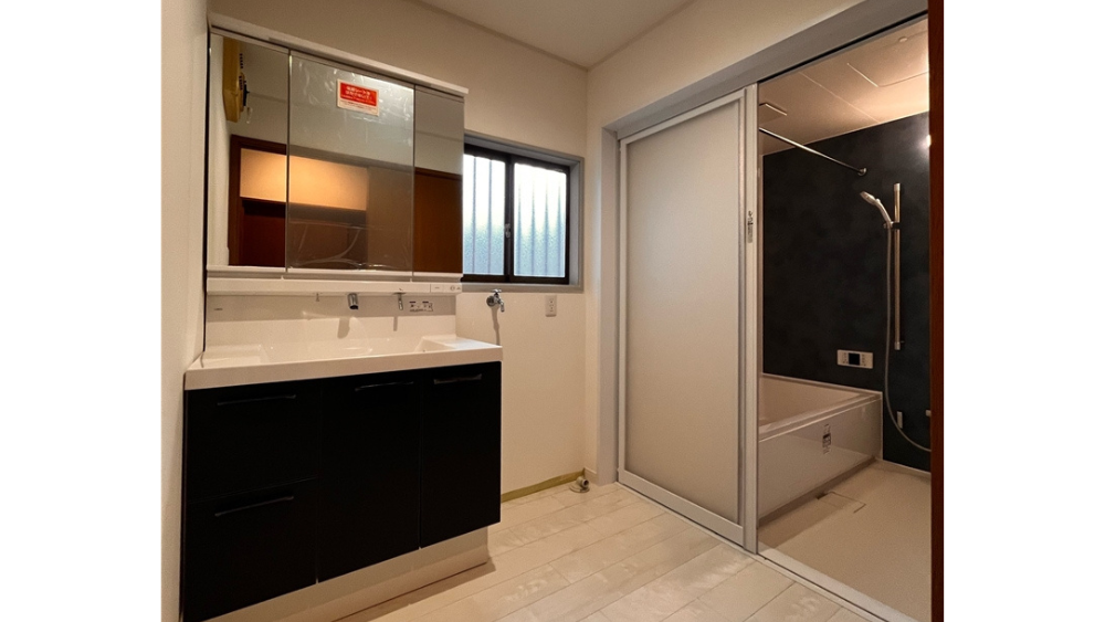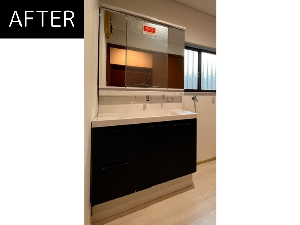 洗面と浴室はモノトーンで統一感のある一室になりました。 従来の物よりサイズUPしたので大きく使いやすさもUP! 収納力も高くきれいに整頓出来るようになりました。