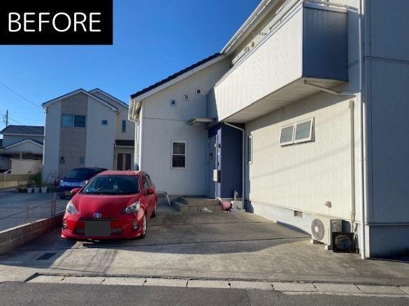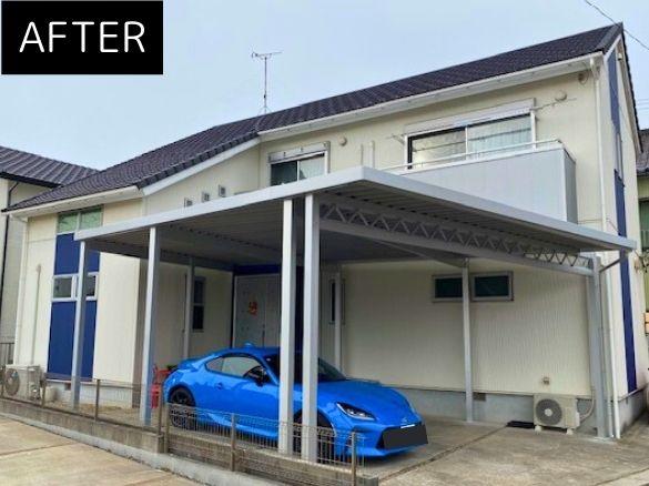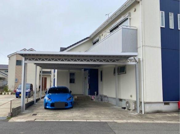 お庭の駐車スペースは常に雨ざらしで玄関まで濡れる日々から解放されました。 お客様の要望により折板カーポートにしました。 家、敷地の形状に合わせ、特注で製作し施工しました。