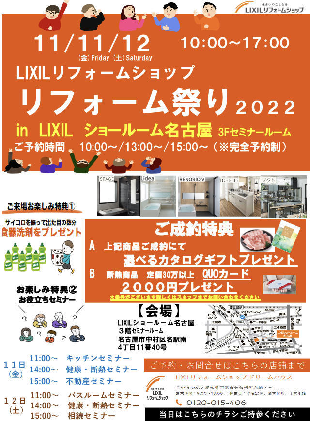 年間1万組以上が来場されるLIXILショールーム名古屋にて、LIXILリフォームショップ リフォーム祭り2022を開催いたします。