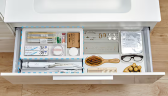 また、収納部分には「スマートトレイ」を導入し、洗面小物をすっきり整理できるようになりました。金属製トレイは熱に強く、ヘアアイロンなども安心して収納可能です。