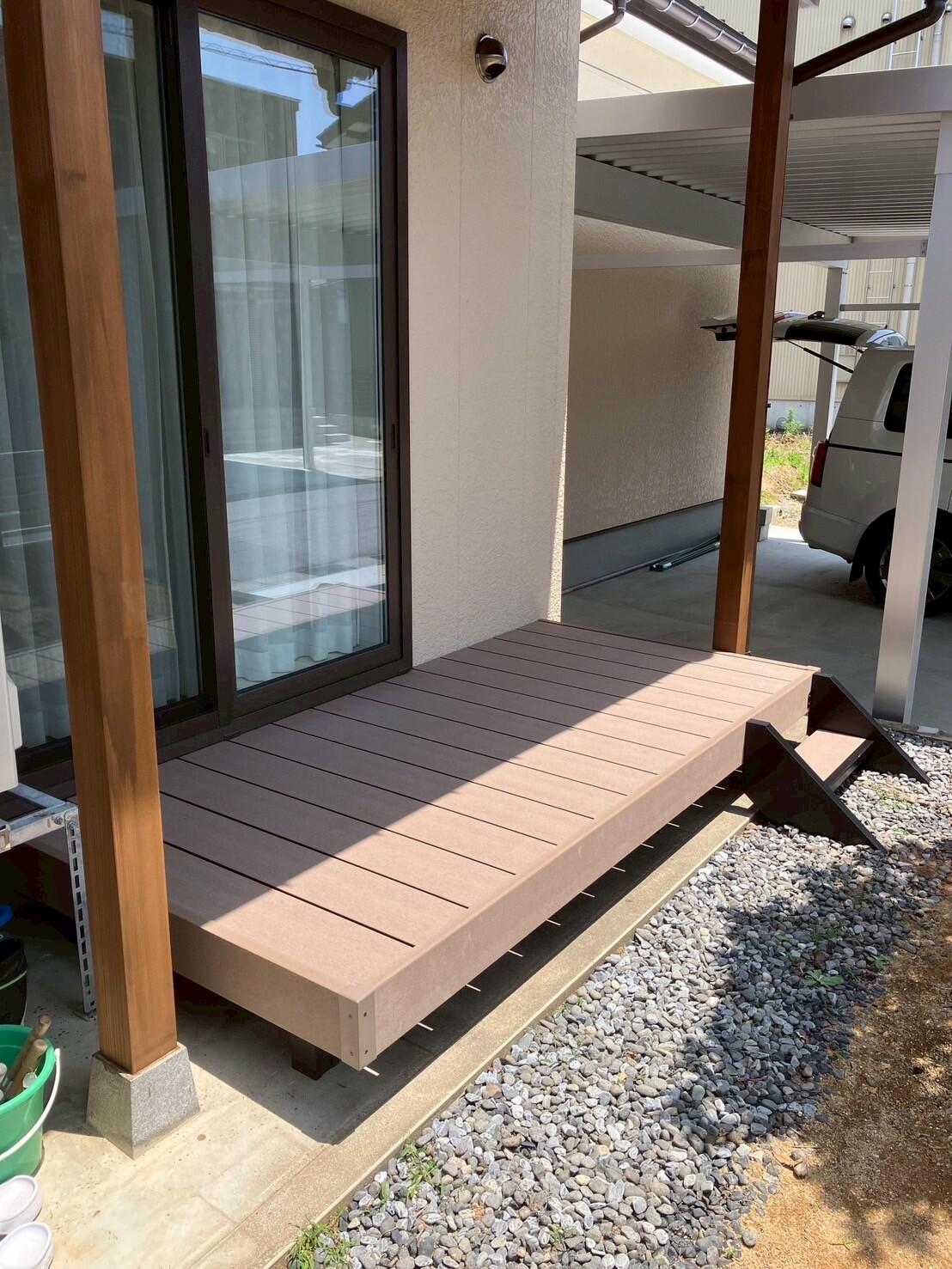そんな想いから、コンクリート敷きだった外まわりに 木のぬくもりを感じるウッドデッキを半日で設置しました。