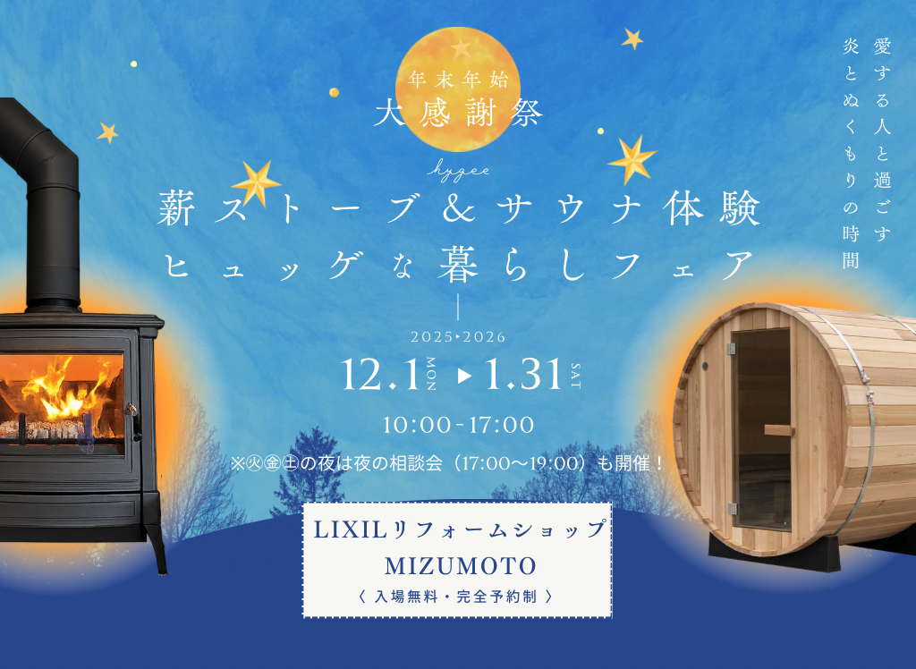 | タイトル | 年末年始大感謝祭|薪ストーブ&サウナ体験 ヒュッゲな暮らしフェア |