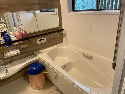 木目調を基調とした暖かみのある浴室に。 鏡前には収納スペースを作成。 浴槽も汚れが付きにくく 全体的にお掃除がしやすいとのことです。