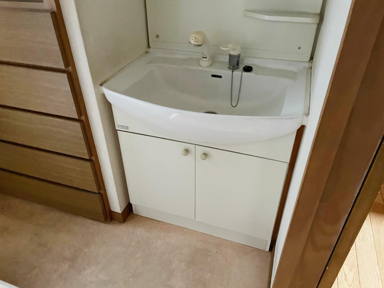 洗面台のリフォームです。 施主様の好きな色である青や緑のタイルを貼ることで、個性とおしゃれをプラス。 洗面台横の収納を取り払い、接地部分を横の壁にすることで窮屈だった洗面スペースを広々使えるようにしました。 光を電球にすることで新しくもレトロ感のある空間に仕上げています。