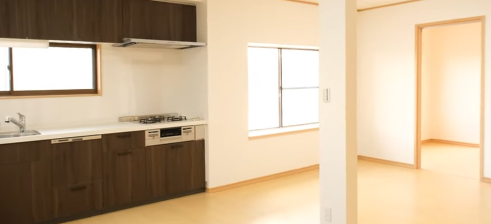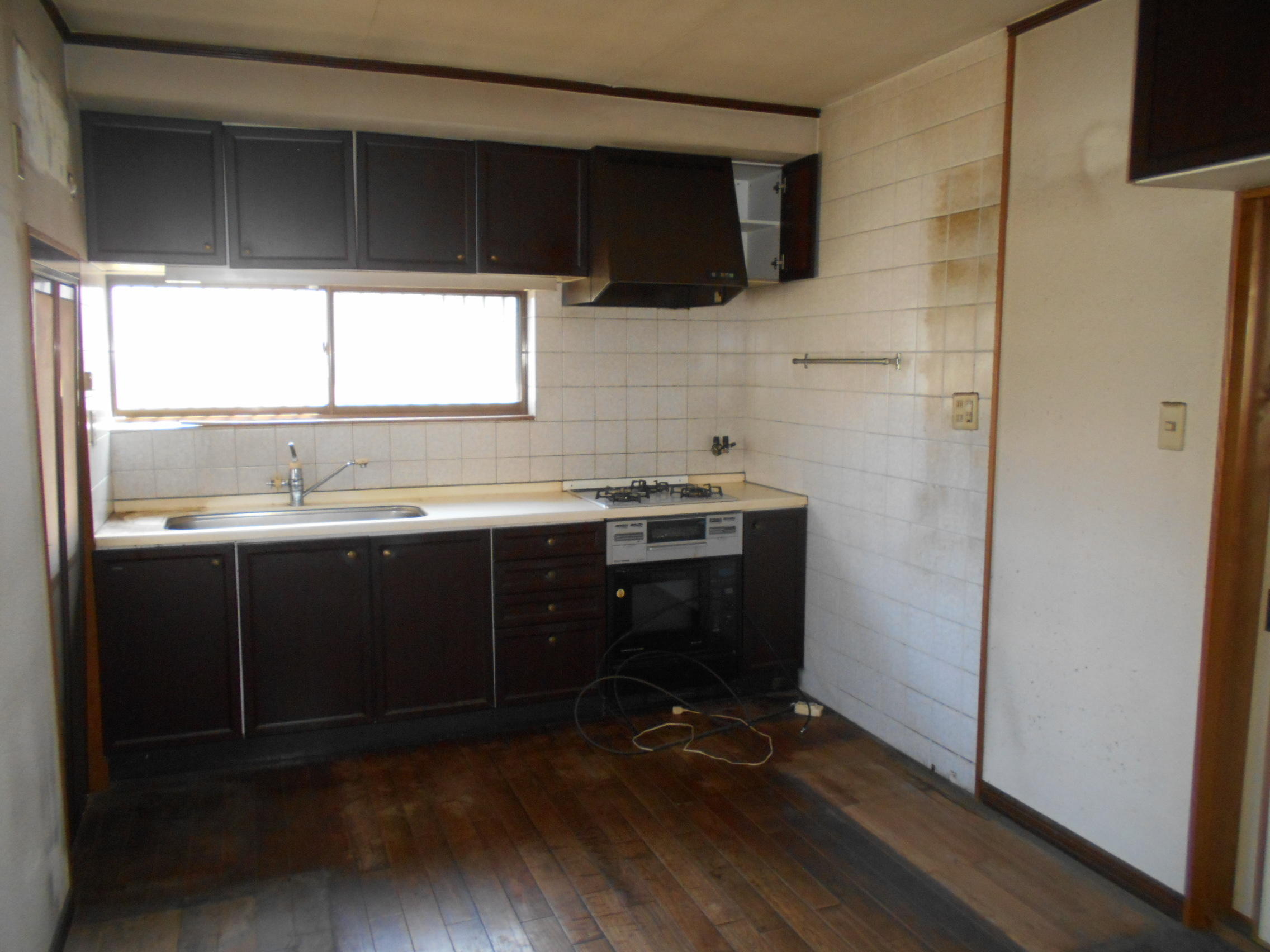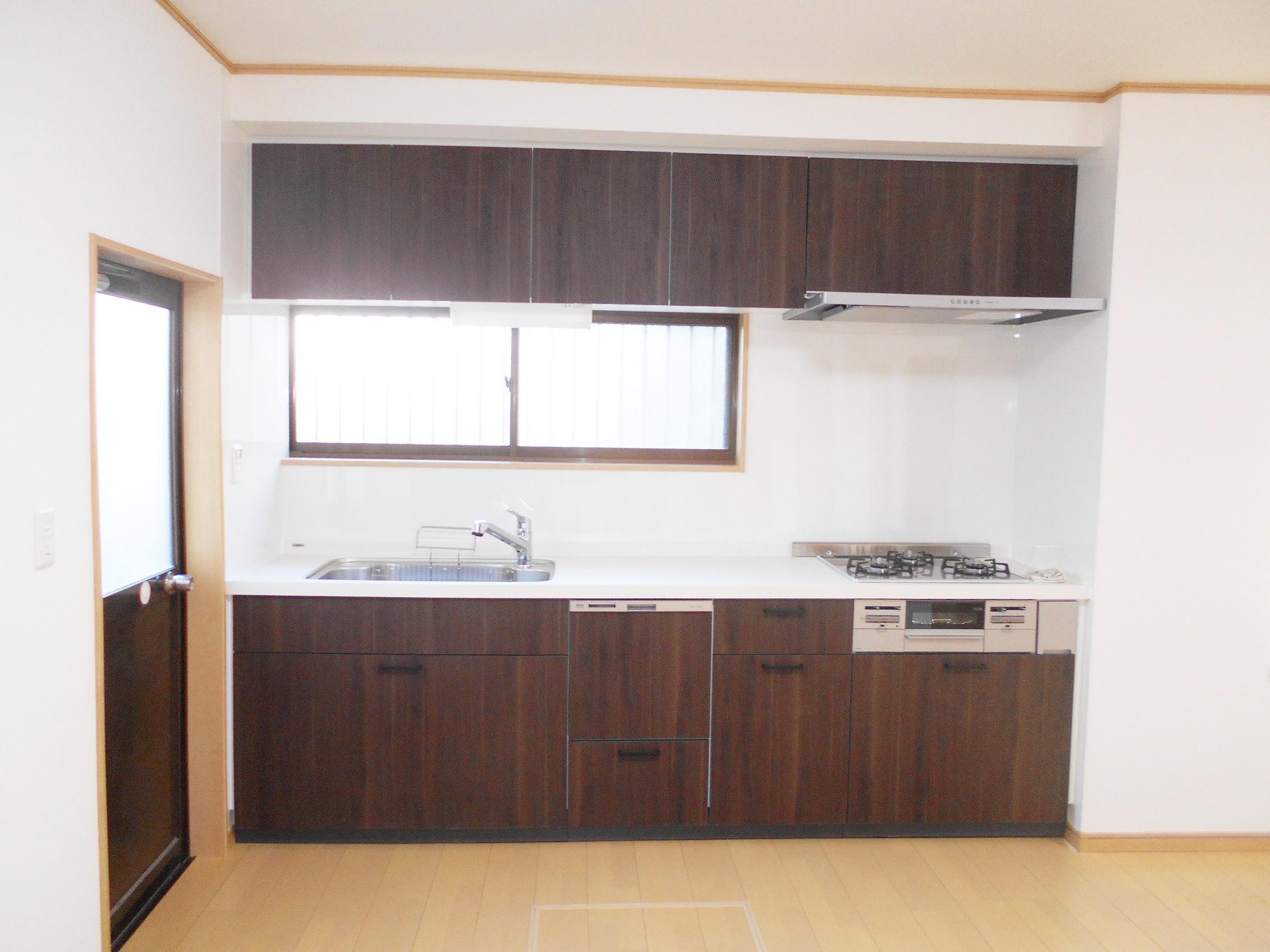 黒のキッチンをおしゃれな茶色の木目調のデザインに。 壁・床を張り替え、閉塞感があったリビングとの仕切りを取り除くことで、動きやすく開放感のある調理場に生まれ変わりました。