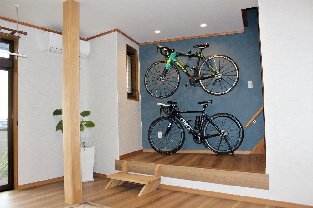趣味のサイクルライフを楽しむお施主様の願いは、リビング階段前の小上がりスペースで叶いました。