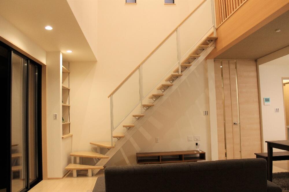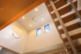 大きな吹抜けとリビング階段が、家族の笑顔をつなぐ空間を創り出します。