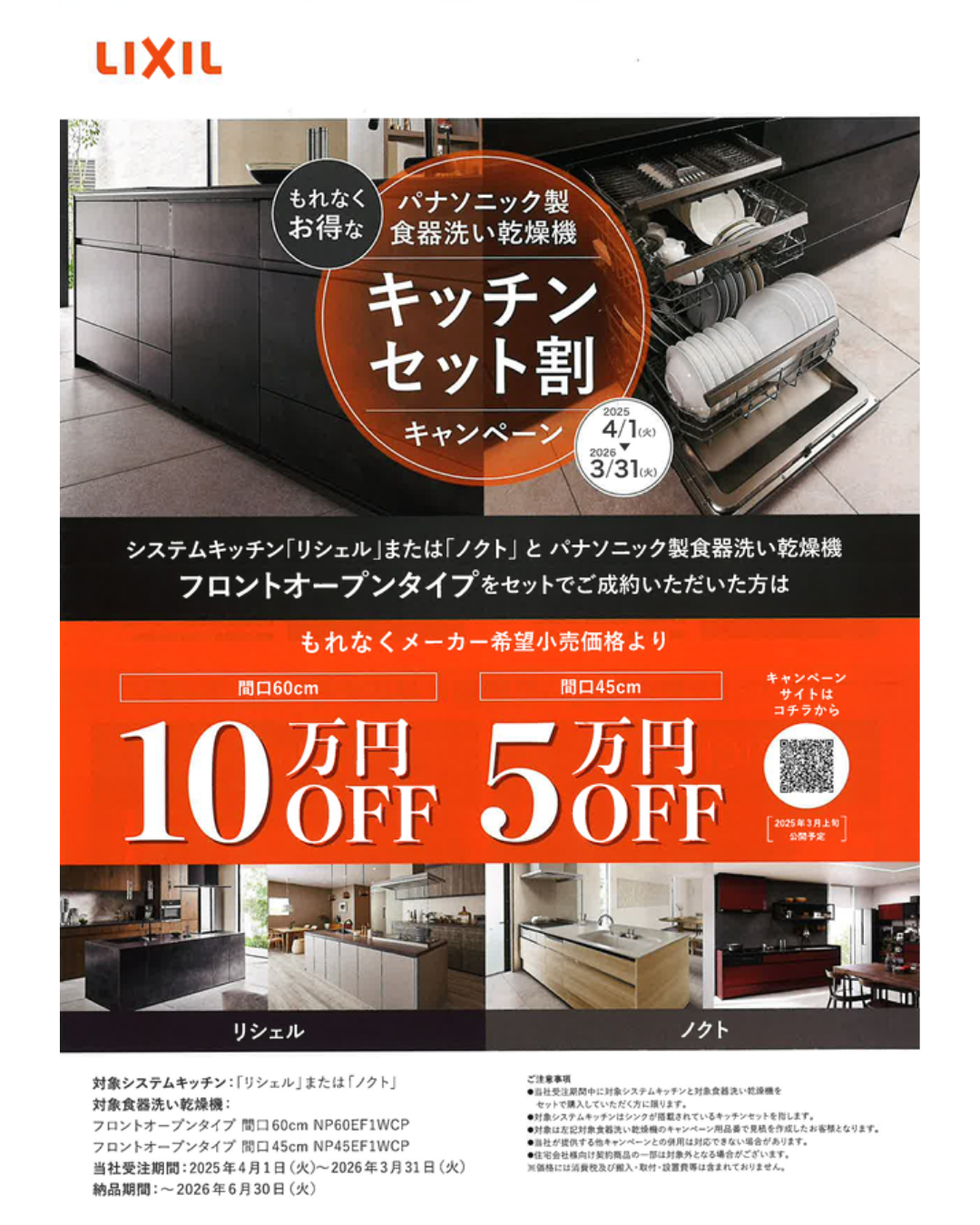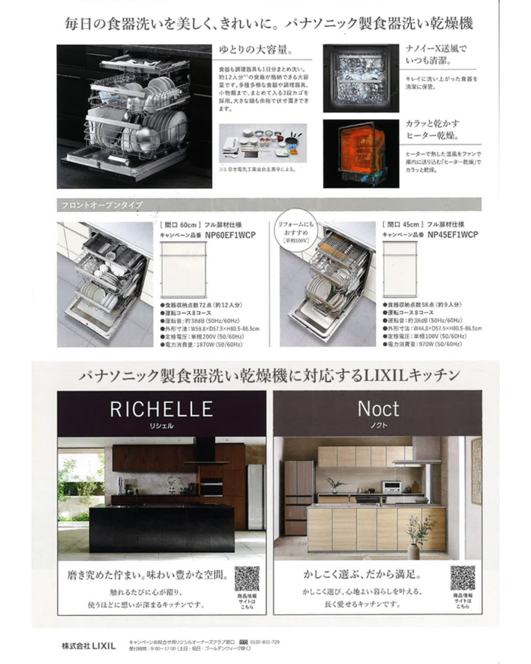 システムキッチン「リシェル」または「ノクト」とパナソニック製食器洗い乾燥機"フロントオープンタイプ"をセットでご成約いただいた方は、