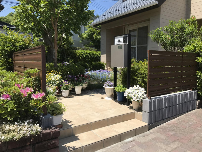 階段部分が劣化し崩れてきているのをきっかけにリフォームを。コンクリート塀を開放的な木目調フェンスにしたことにより全体がスッキリし、色味も優しい色を使用し洋風な雰囲気になり奥様の好きなお花が映え渡る素敵な玄関アプローチが完成いたしました。 ポストはインターホン・表札がついた多機能付きスマートポストにし、住所プレートをきれいに剥がして再利用致しました。