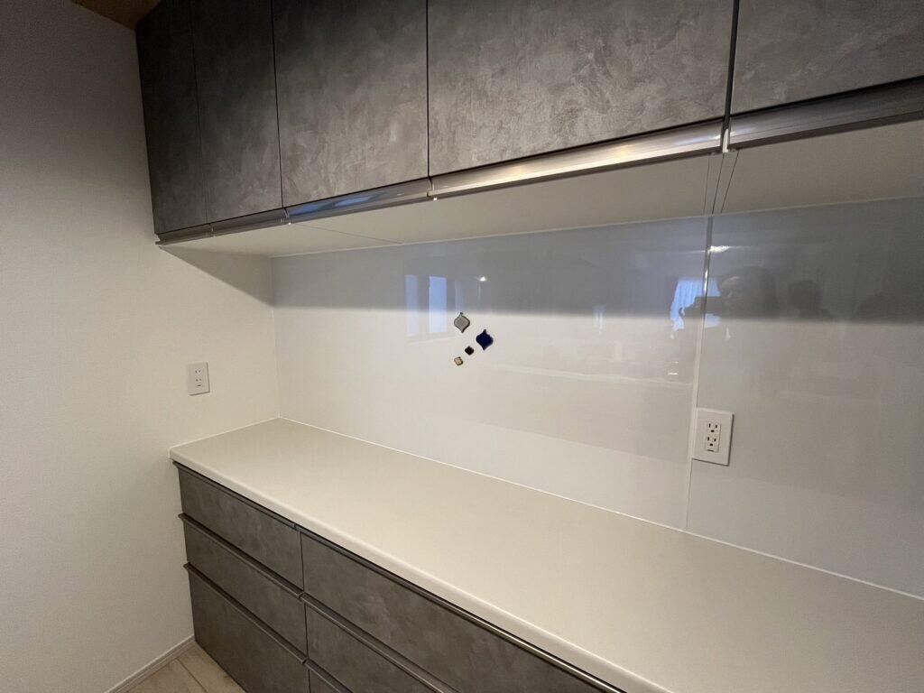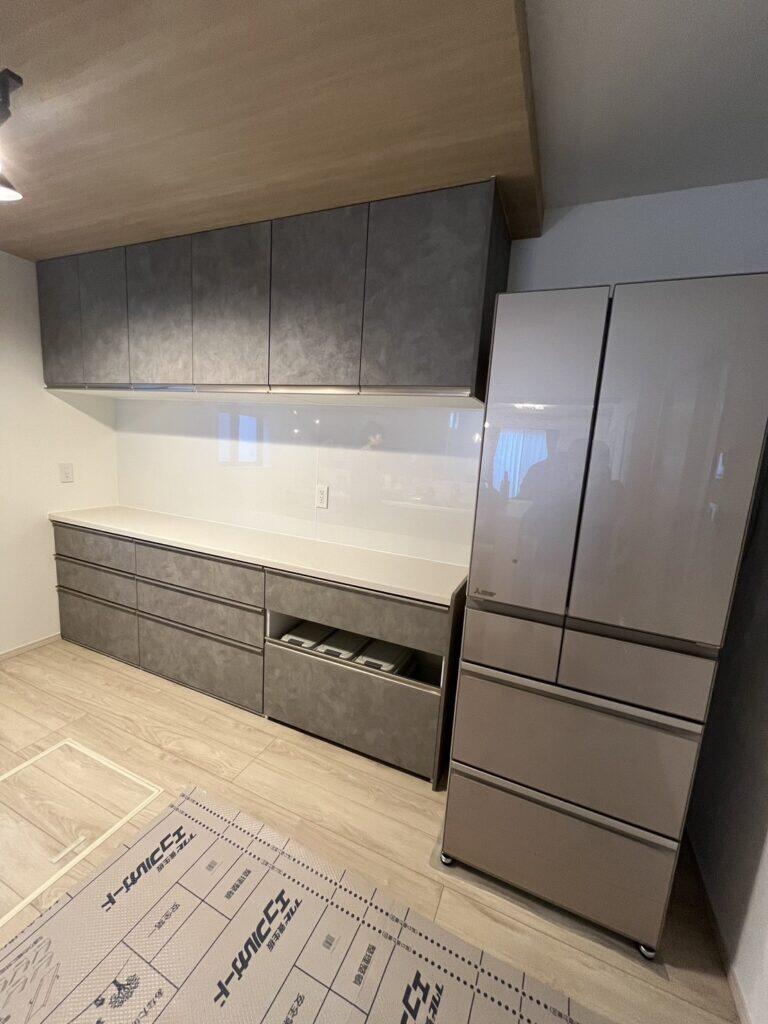 間口2550の幅ピッタリにキッチン収納を設置。 キッチンパネルはマグネットパネルになっており、レシピを貼ったり色んな用途に使えます。 カラーは漆喰をイメージした凹凸があるマットなスタッコシリーズです。ナチュラルな空間に存在感と重厚感を与えてキッチン空間を引き立てます。