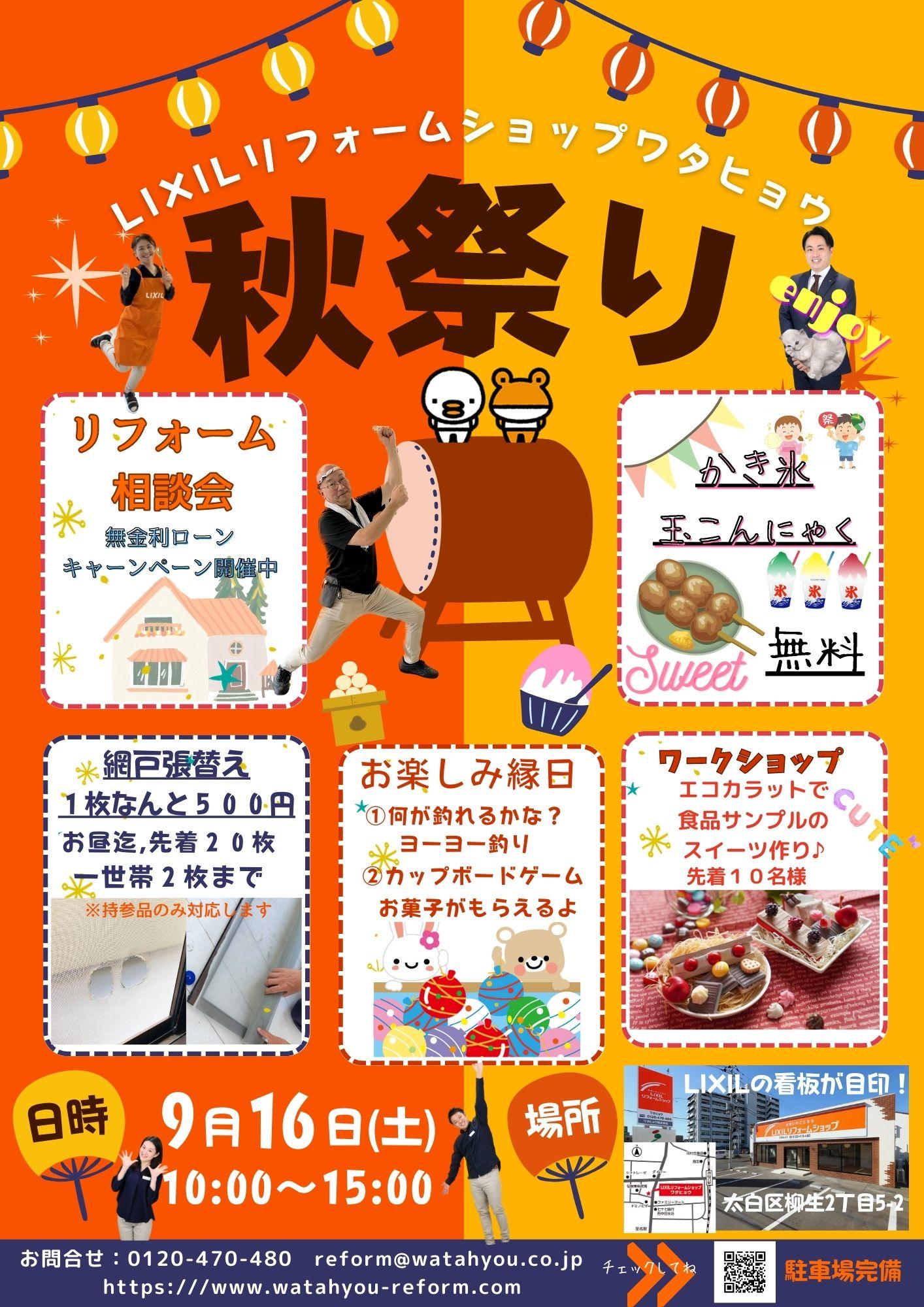ワタヒョウでは「秋祭り」と題しまして9月16(土)に店舗祭りを開催することになりました。
