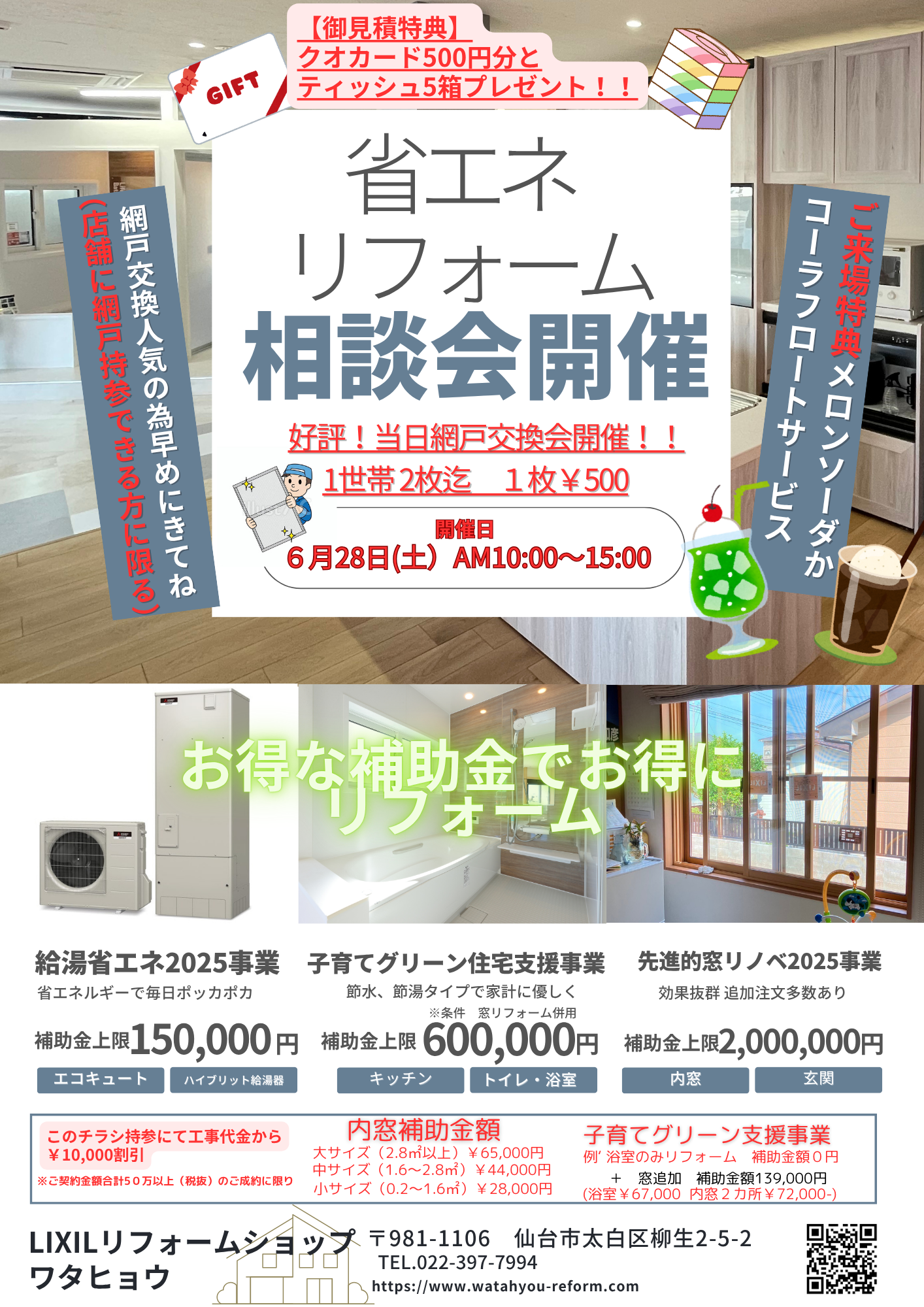 きたる6月28日(土)AM10:00~省エネリフォーム相談会開催します!!