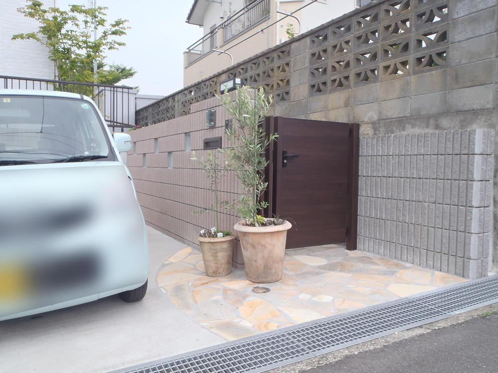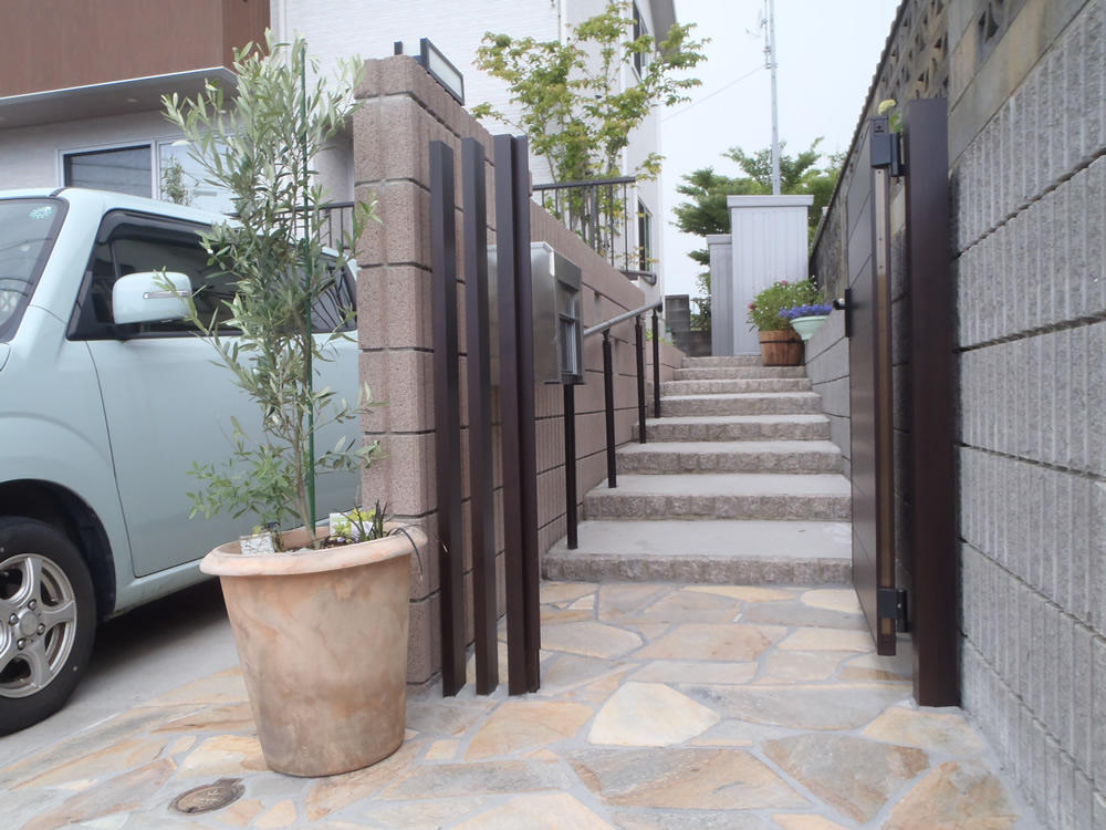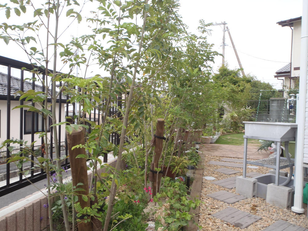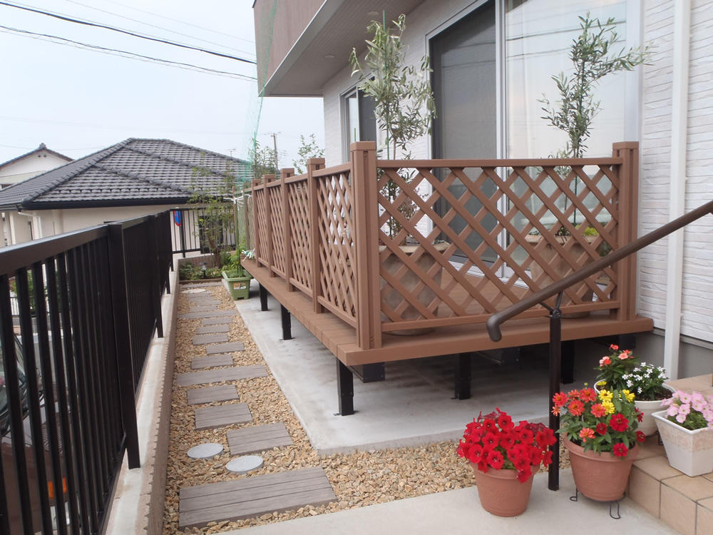 高台のウッドデッキにオリーブの爽やかな風が駆け抜ける…。 既存のアイテムを活かしながら明るい南仏風にイメージチェンジしました。