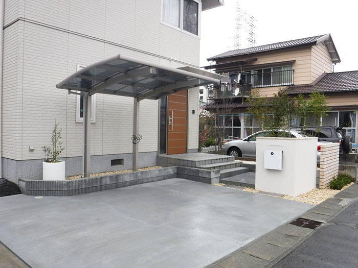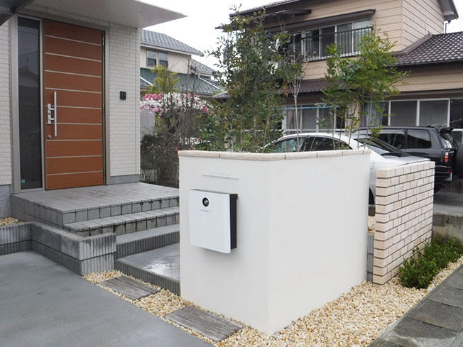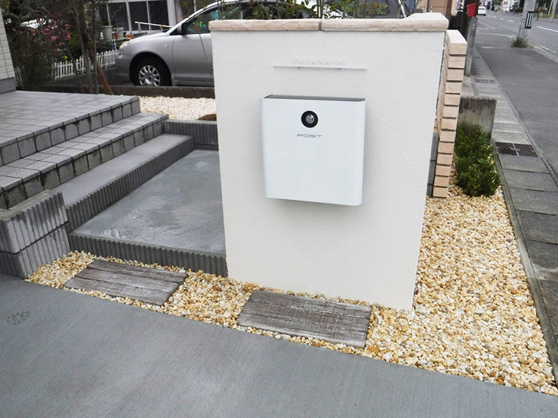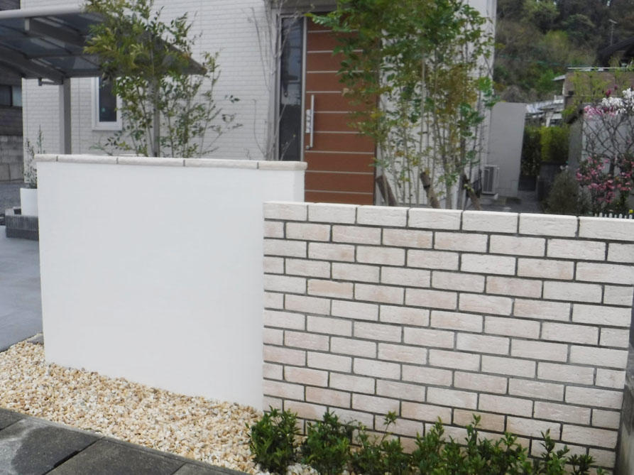 アプローチから建物への導線を美しくリフォームしました。 塗壁とレンガ壁を互い違いにレイアウトして奥行き感を演出しています。 足元には植物を植え、白い壁とのコントラストを楽しめます。